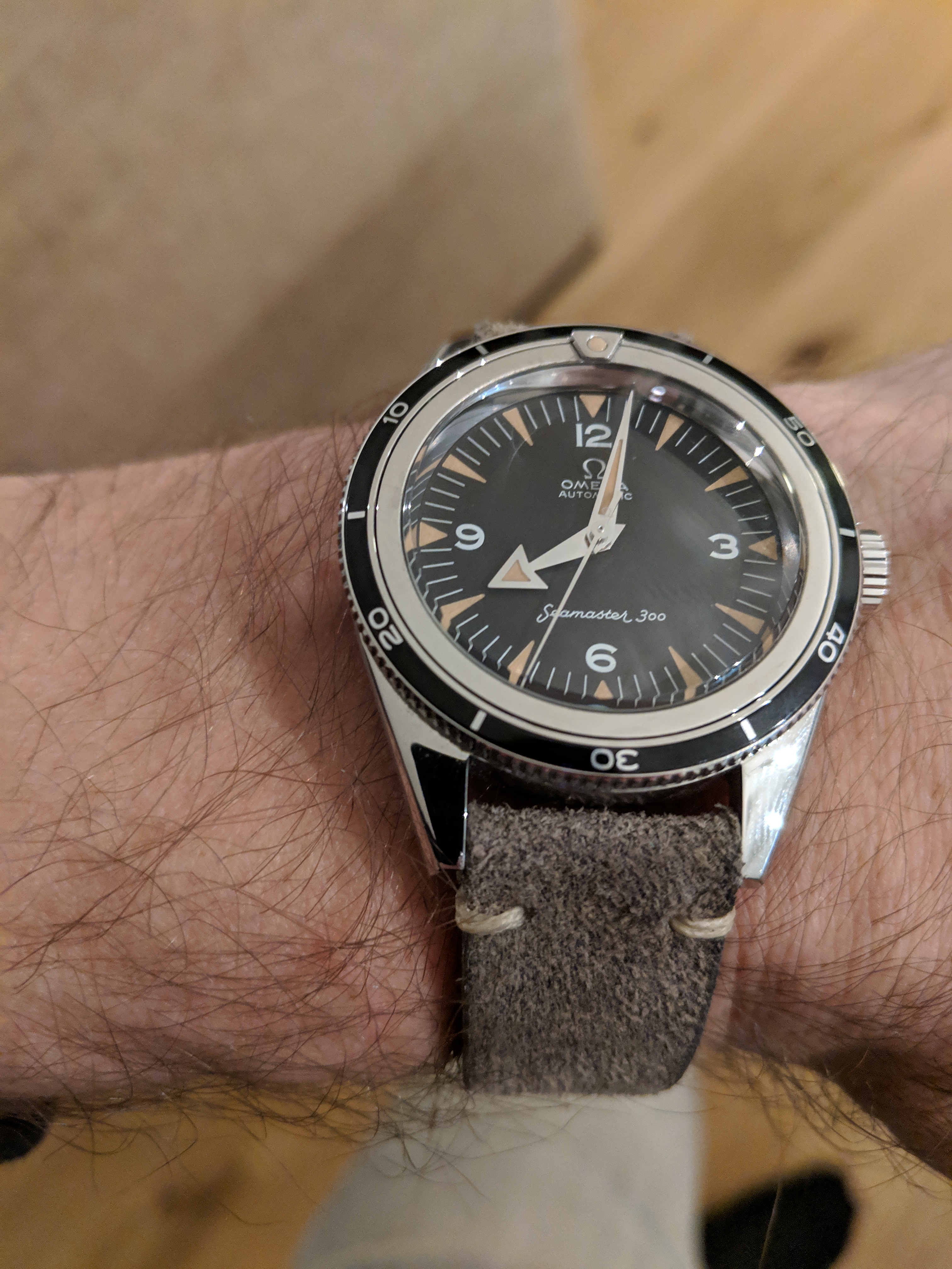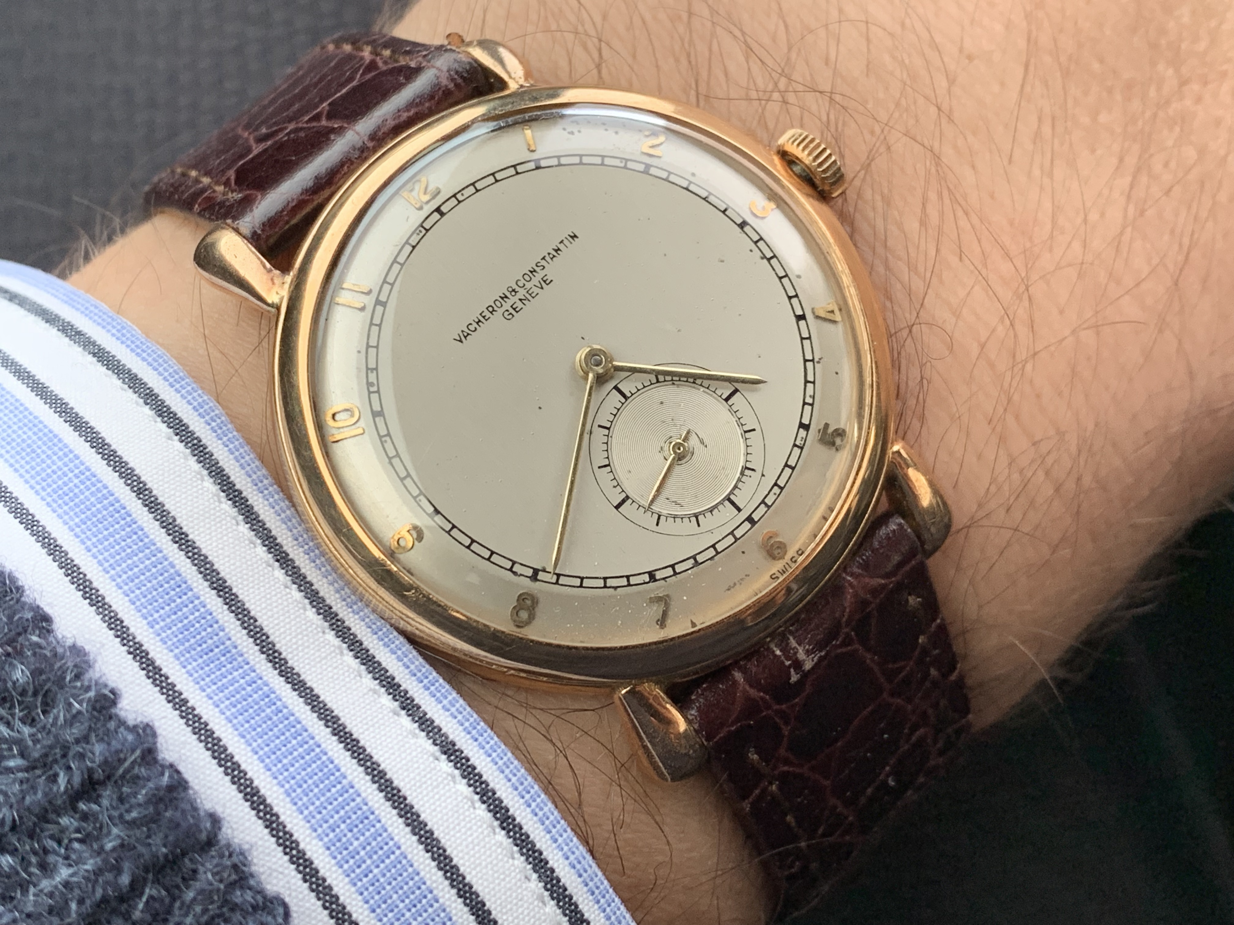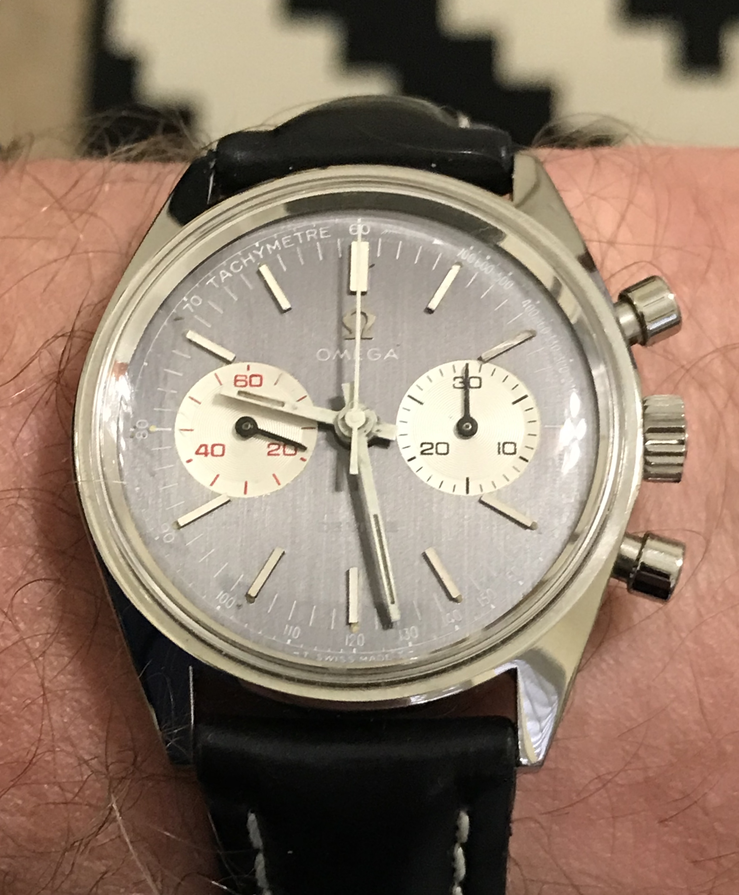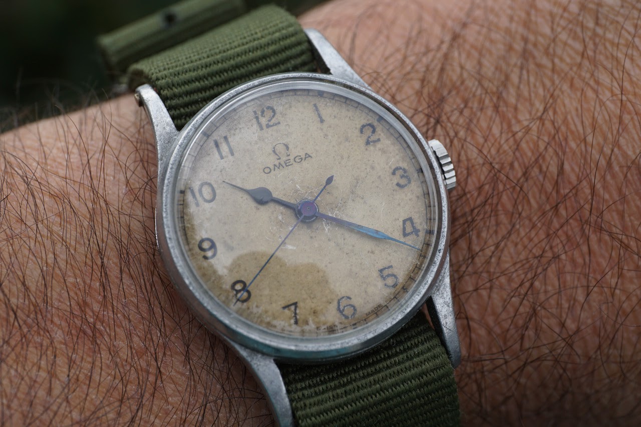 This one surfaced today. Haven’t worn it for a long time. Hardly a grail watch in the eyes of many, but I like it. Early 1950s caliber 352 bumper automatic. The watch you see is not the watch I acquired. It came in a gold filled case that, I am certain, someone had set out to purposely destroy! Beyond salvaging. Dial also sadly deteriorated. Fortunately, the movement had not suffered. I acquired this one via bartering. The previous owner inherited the wreck, and several other watches he wanted fixed. The deal was, I would service three watches, and the basket case Omega became mine. I got into my stash, and found this stainless steel Omega case, and an Omega hour hand, and a better dial. I serviced the watch, fabricated a “dog’s leg” case clamp for it, fitted this dial, and set it up with the steel case. It is an excellent performer, and sweat equity is partly why I like it.