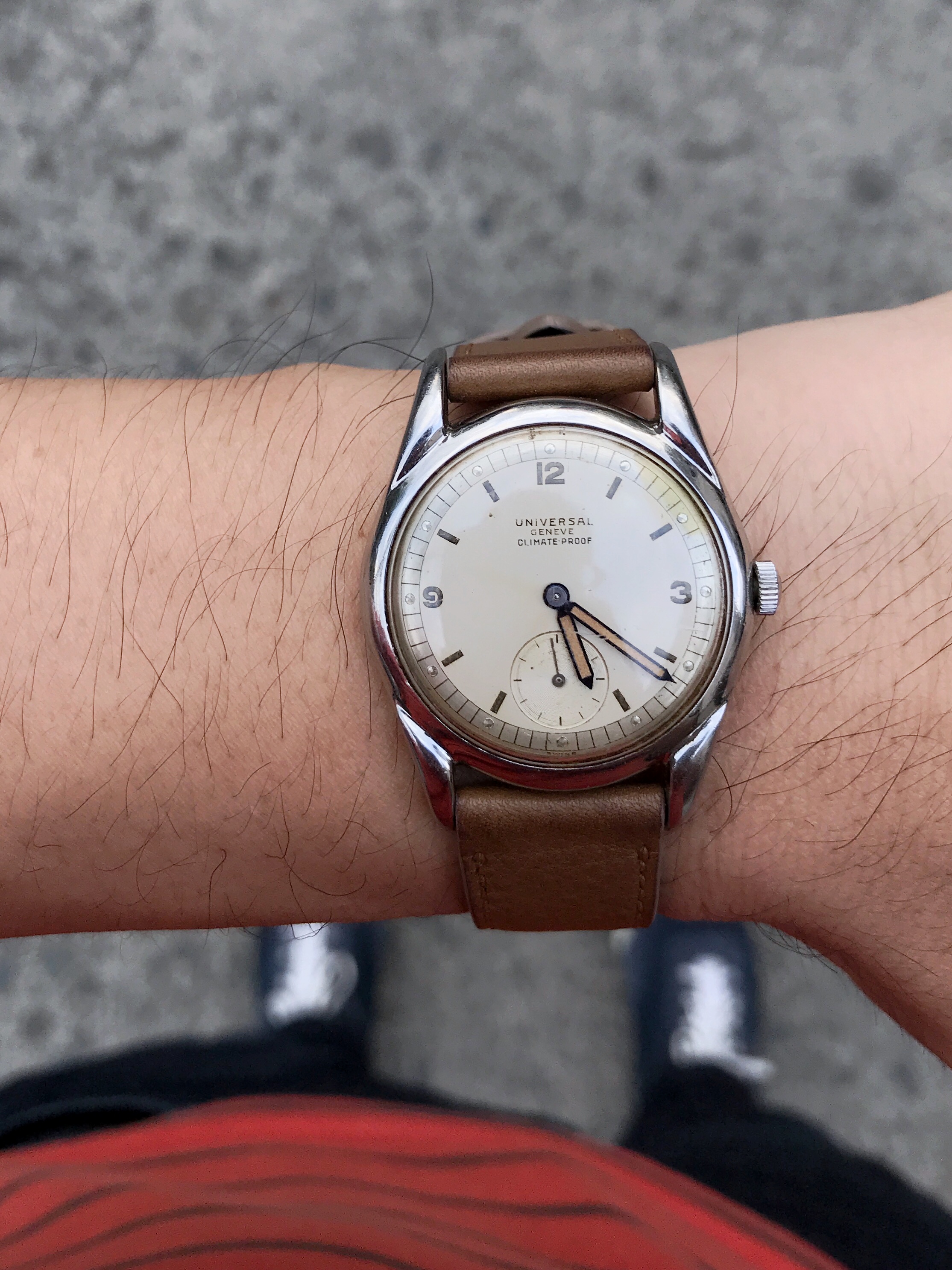 Those beautiful Big Eyes! 1960's Universal Geneve Uni-Compax "Big Eye" Ref. 884100/02 (UG Cal.125) & 1960's Seaboard-Yacht Chronograph - Valjoux 7733, 3rd edition blue dial. Manufactured for & sold by Seaboard Marine Supply Co. out of Islip, NY on Long Island.