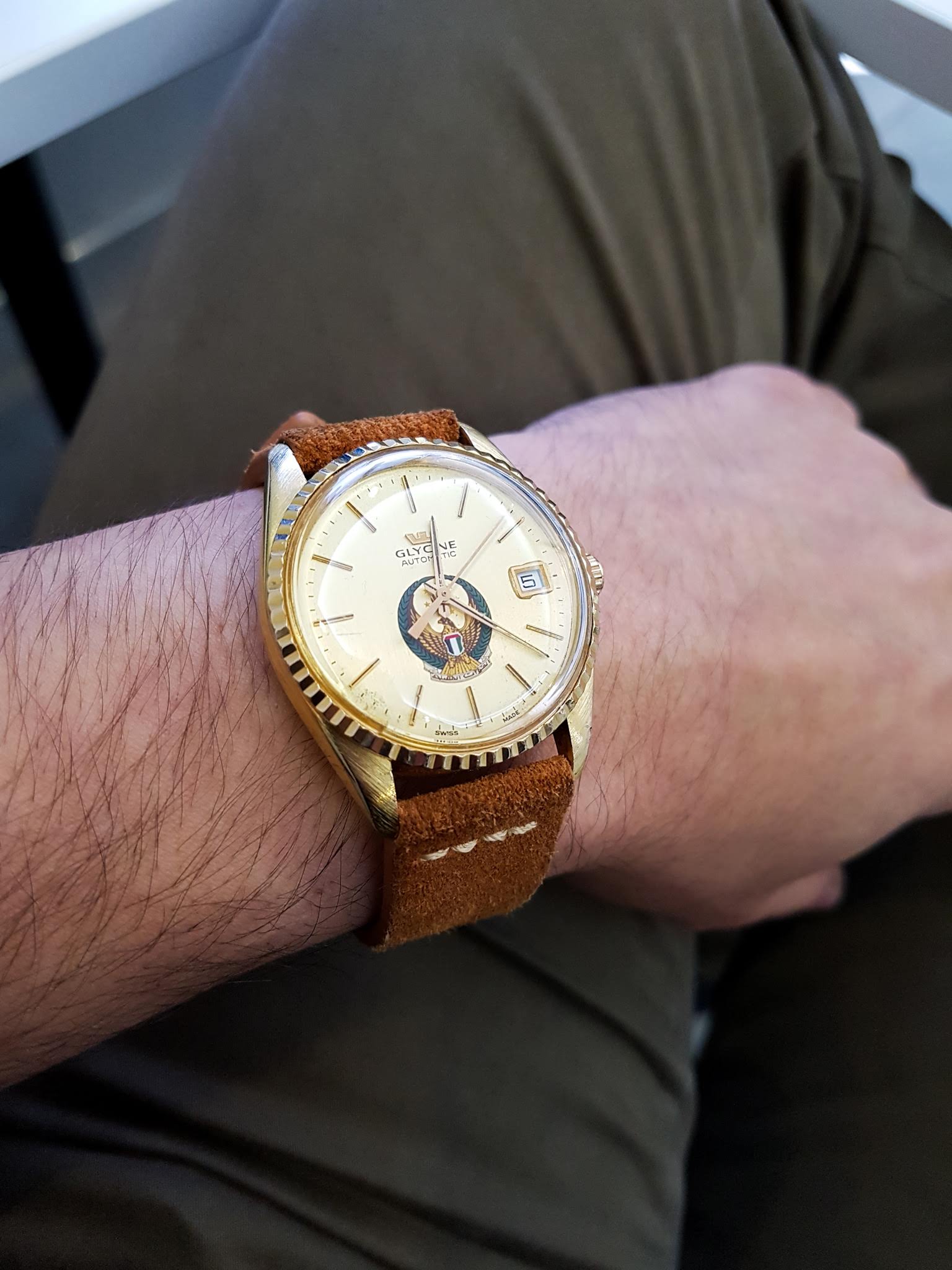 Posts 4,114 Likes 16,324 kov ·Apr 5, 2019 grinny Back to Glycine DJ with suede strap. Wow, does it have any special story? Beautiful watch 👍