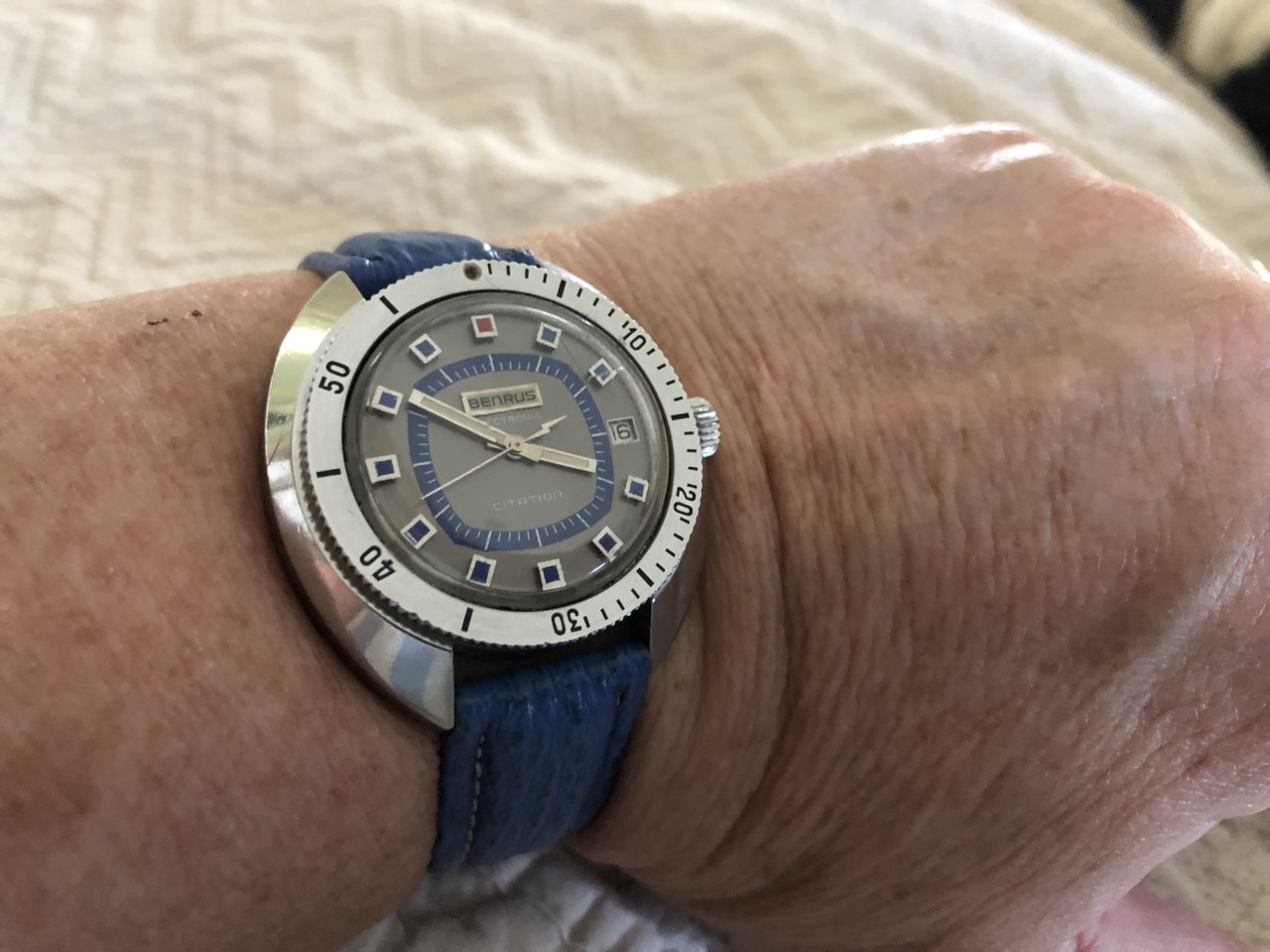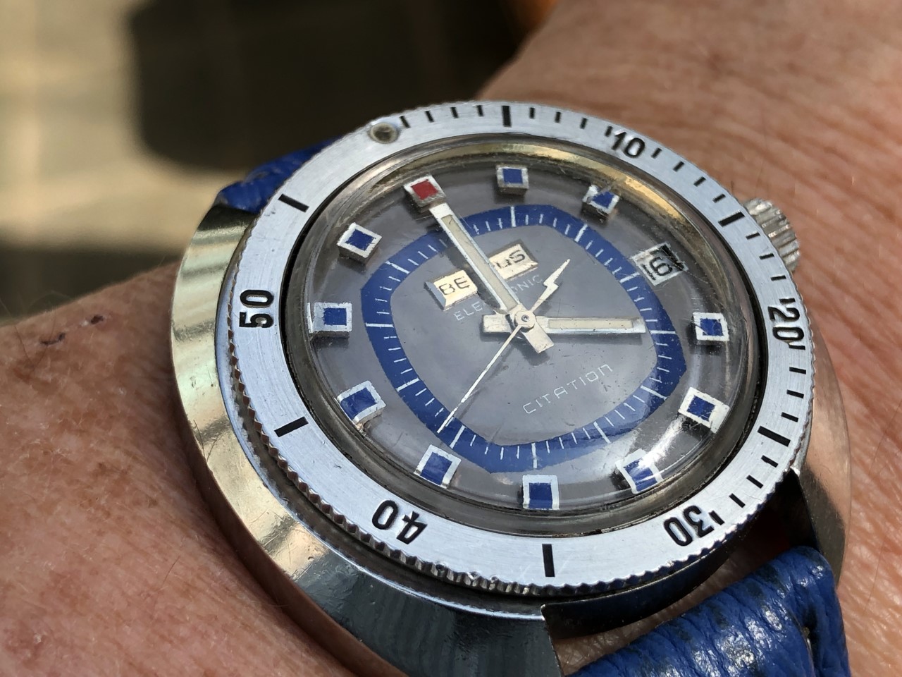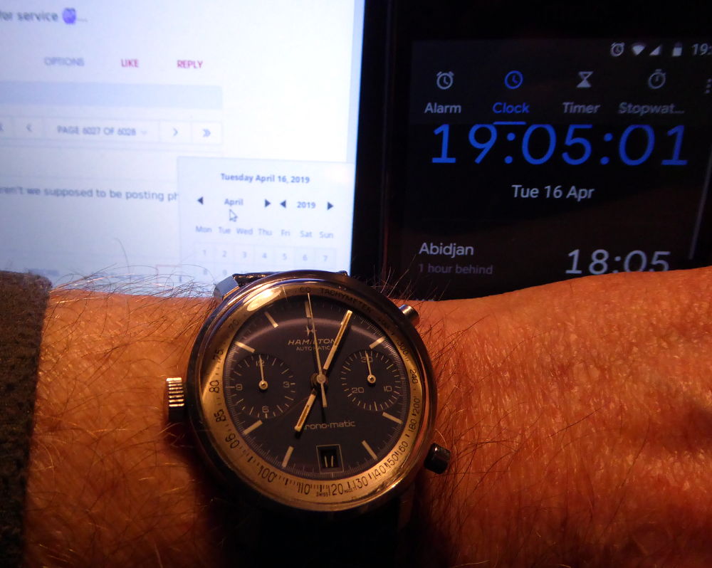 OK, half-lucky day. Normally if it's a day ahead I can correct that by leaving it face up overnight and the date won't advance. Face down and it will. But the demon on the treadmill inside who makes it go round decided to annoy me by changing the date when it's face up this week. Add to that it does not have quickset date and I do not do the +1 hour -2 hours trick on a 50 year old movement that notoriously had problems when brand new.