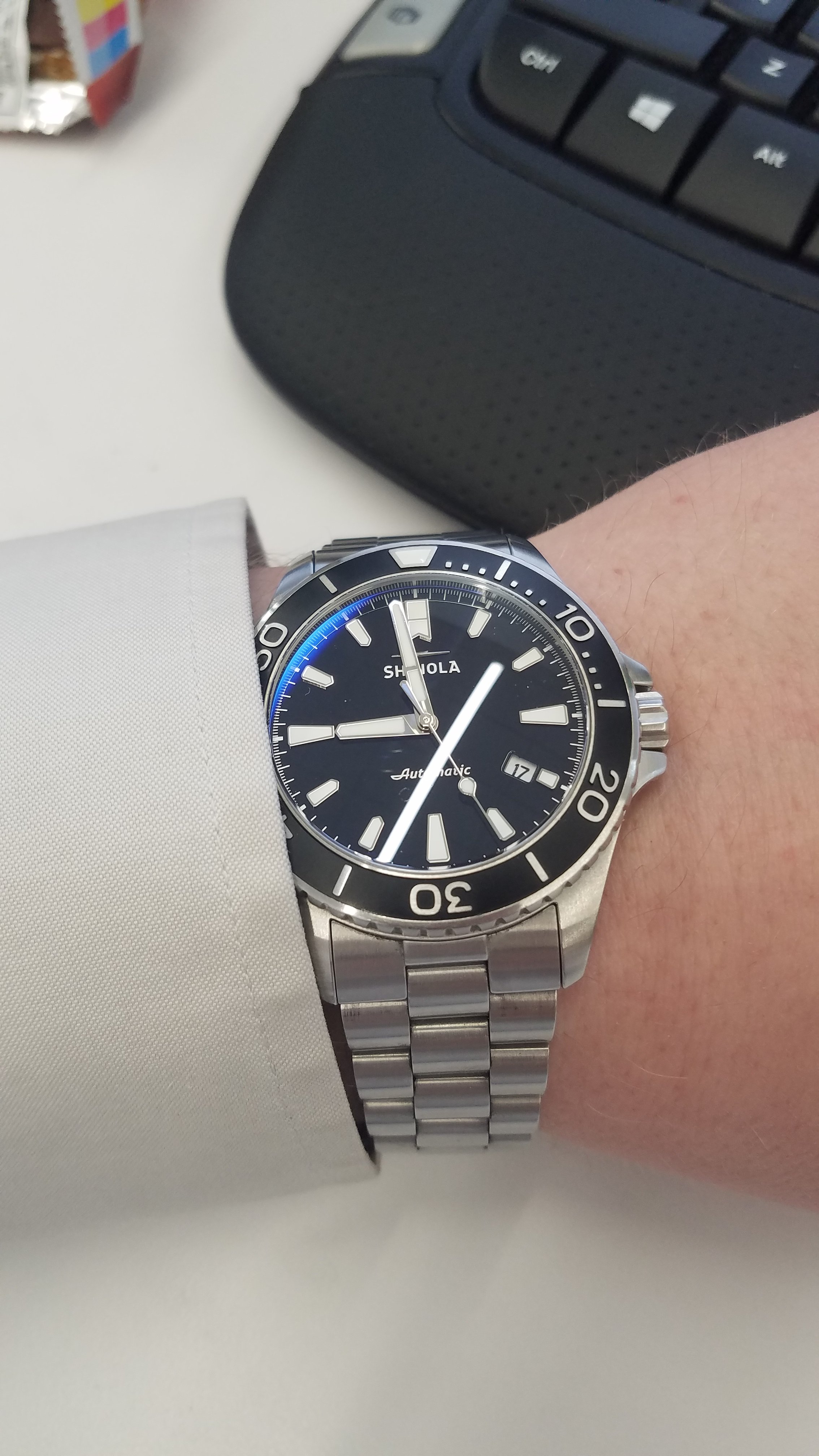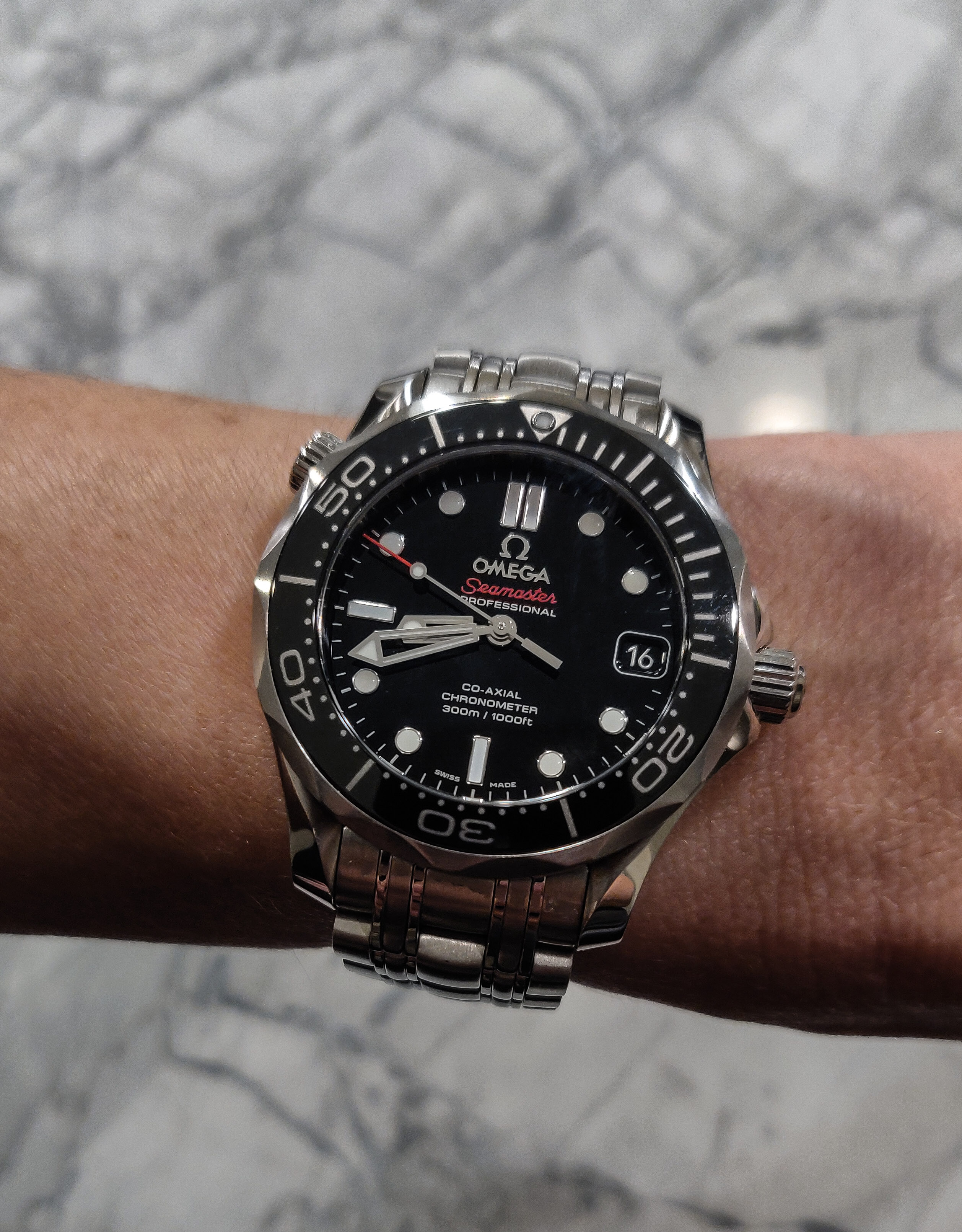 I got my wife her first dive watch yesterday. No. Like the majority of Seamaster wearers, she does not dive but what the heck. She has the tiniest wrist and I had to take out all the removable links but I still think the 36mm Seamaster looks great on her. She preferred the black over the blue and I agree with her.