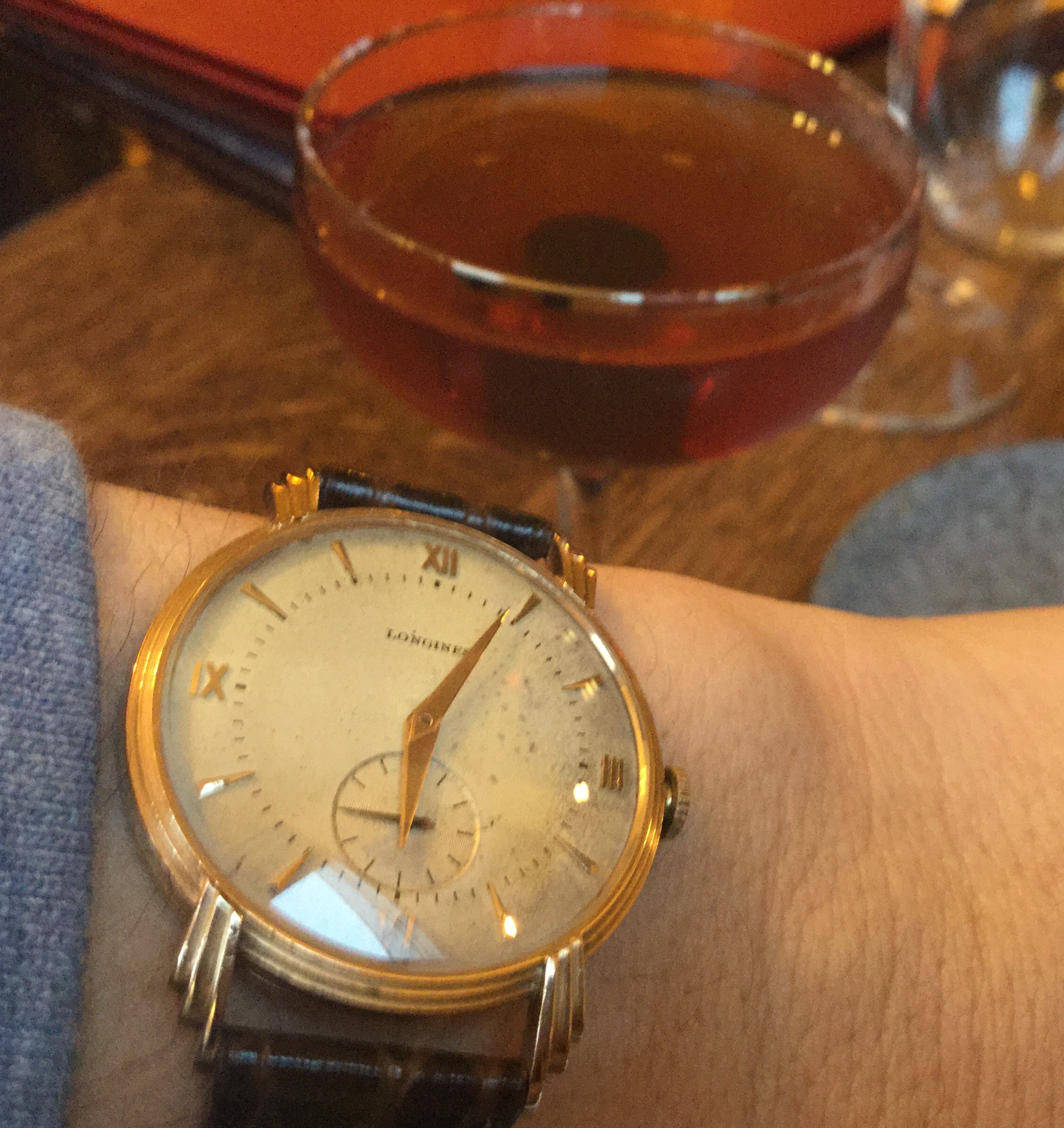 I'm the second owner, the first having been gifted this on the last day of May 1967 by his grandmother. Shortly before heading to flight school and then off to Vietnam (he kept the watch home while he was off to war). The 14k gold has patina'ed to an almost rose gold colour, showing its rich history.