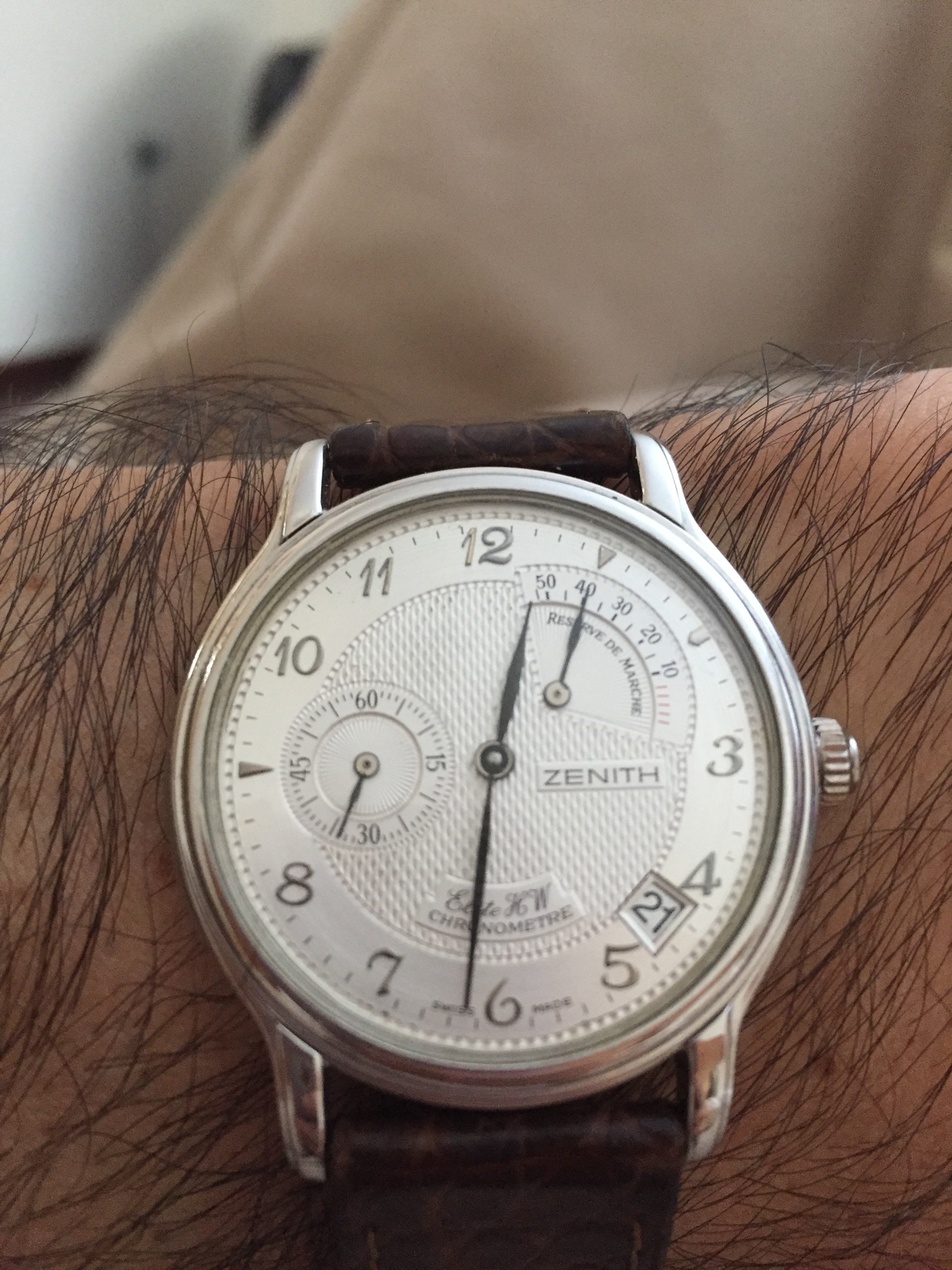 Zenith Elite HW platinum , I got it 2 weeks ago and still on my wrist. Needs to go service for oiling that鈥檚 why I enjoy it every day until the watchmaker keeps it for a while