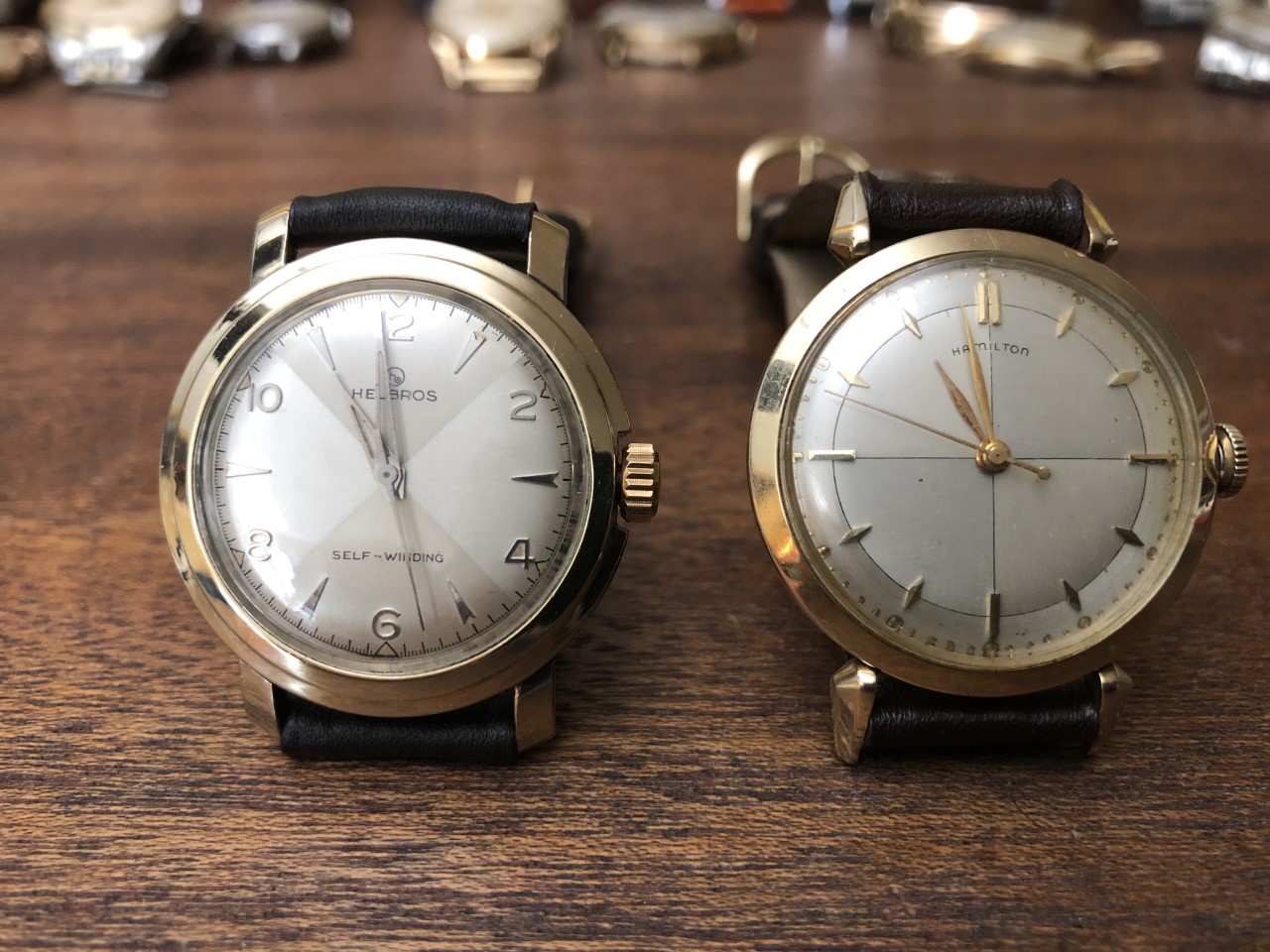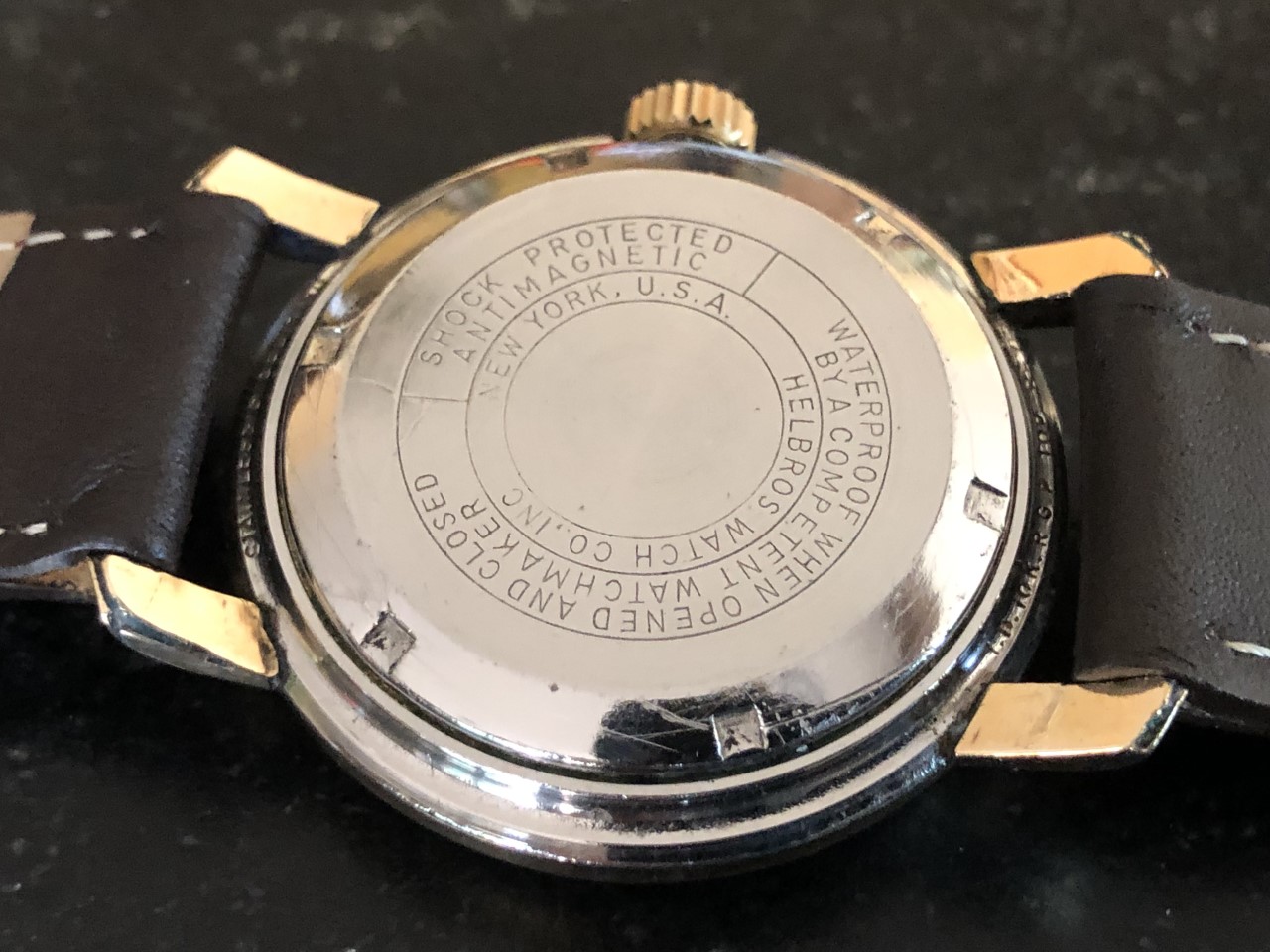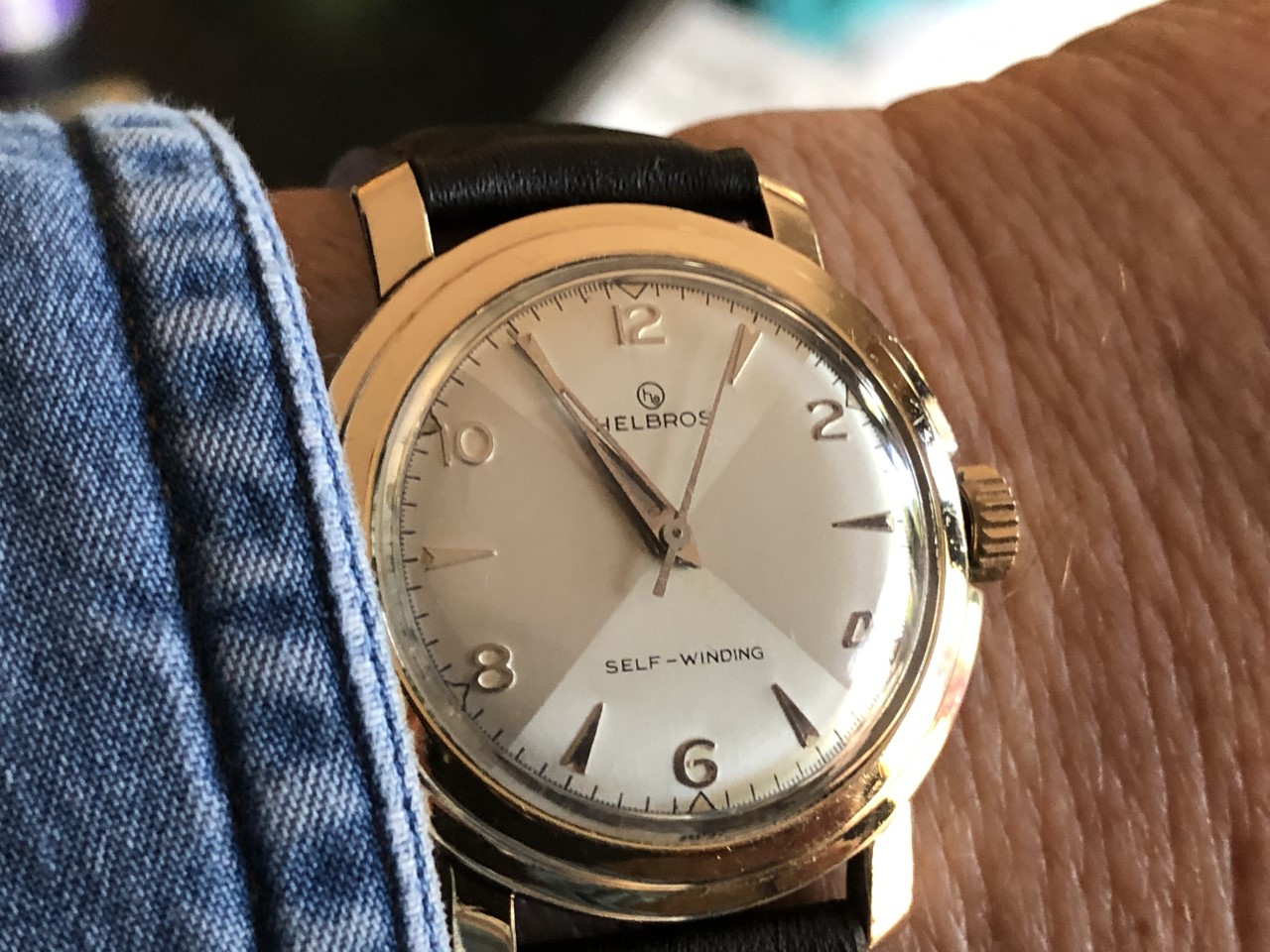 Posts 1,957 Likes 25,748 allwoundup ·Apr 24, 2019 Going with this mid-1950s Helbros self-winding today....a kindred spirit to other two-tone sector dial watches of the period like the Hamilton "Rodney".