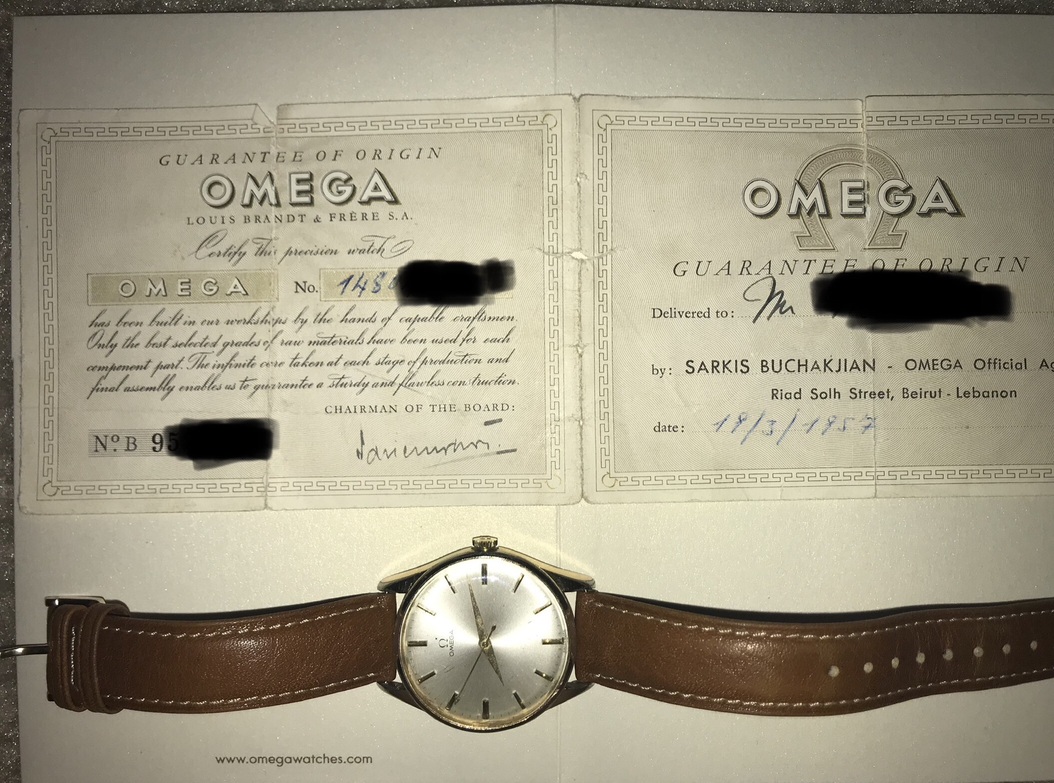 I Posts 171 Likes 1,470 IRCM ·May 13, 2019 Not a good photo, but these are the original papers to go with my father’s watch. He bought this in Beirut in 1957. Waiting for Omega to send an extract from archives