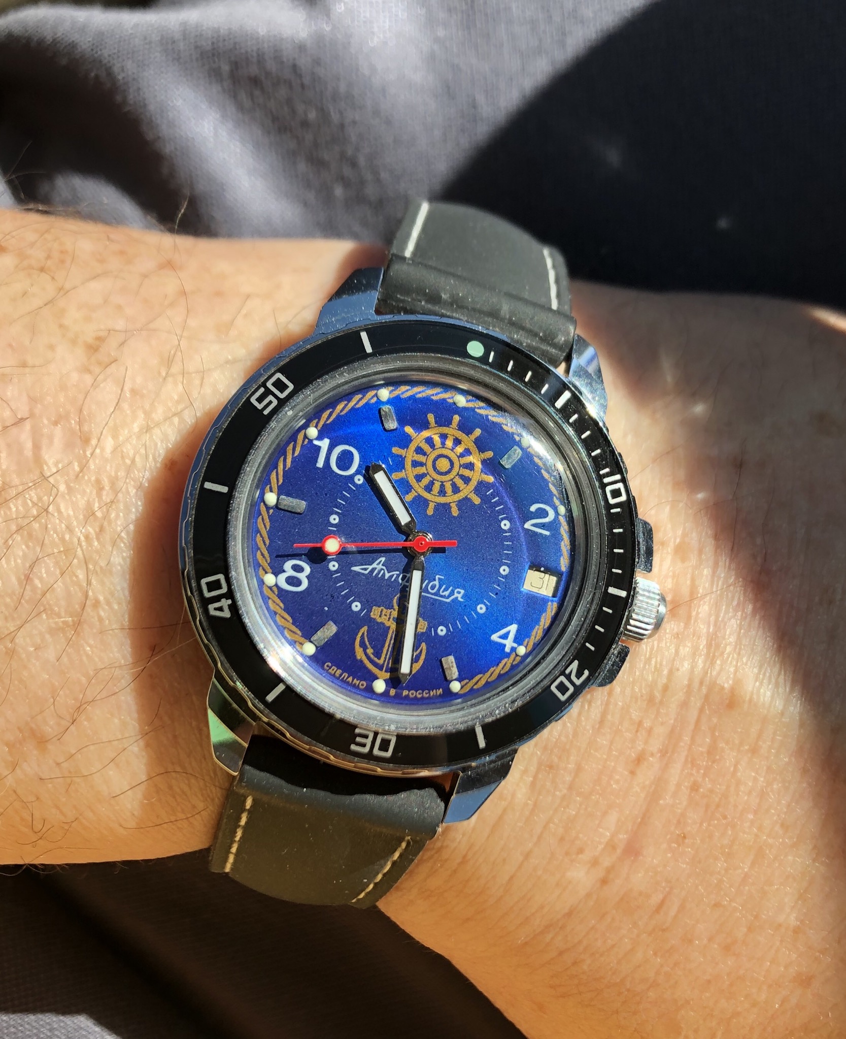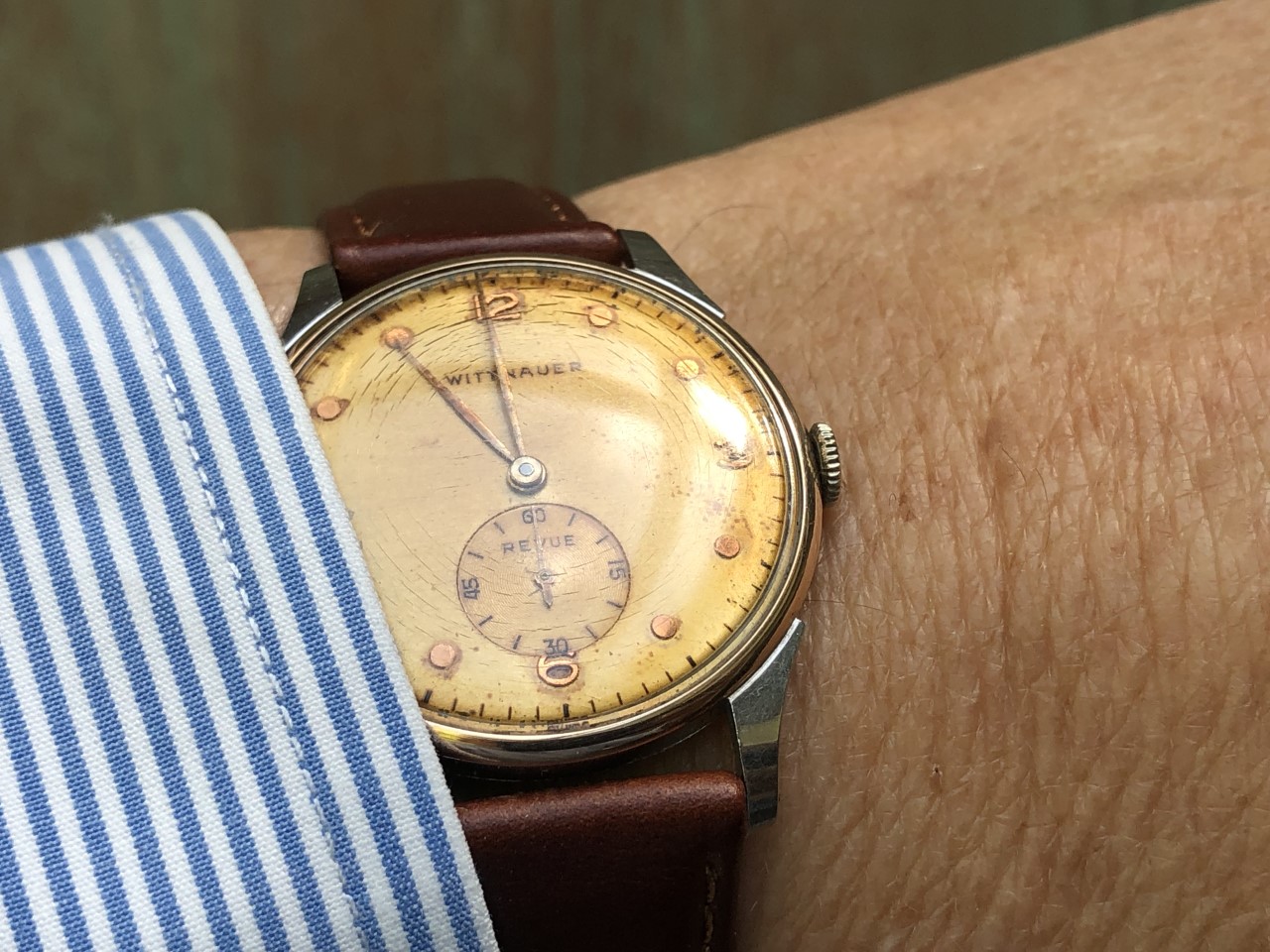 Wittnauer Wednesday.....Revue Thommen motor....I'll get around to replacing the crystal someday, but the gold tint it gives to the dial somehow works with the stainless case, and rose gold bezel, hour markers and hands....34mm diameter, 41mm lug-to-lug and 7.5mm thin case back to the top of the crown.