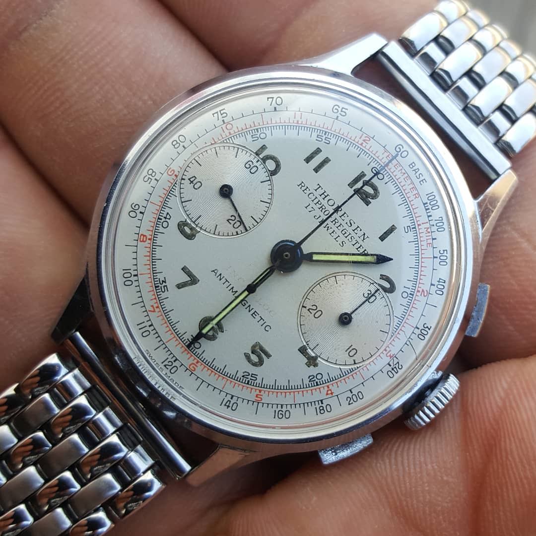 Posts 2,833 Likes 26,468 watchdaddy1 ·May 21, 2019 Corner desk shot of the1950's Thoresen Recipro-Register . My 1st square pusher vintage chrono.