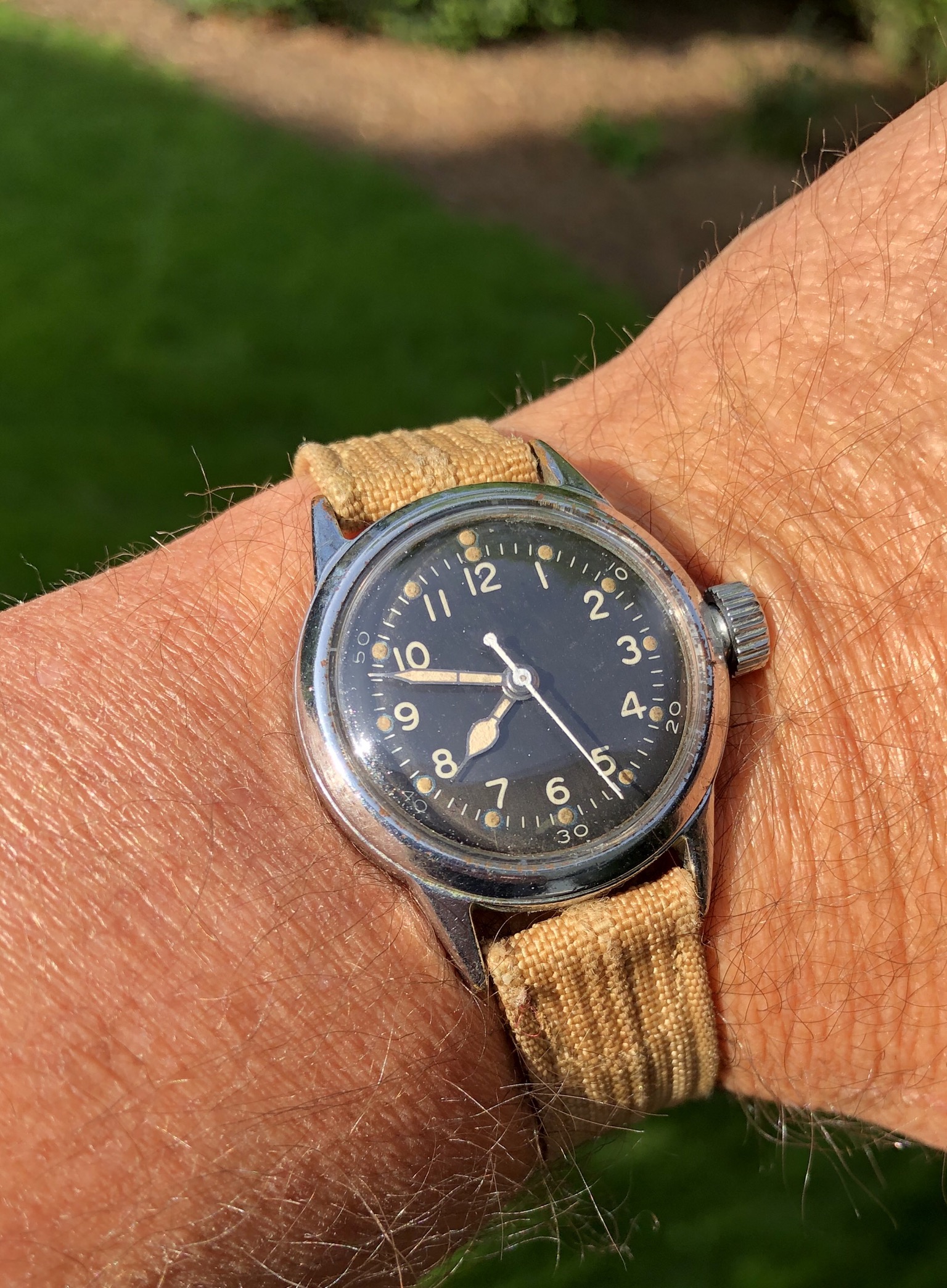 Posts 497 Likes 2,339 Swissmister ·May 25, 2019 Weekend at home watch. WWII naval aviator 39102 with 2987 movmnt. This one came to me in the 80s from the man who wore it in the PTO. Corsair jock.