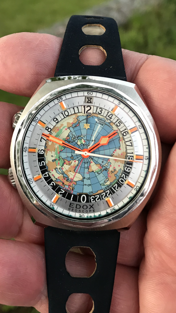 Posts 1,441 Likes 11,971 chronoboy64 ·May 26, 2019 Today playing with the Edox Geoscope 42 Funky early 70s permanent GMT lefty watch HAGWE
