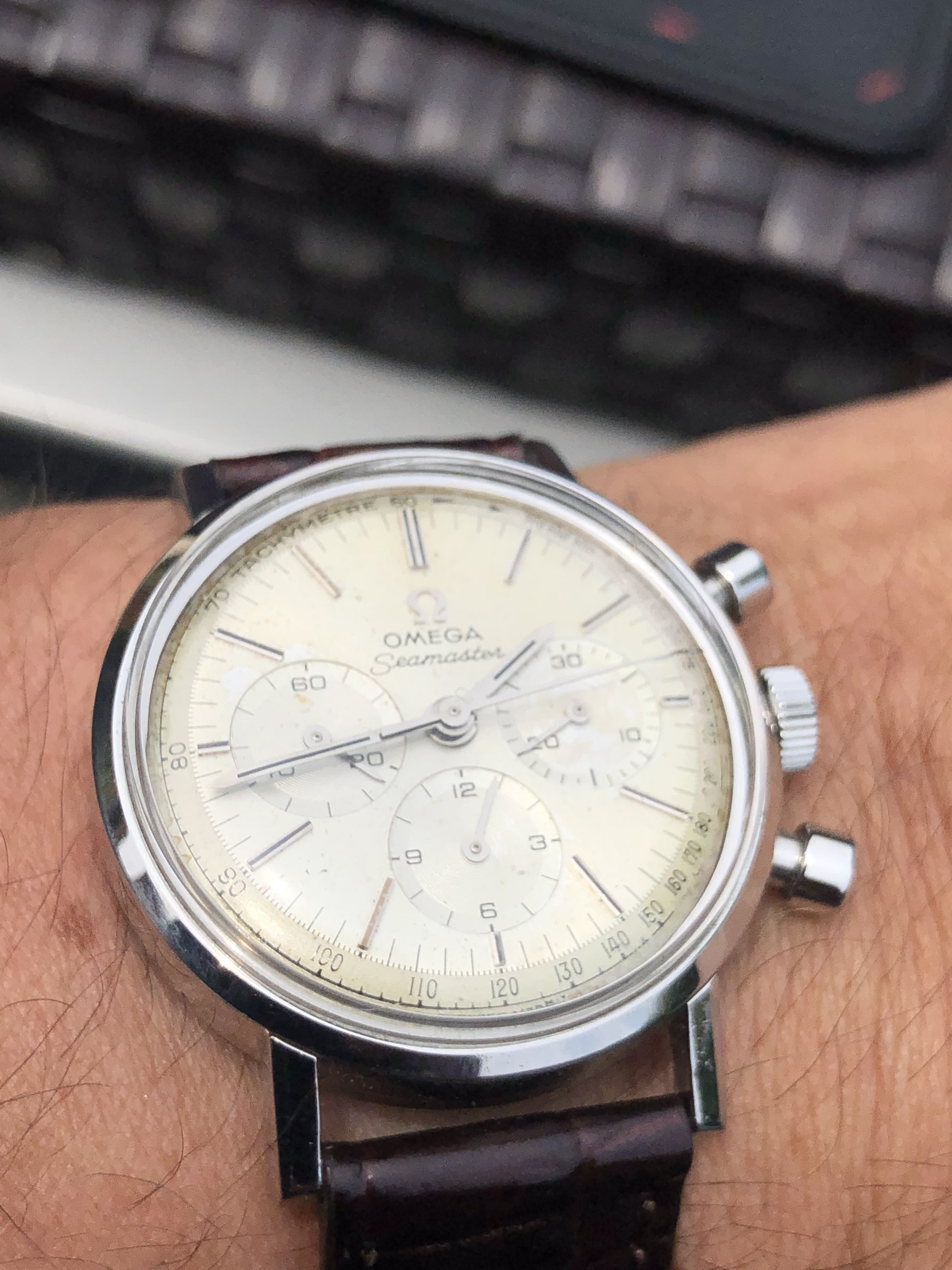 Posts 414 Likes 4,447 SwissMe ·Jun 6, 2019 Lou P Please be witnesses to my adding the Seamaster Regatta Soccer Timer to my box of chronographs from the late 60s and 70s. Or as I like to call it...Crazy Chrono Corner. 😵💫 YaY! Wow, wow, wow!!!! I'm impressed!