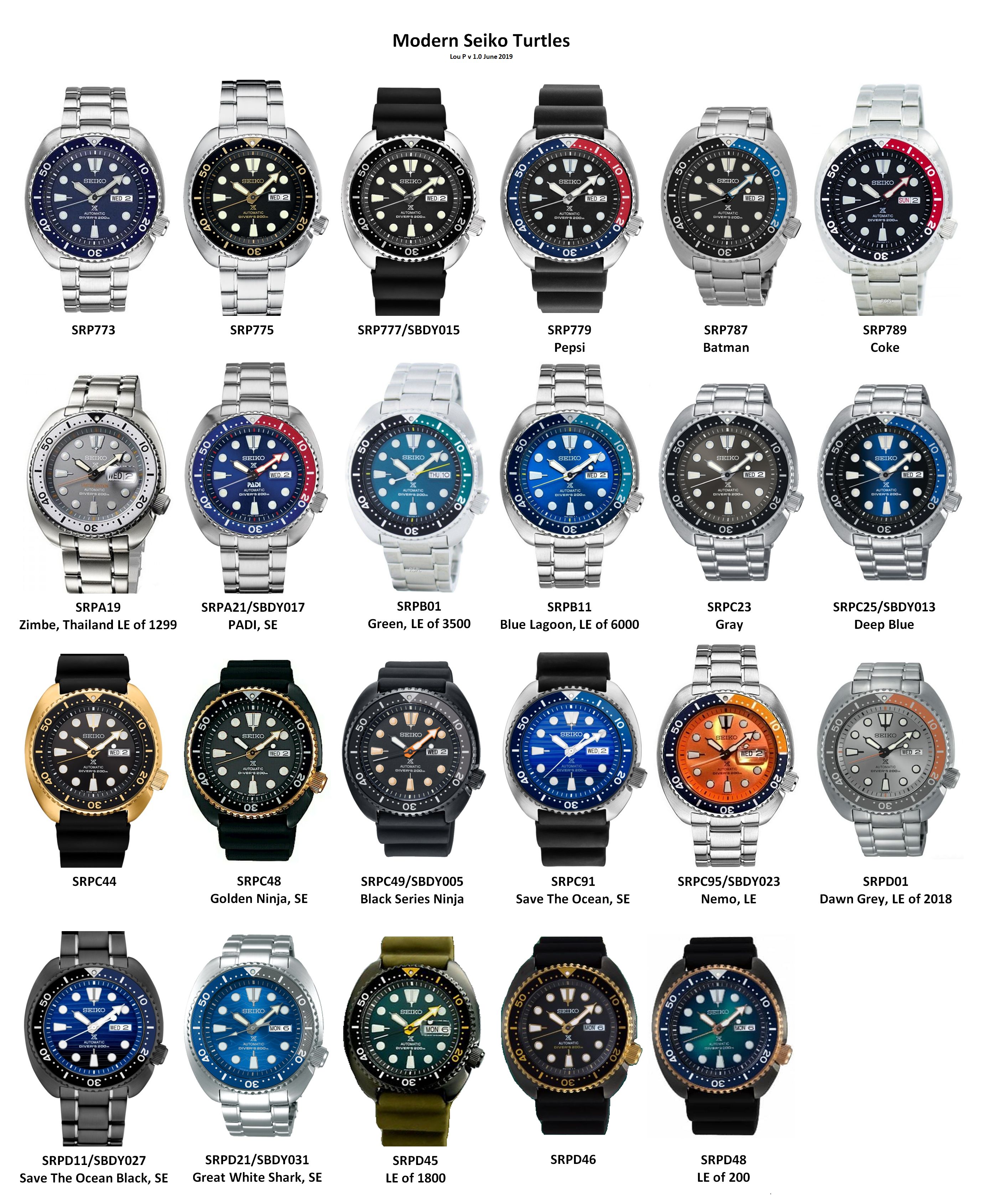 Posts 5,330 Likes 129,475 Lou P 路Jun 26, 2019路YaY! My two Seiko Turtles. Of course my OCD forced me to try to map out how many of these there are. Sharing what I got so far... Going with the...um...blue one today 馃榿 YaY!