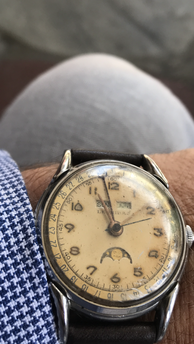Posts 827 Likes 8,285 Njnjcfp88 ·Jun 30, 2019 50’s Leonidas triple date 0501. Gotta get the second hand replaced and the dial (hopefully) cleaned up near the crown side but she’s running nicely ...
