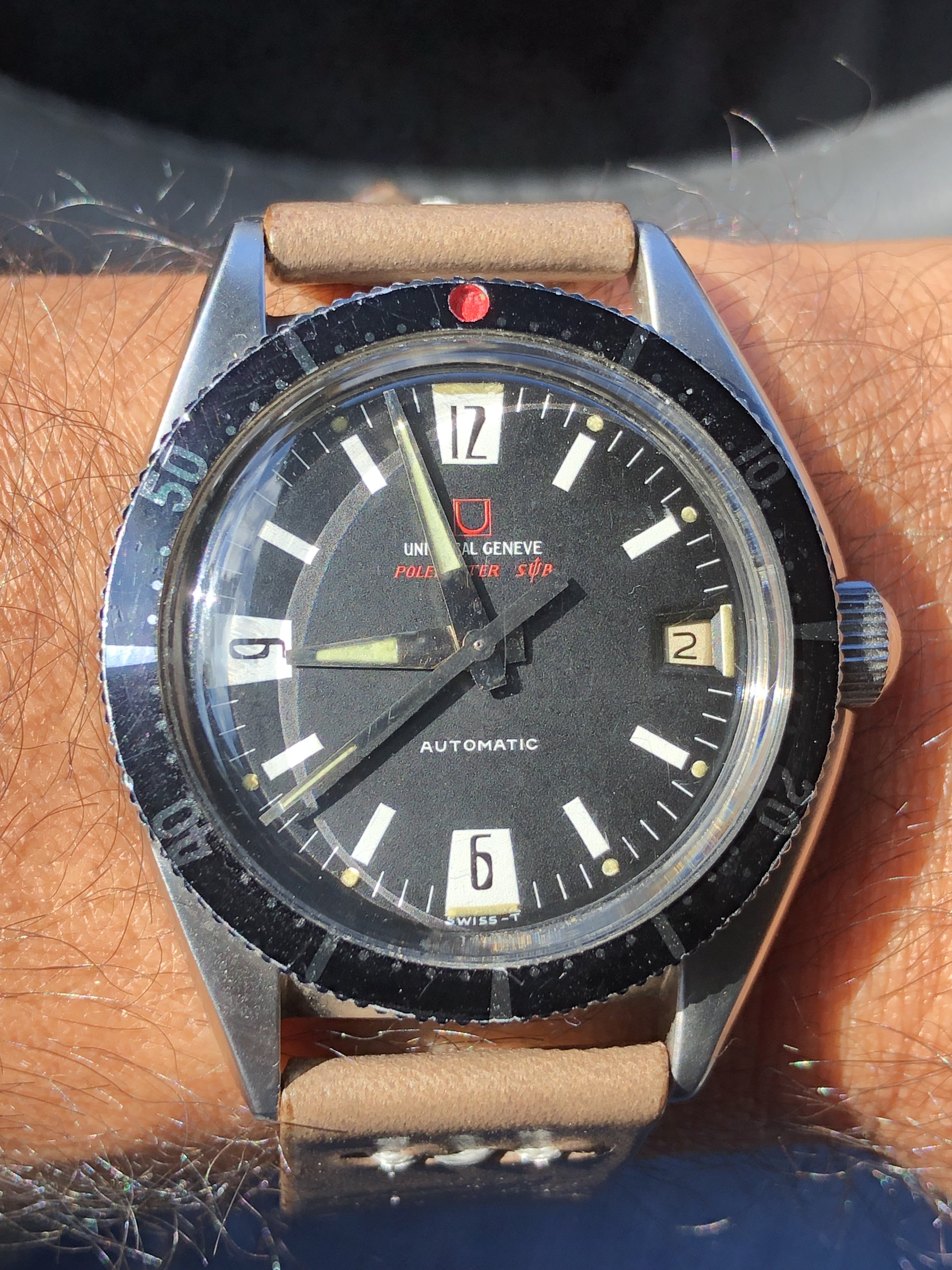 Today, I am wearing a pale spot on a sunburnt arm which is the result of three days camping in the Rocky Mountains, temperatures about 81° F, and cloudless skies. This is the silhouette of my beater Seiko, my watch of choice when I rusticate myself.