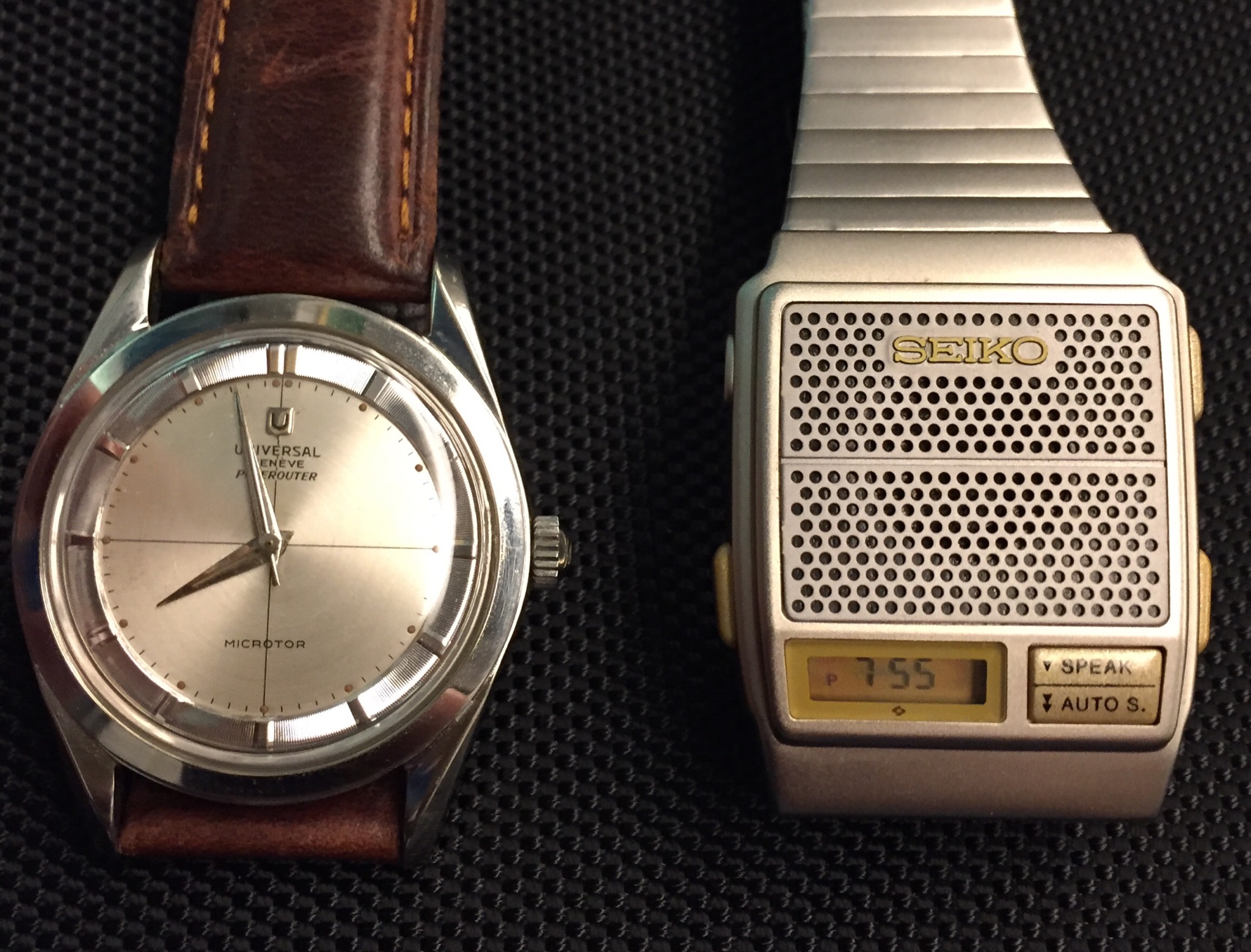 ...I arrived at the office this morning wearing the UG on the left...the talking Seiko on the right arrived a little later. (Haven’t synchronized them yet!)...
