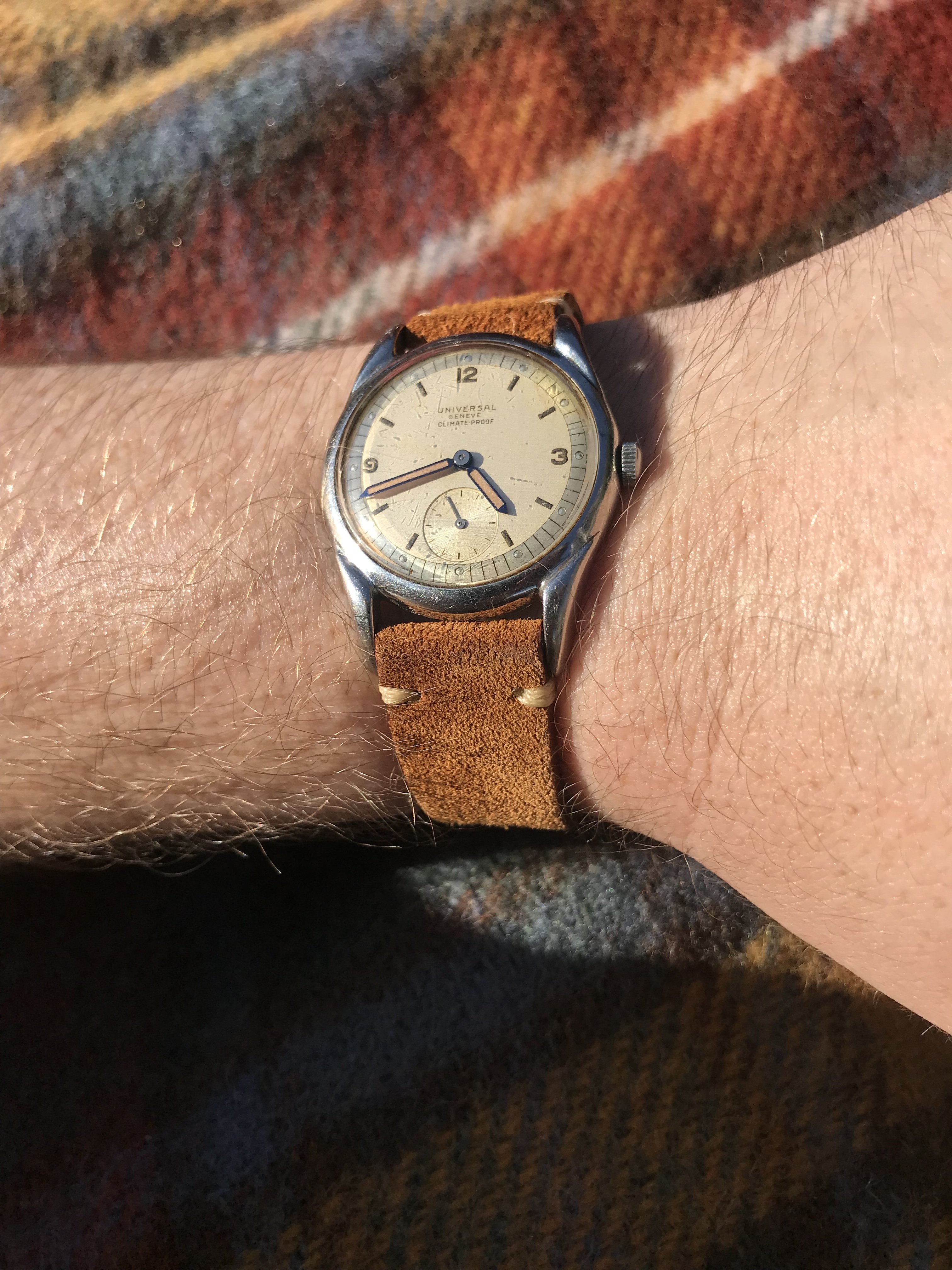 Posts 548 Likes 2,560 Woops ·Sep 18, 2019 Begrudgingly breaking out the autumn watches here. 1946 UG Climate Proof bumper - water resistance at owner’s risk!
