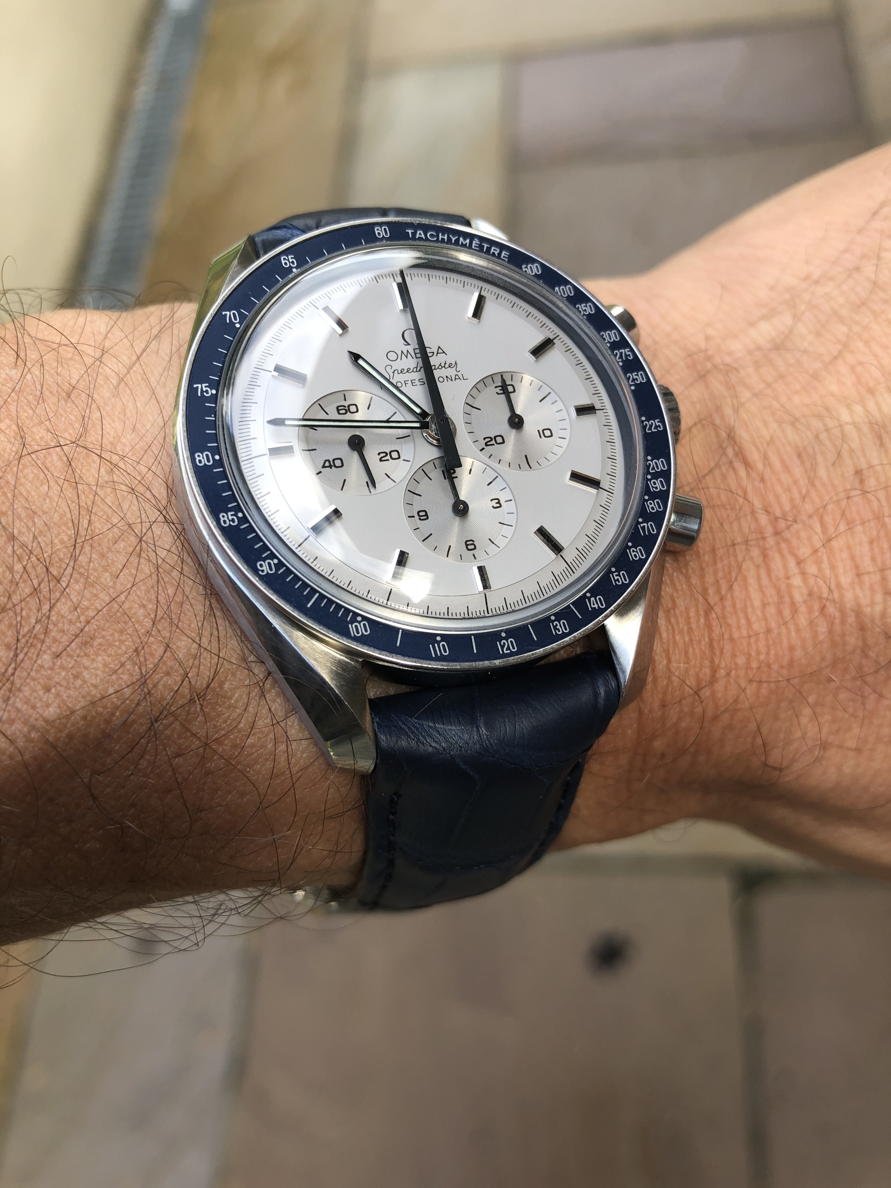 I’m wearing my newly build bespoke ‘50th anniversary moon landing’ speedy. My own steel interpretation of what Omega are doing with gold! Blue bezel and blue deployment