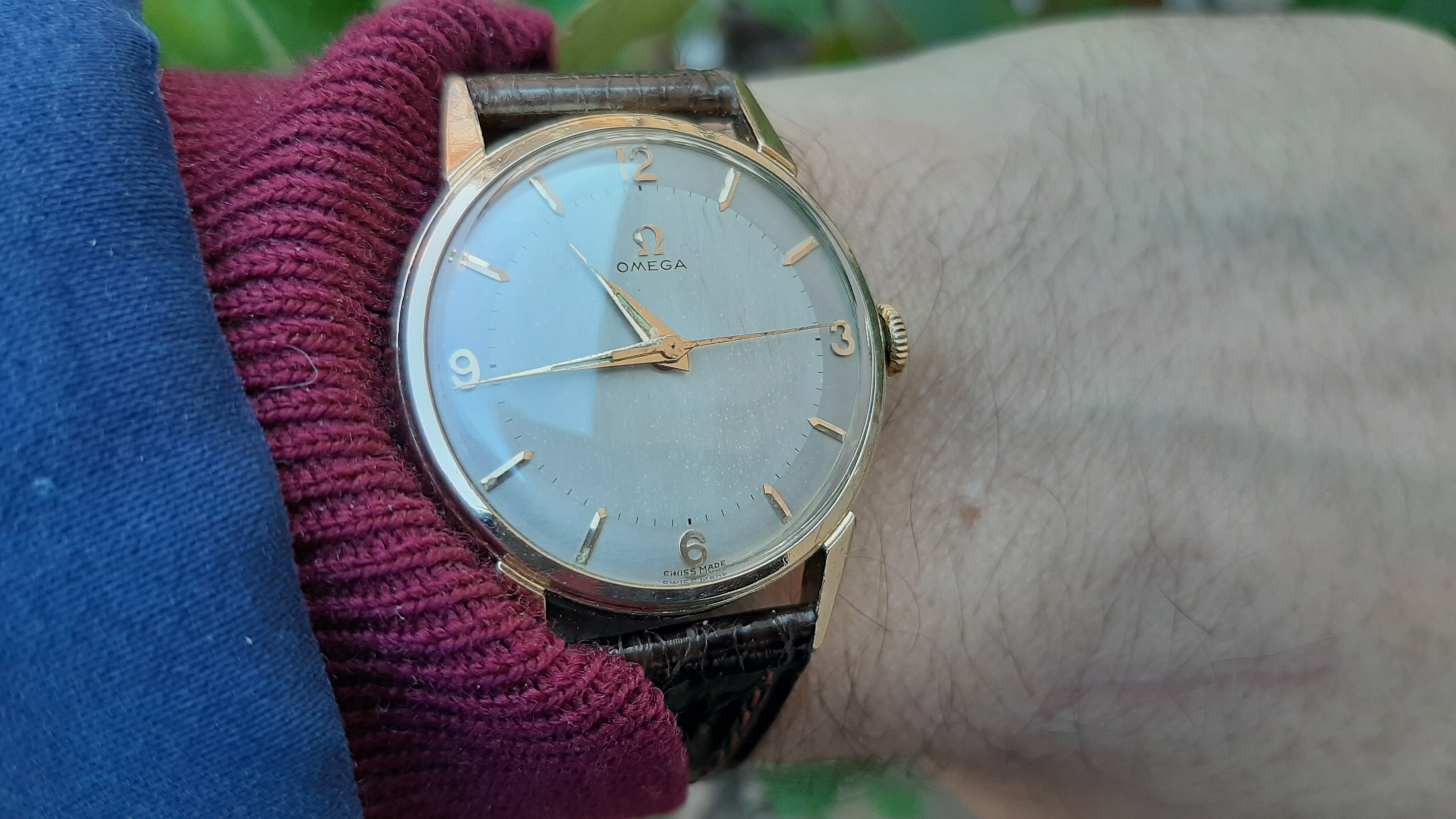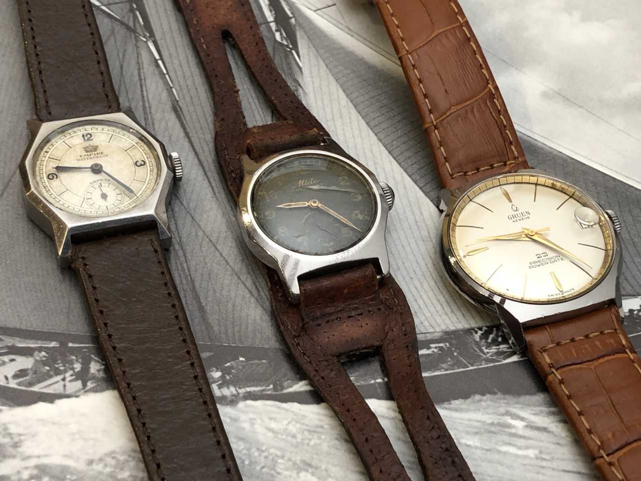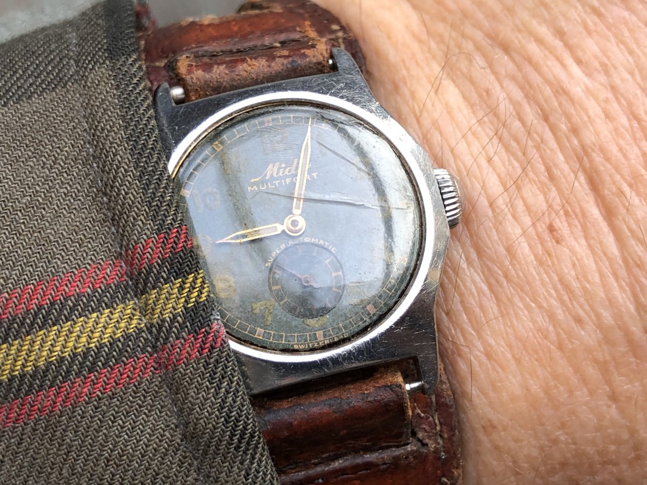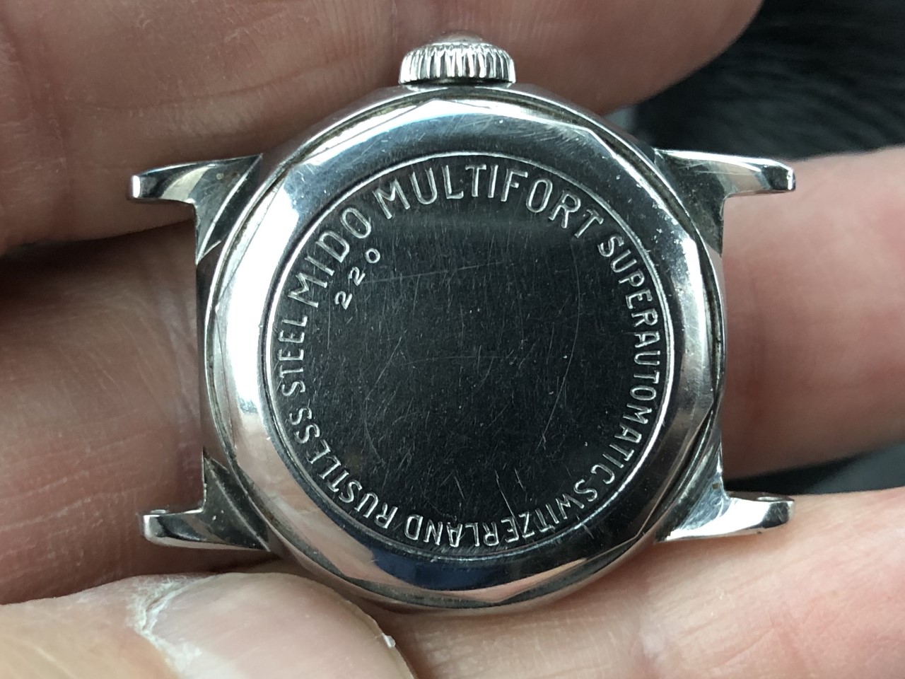 Wearing a recent acquisition today in need of a little TLC, a Mido Multifort Super Automatic, circa 1941. The watch uses a Taubert & Fils "waterproof" case that traces its DNA back to an early 1930s Taubert design which featured an octagonal stainless steel case, decagonal screw down back, and a specially treated cork winding stem seal. Iterations of this 1930s "waterproof" case were used by various manufacturers such as IWC, Vacheron & Constantin, Longines, Mido and Gruen through at least the early 1960s. Also attached is a photo of three watches tracing the evolution of the 1930s design: circa 1934 Empire; circa 1941 Mido Multifort Super Automatic; and, circa 1961 Gruen 23 Precision Power Date.