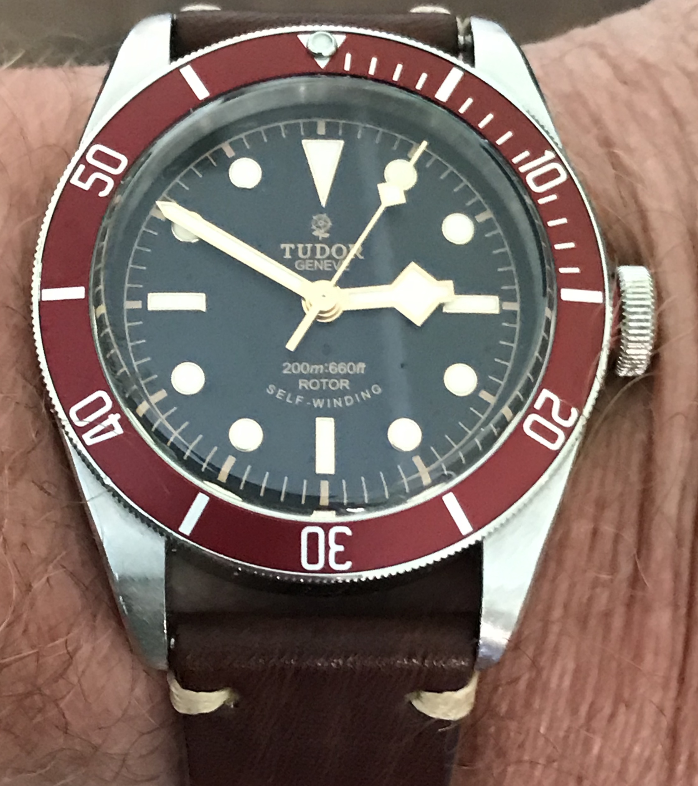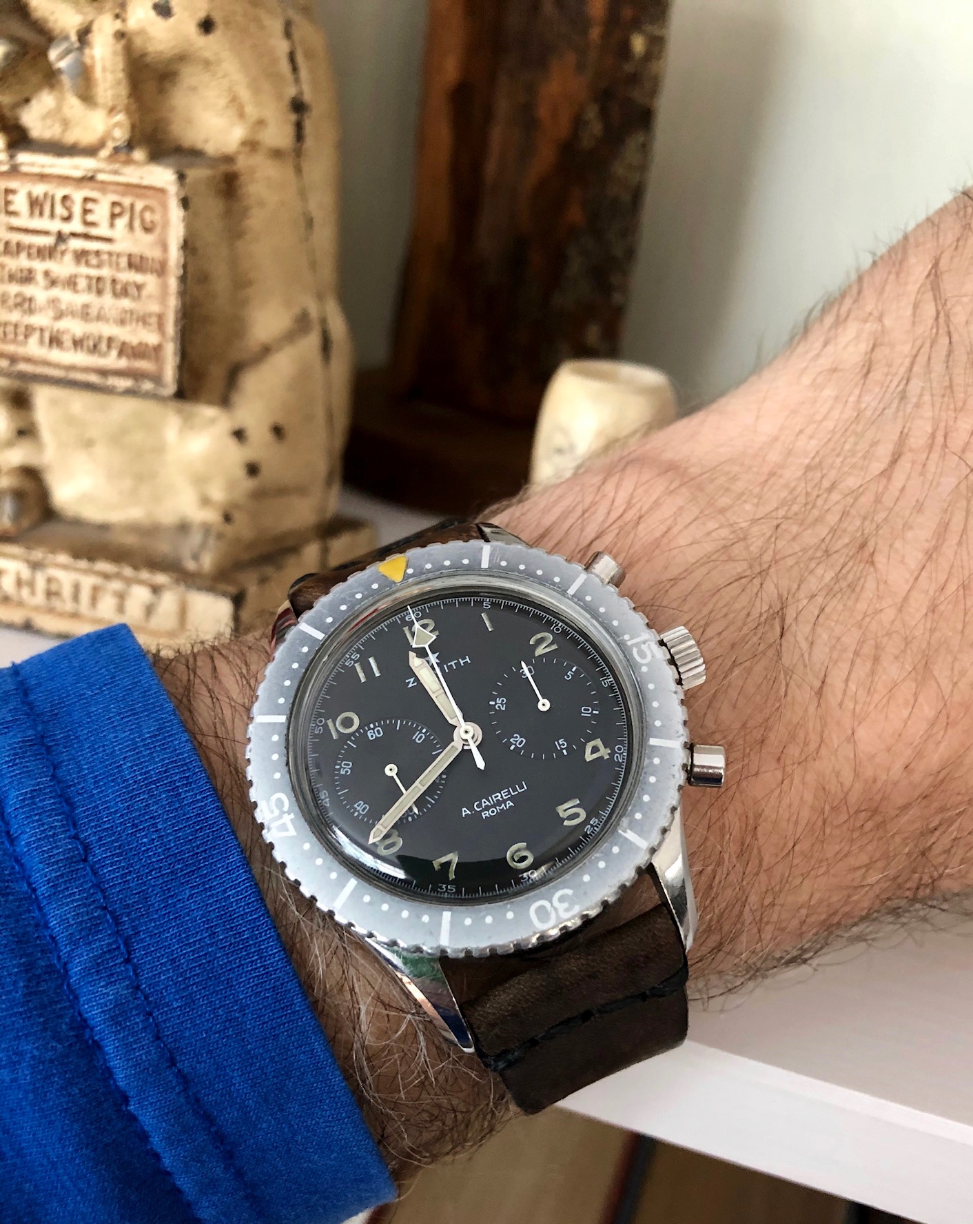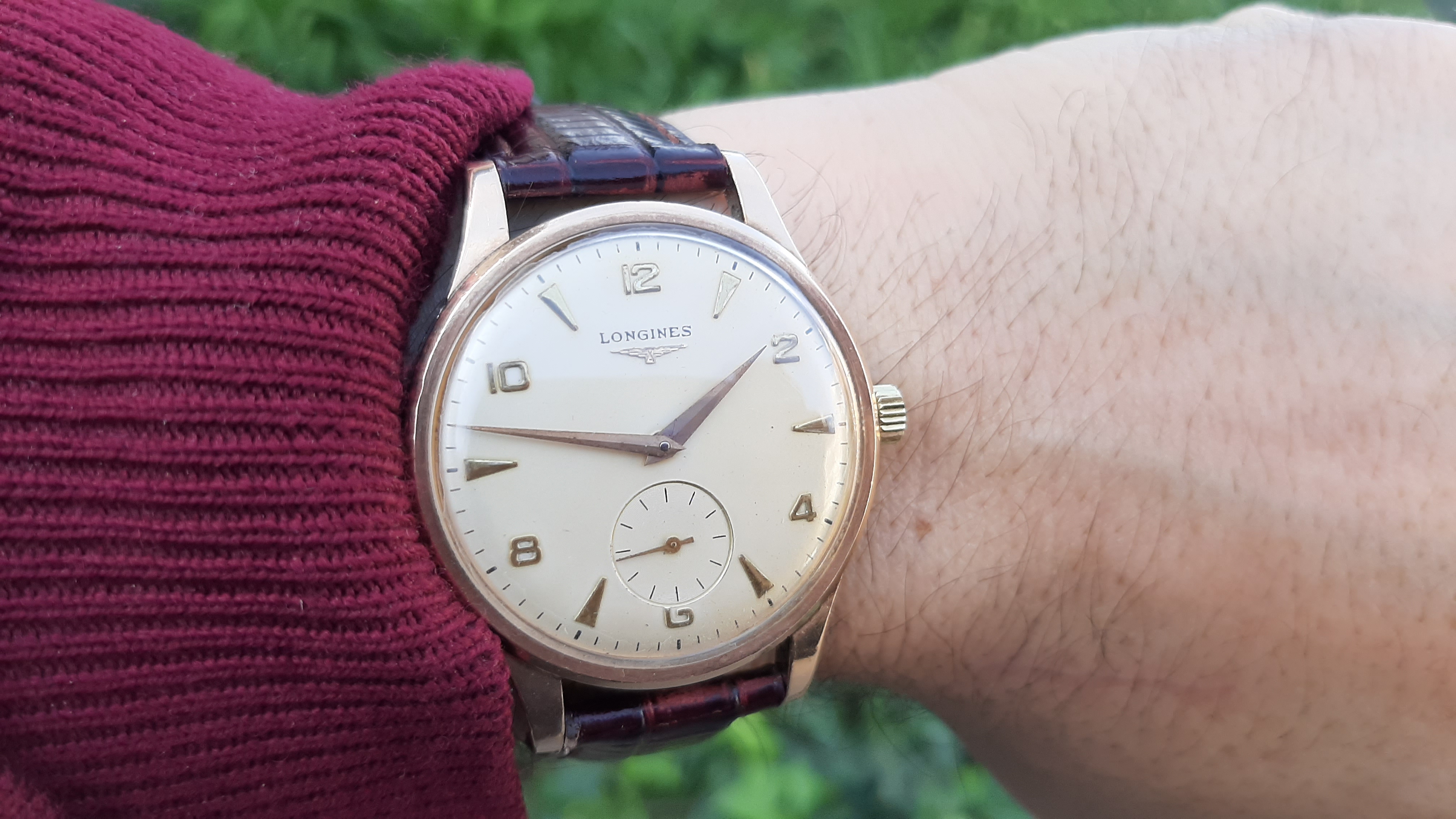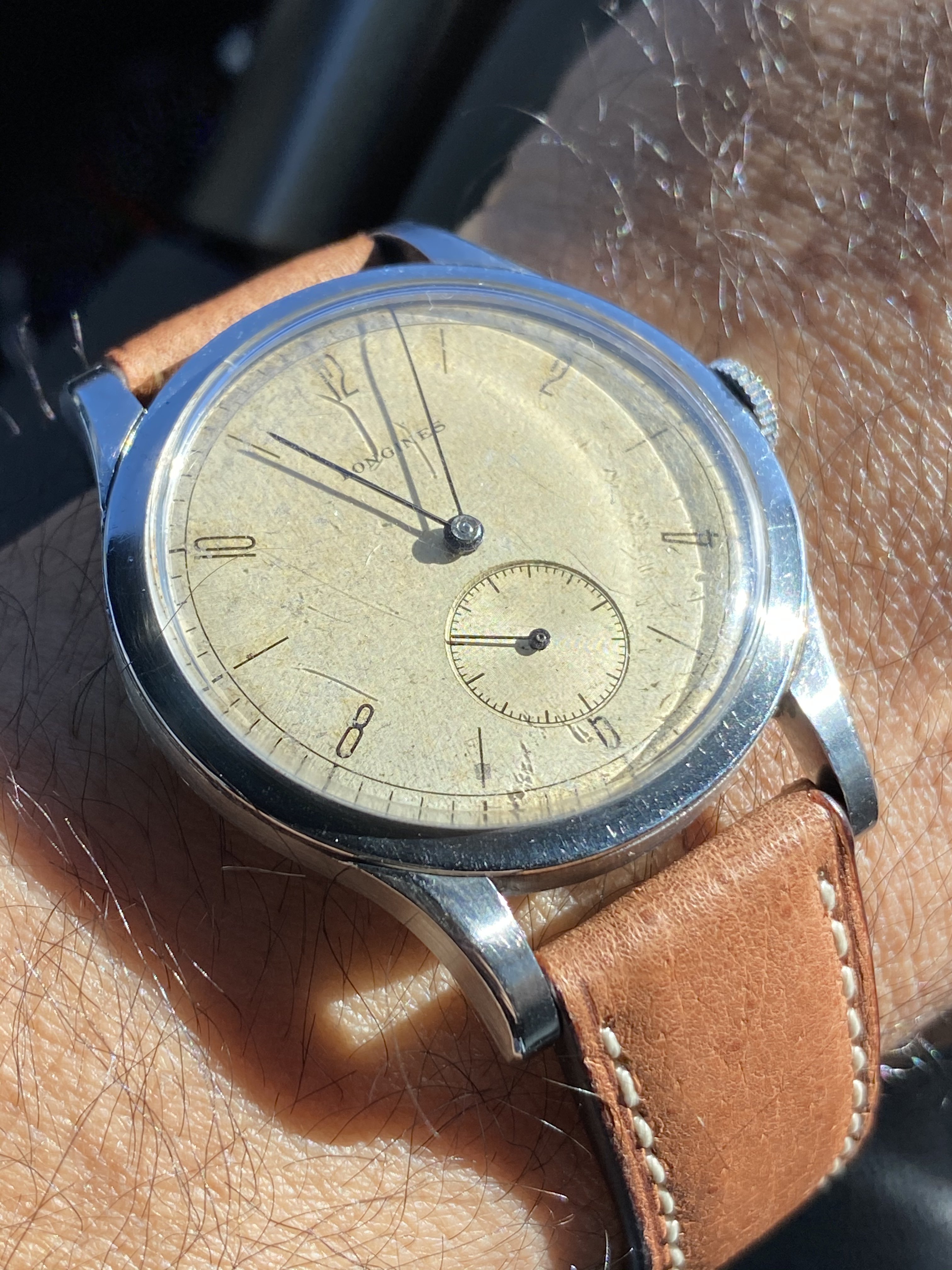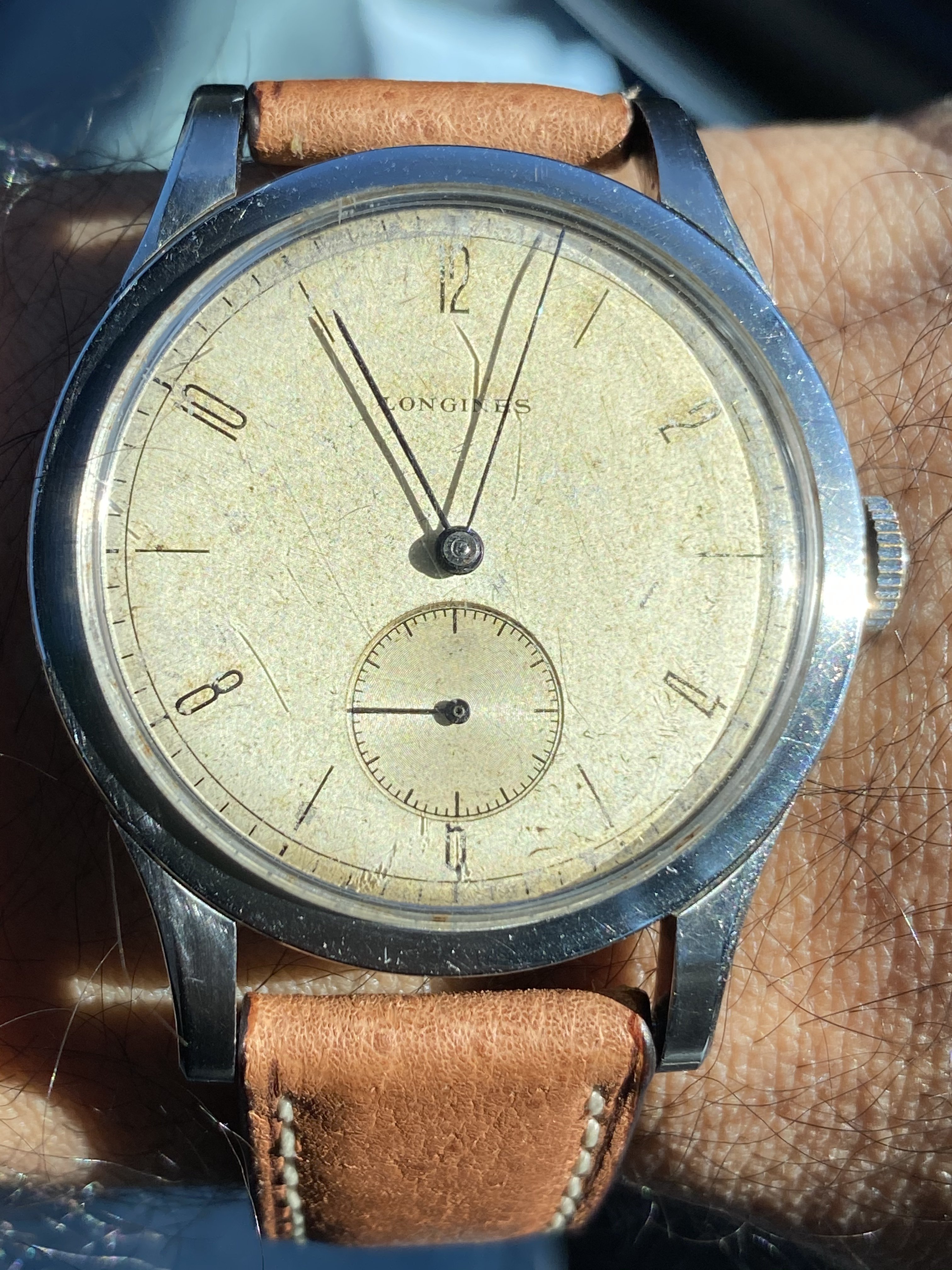 Wearing one of my restorations today, a Haussmann (German Jeweller) Valjoux 21 version 1 ca 1935. Strap hand made by Authur Liu of New York. I re-lumed the porcelain dial and blued the hands myself. I had the movement serviced. 18kt gold case: