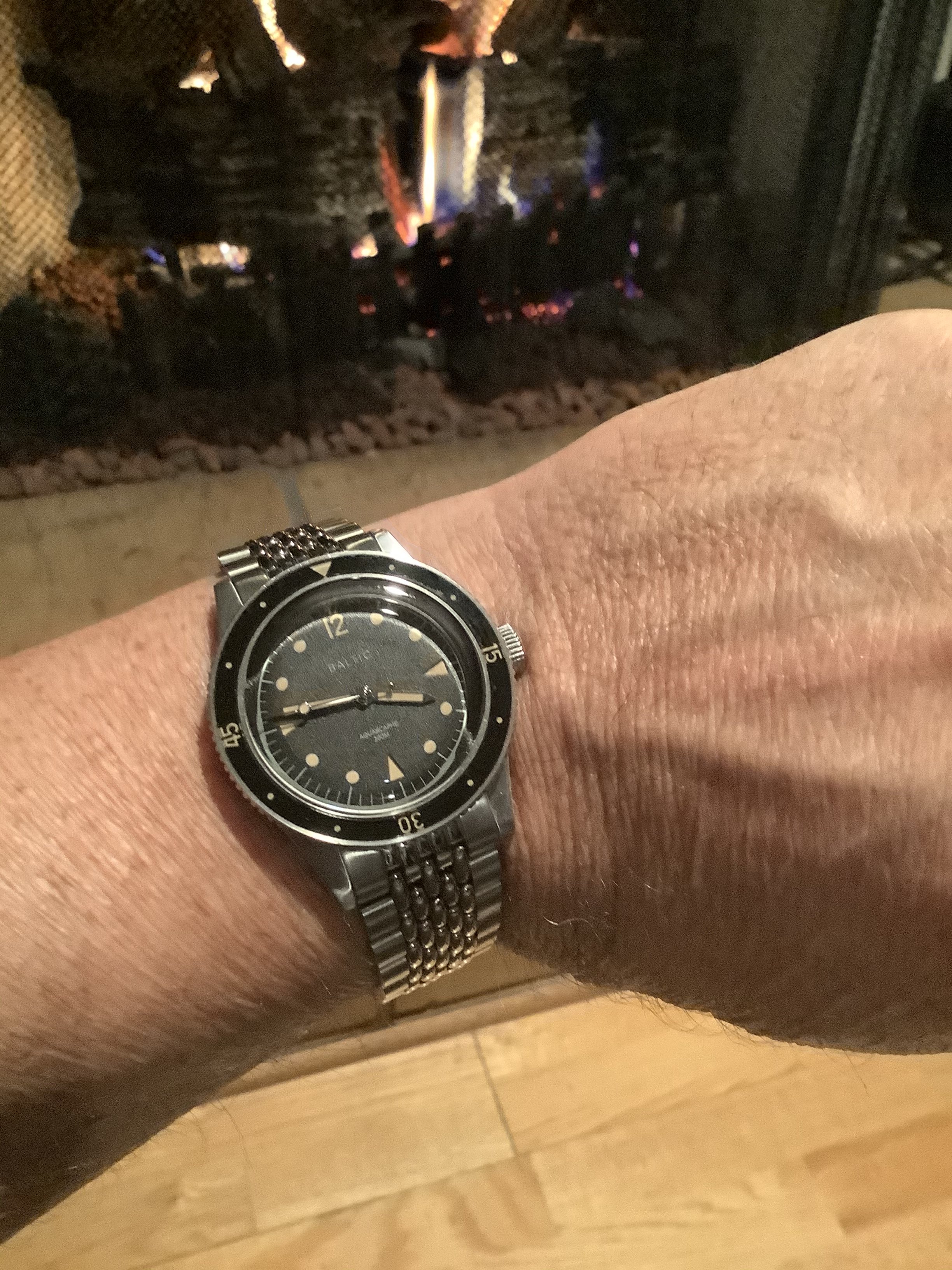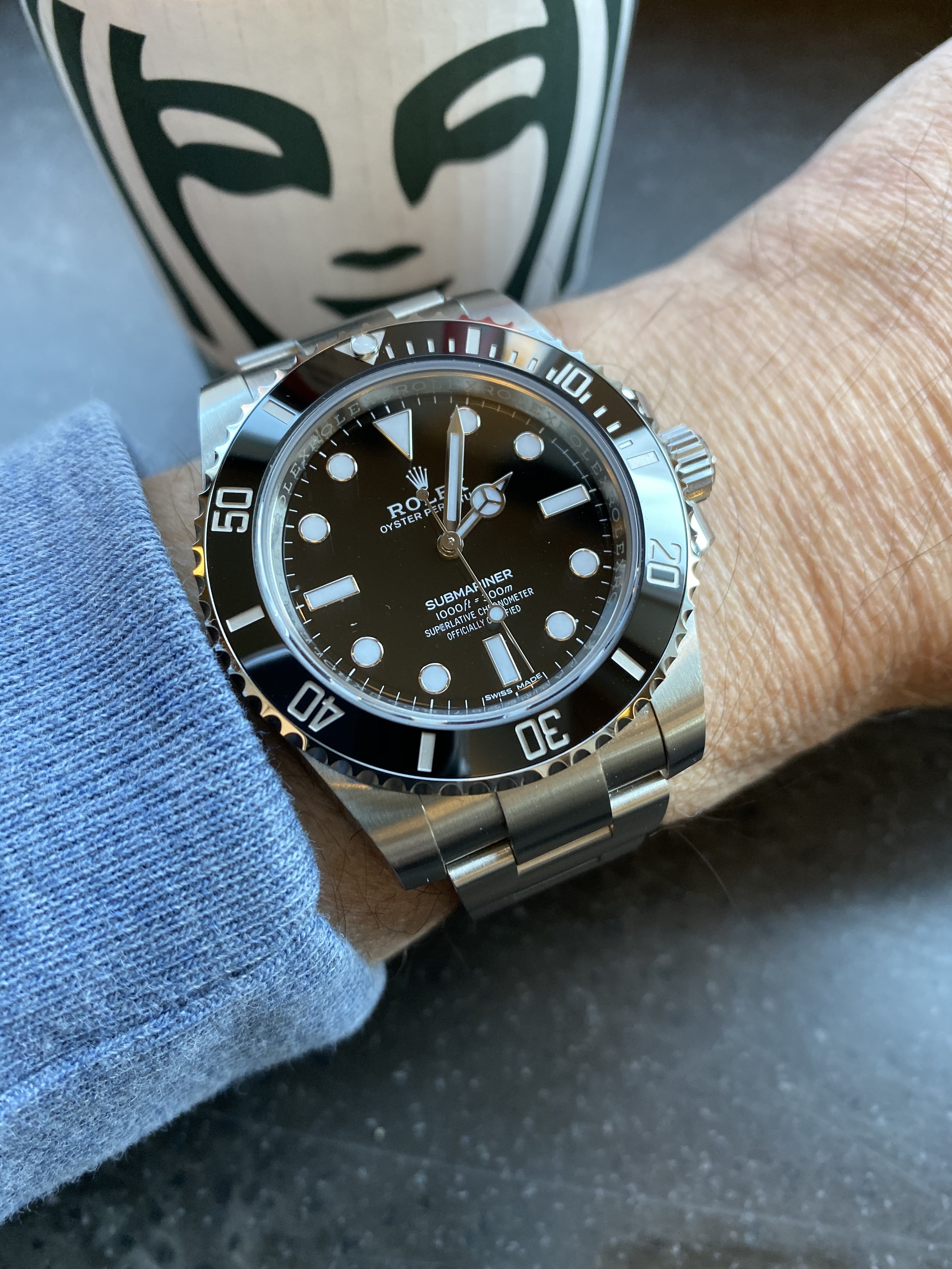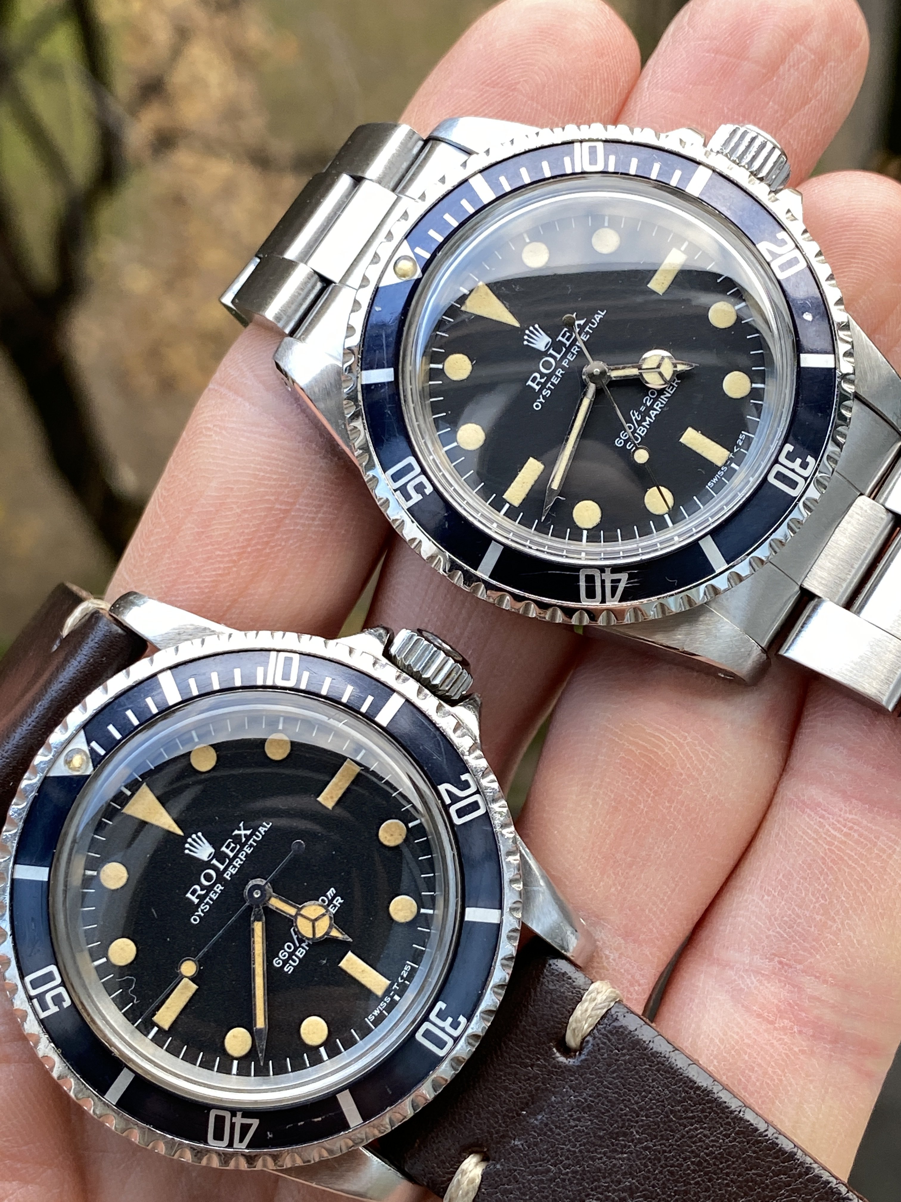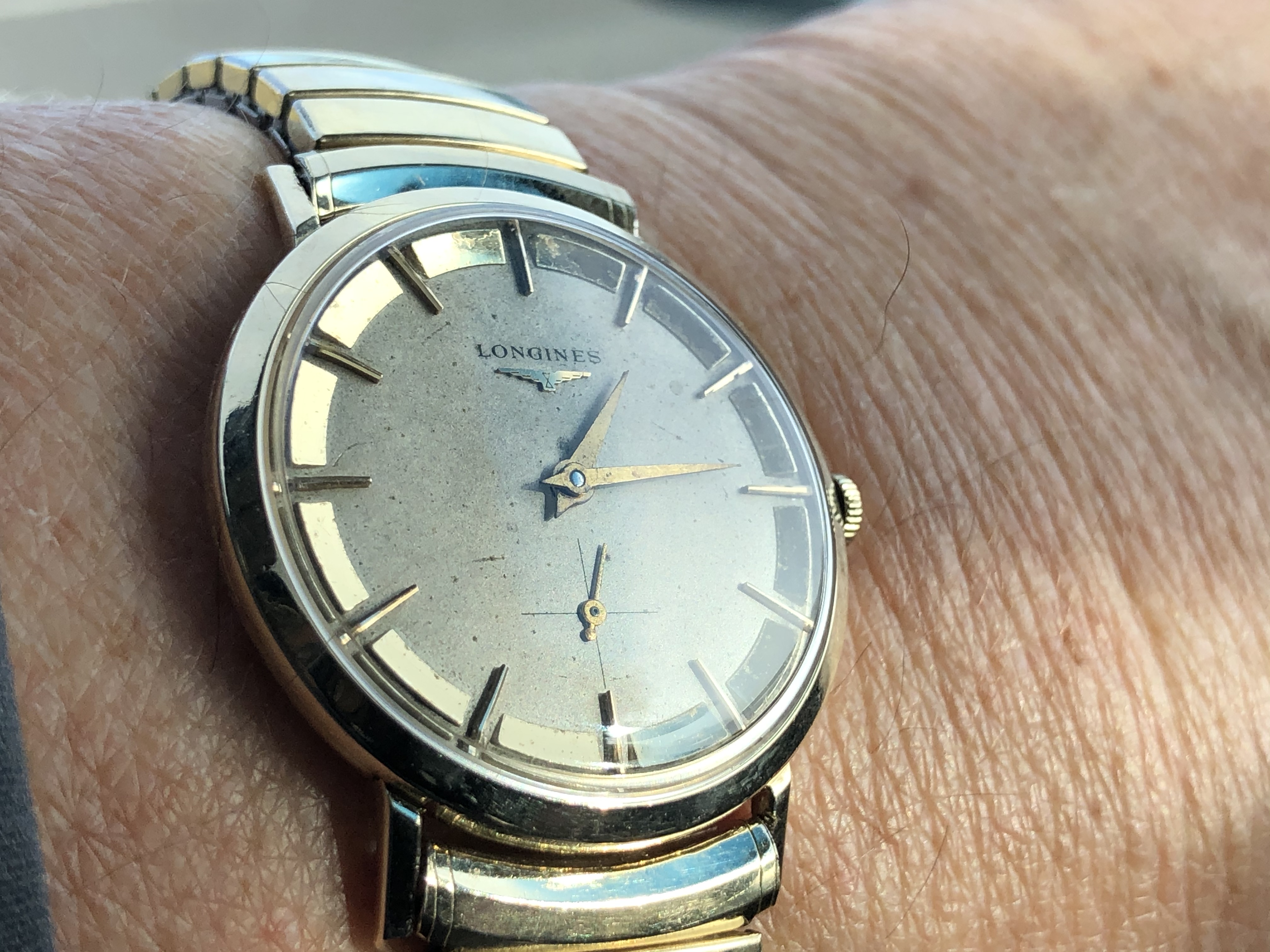 My (almost) 50-year old Rolex Air King Oyster Date. One owner. I won this in a Rolex sales contest. Had I known what was going to happen to Rolex prices way back then, I would have kept the hang tag. The MSRP back then was $215.00! A close look might give the impression there is lint under the crystal. It’s not lint. The lacquer top coat has begun to peel. I have it set one day ahead, but since November has 30 days, the date will be correct on Sunday. (Oh! That is an after market bracelet. I let our son wear this watch when he was 9 years old. He destroyed the bracelet and nearly destroyed the watch in less than one year.)