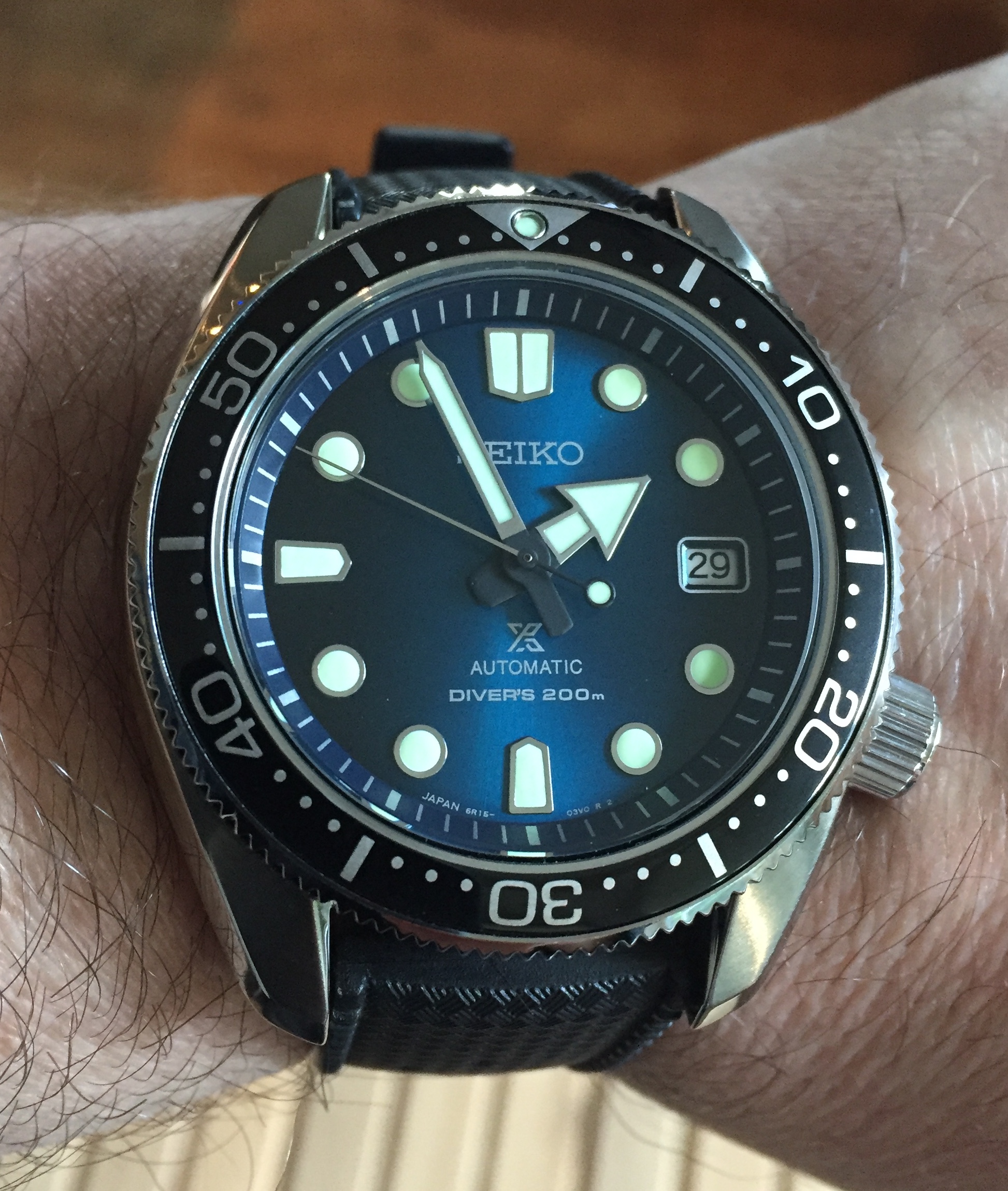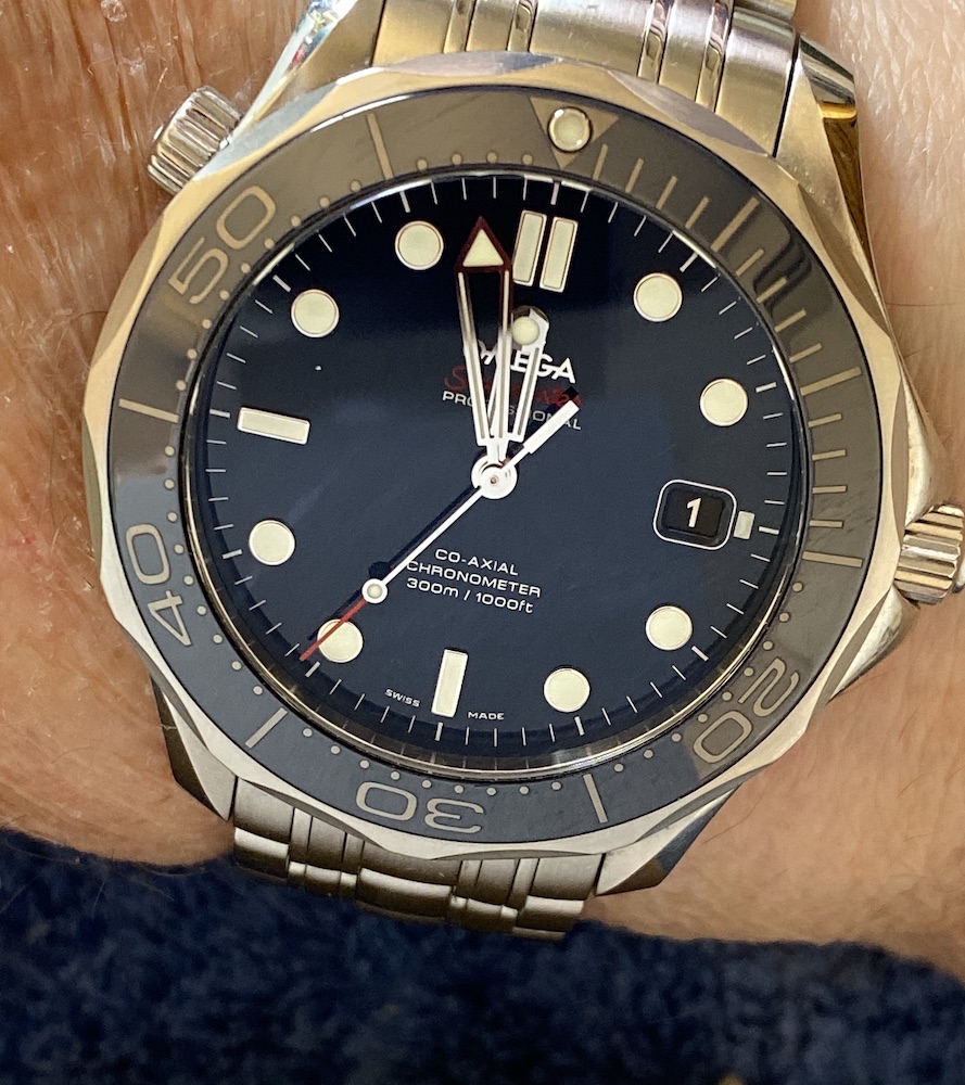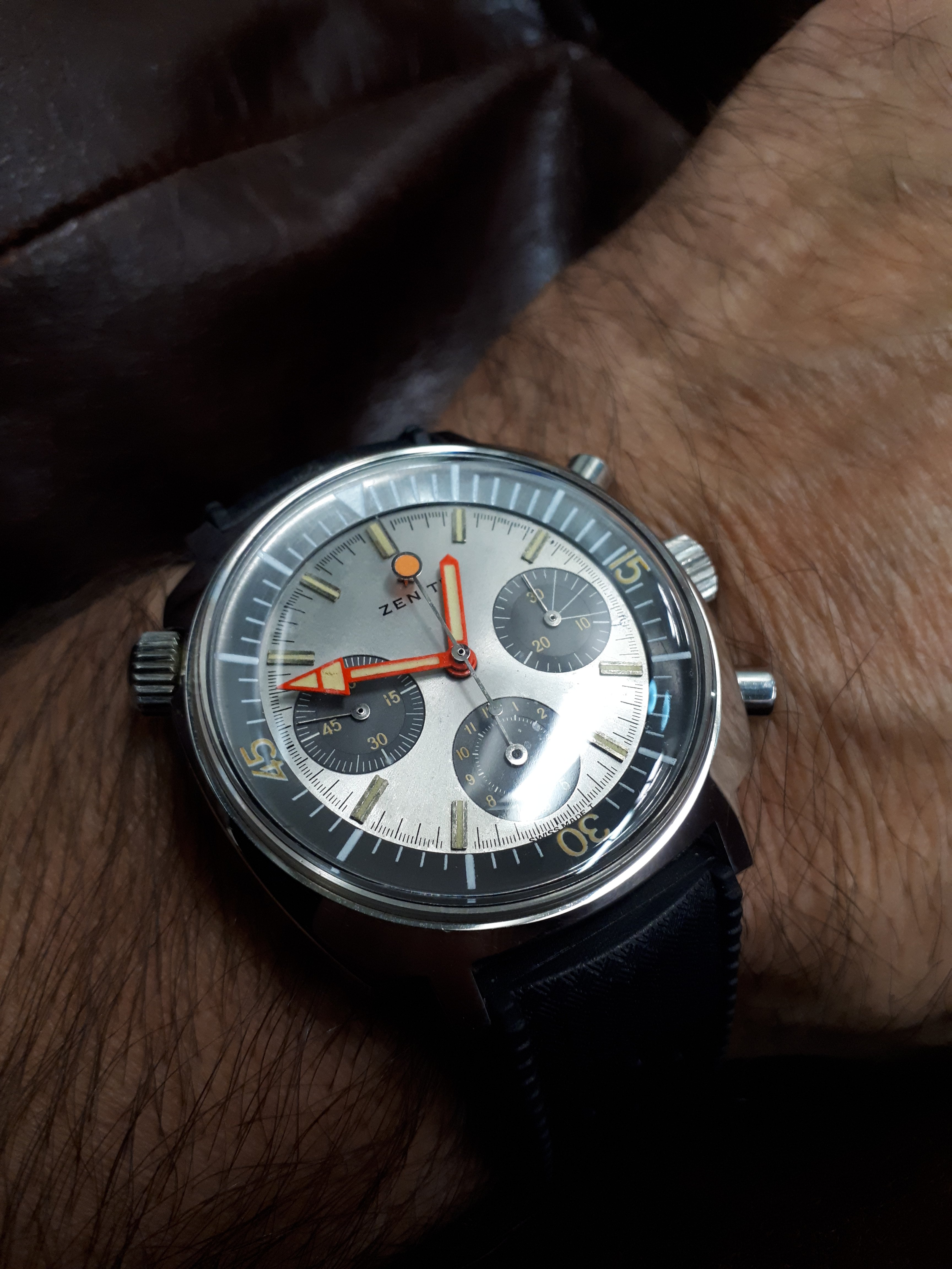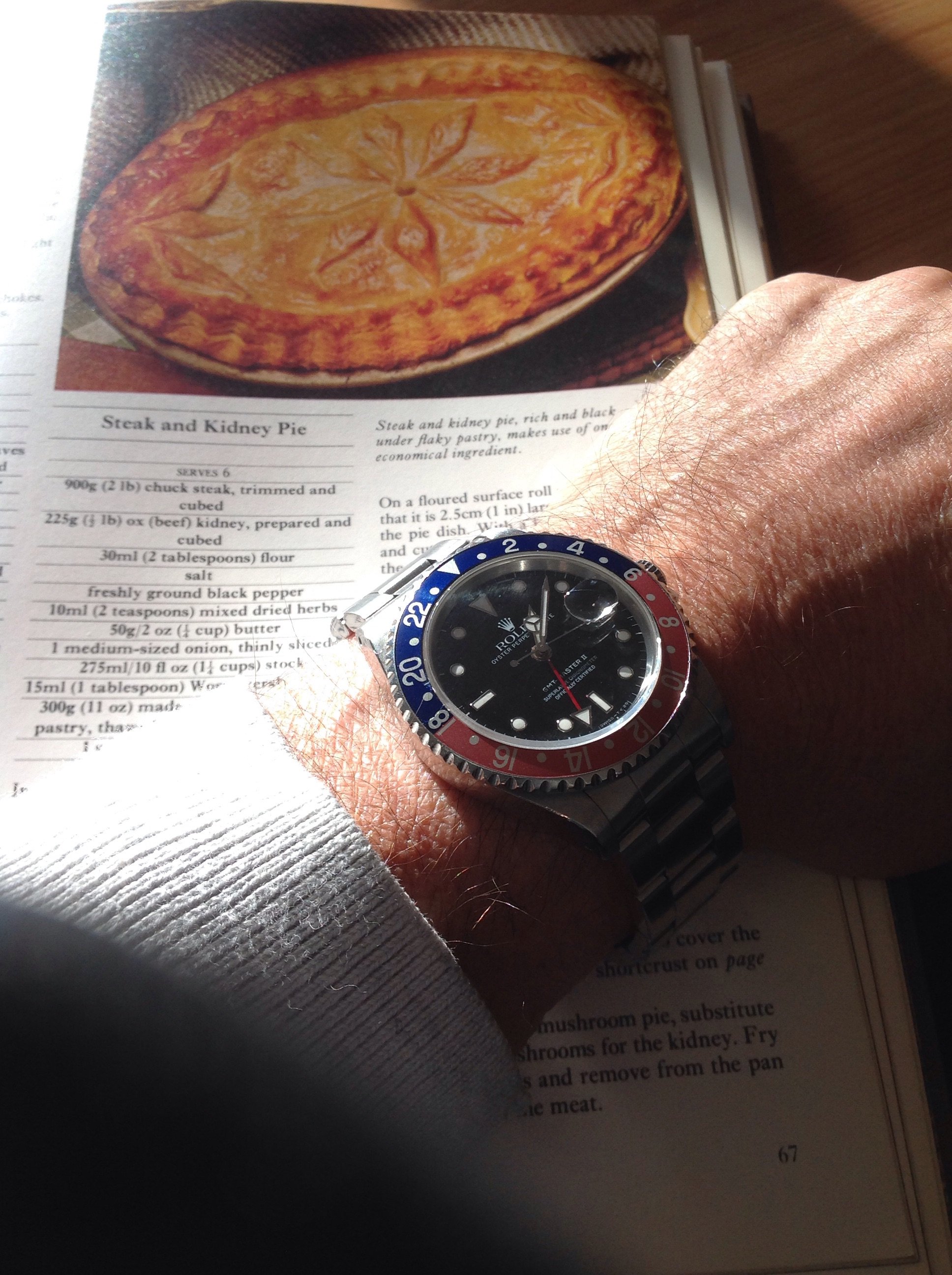My (almost) 50-year old Rolex Air King Oyster Date. One owner. I won this in a Rolex sales contest. Had I known what was going to happen to Rolex prices way back then, I would have kept the hang tag. The MSRP back then was $215.00! A close look might give the impression there is lint under the crystal. It’s not lint. The lacquer top coat has begun to peel. I have it set one day ahead, but since November has 30 days, the date will be correct on Sunday. (Oh! That is an after market bracelet. I let our son wear this watch when he was 9 years old. He destroyed the bracelet and nearly destroyed the watch in less than one year.)