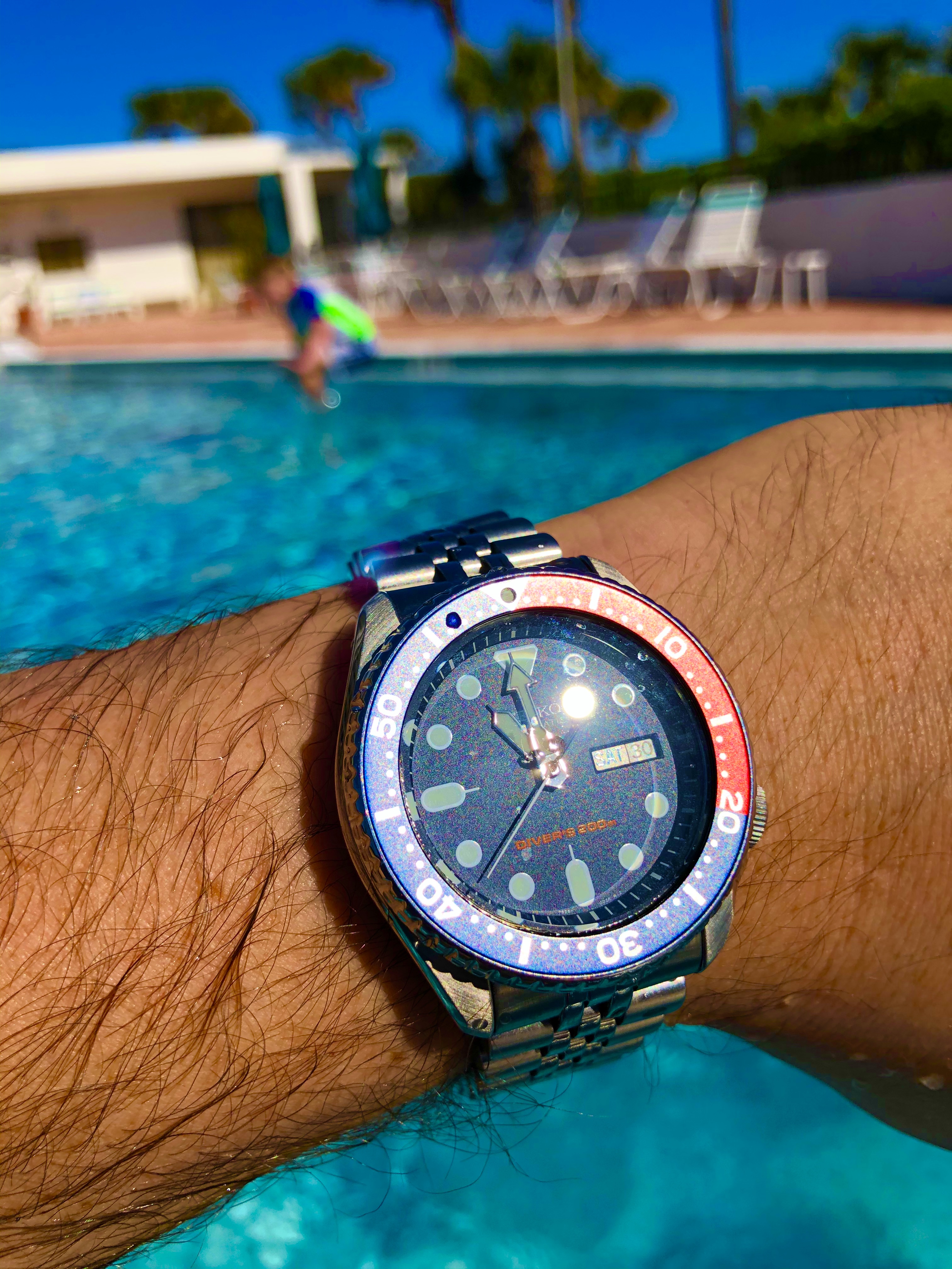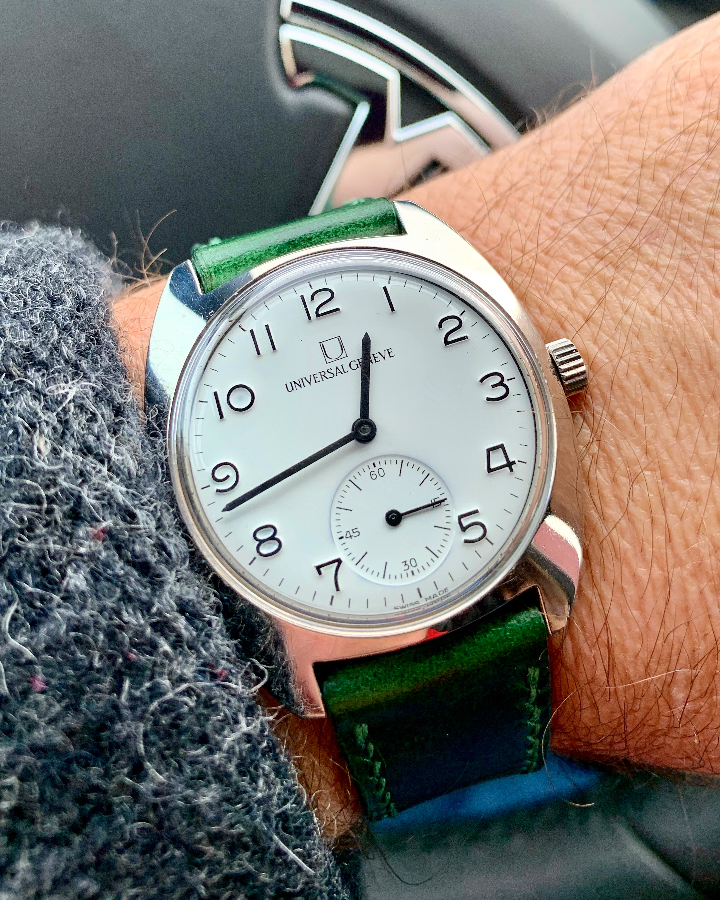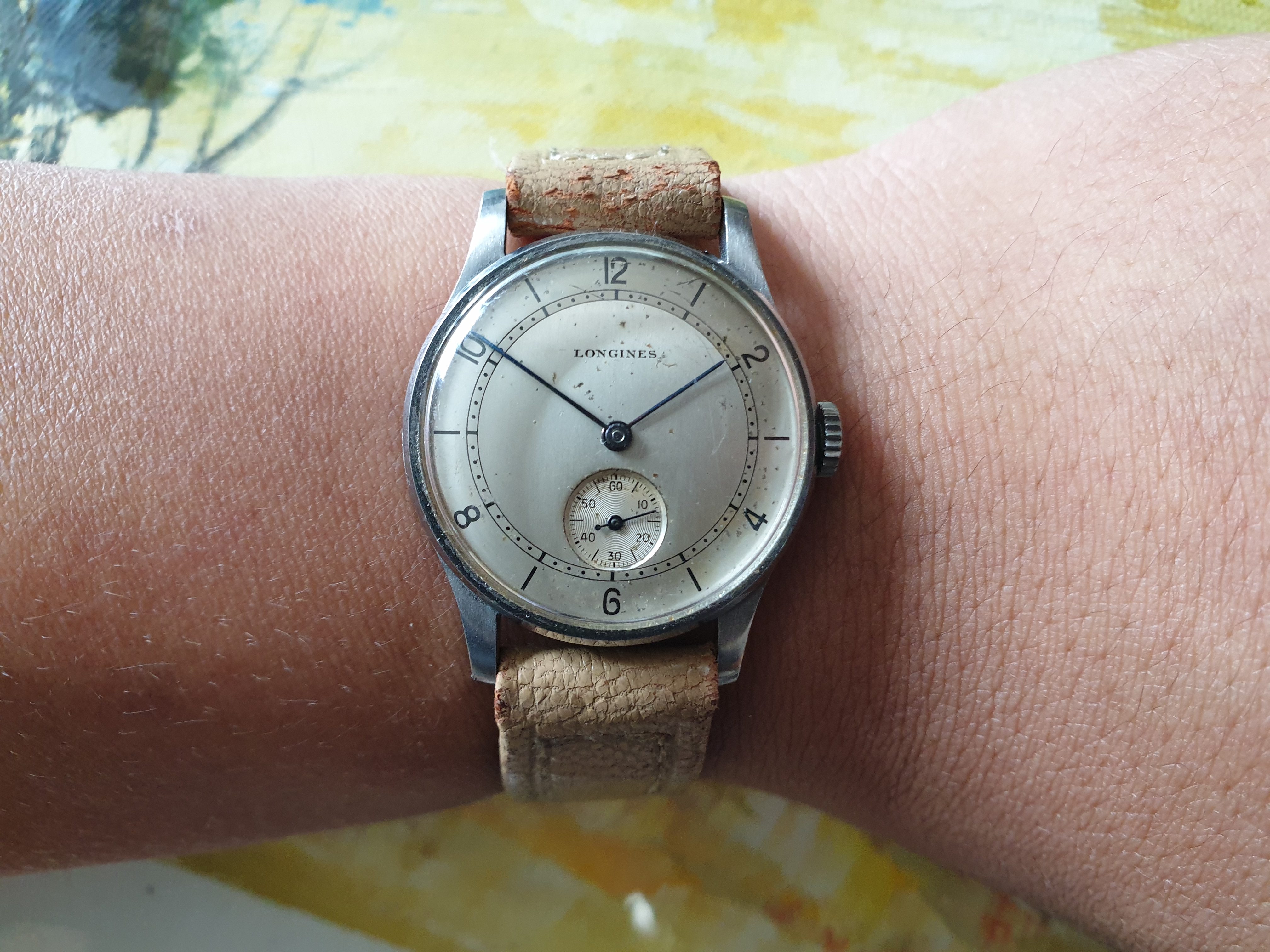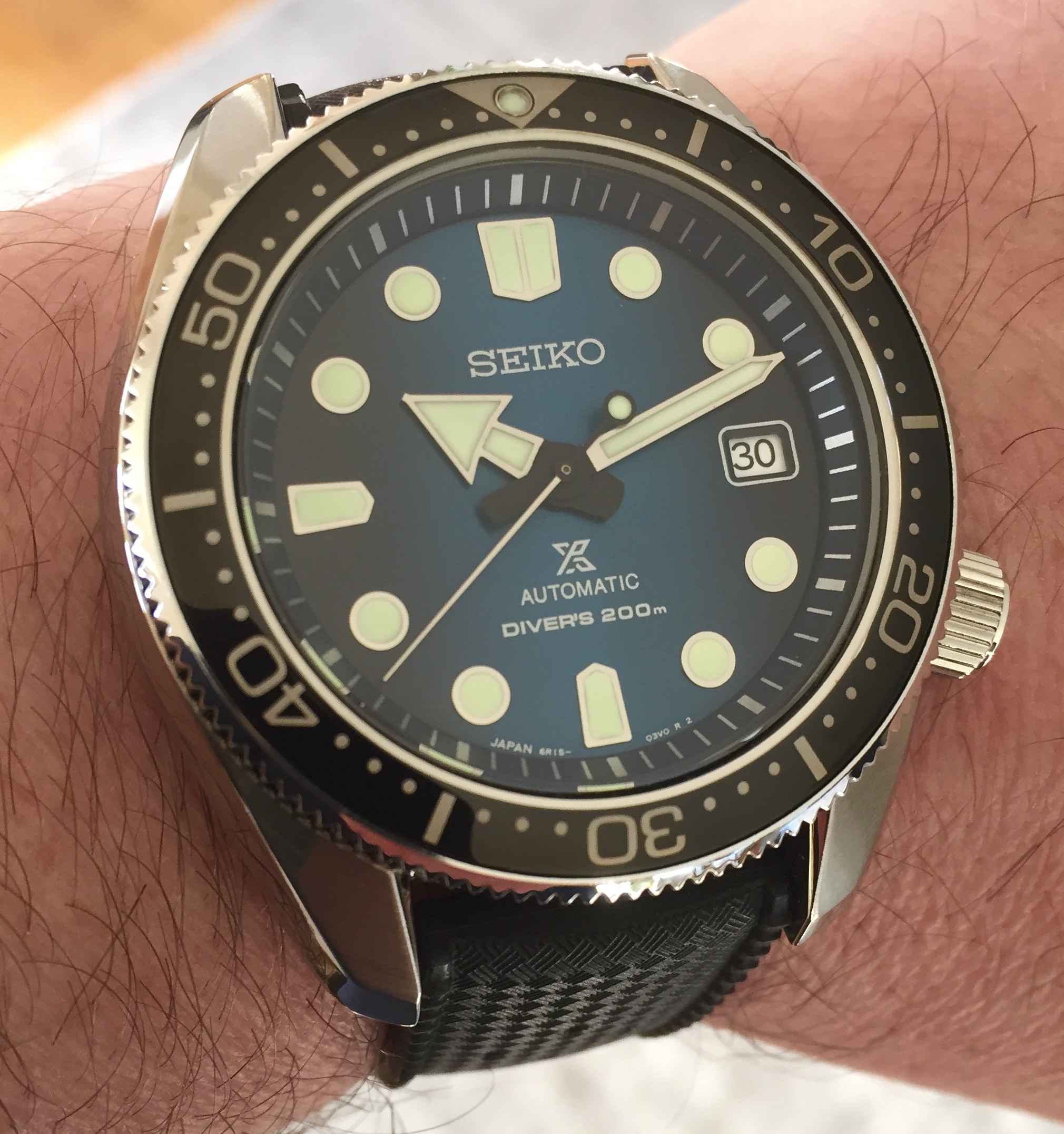 My (almost) 50-year old Rolex Air King Oyster Date. One owner. I won this in a Rolex sales contest. Had I known what was going to happen to Rolex prices way back then, I would have kept the hang tag. The MSRP back then was $215.00! A close look might give the impression there is lint under the crystal. It’s not lint. The lacquer top coat has begun to peel. I have it set one day ahead, but since November has 30 days, the date will be correct on Sunday. (Oh! That is an after market bracelet. I let our son wear this watch when he was 9 years old. He destroyed the bracelet and nearly destroyed the watch in less than one year.)