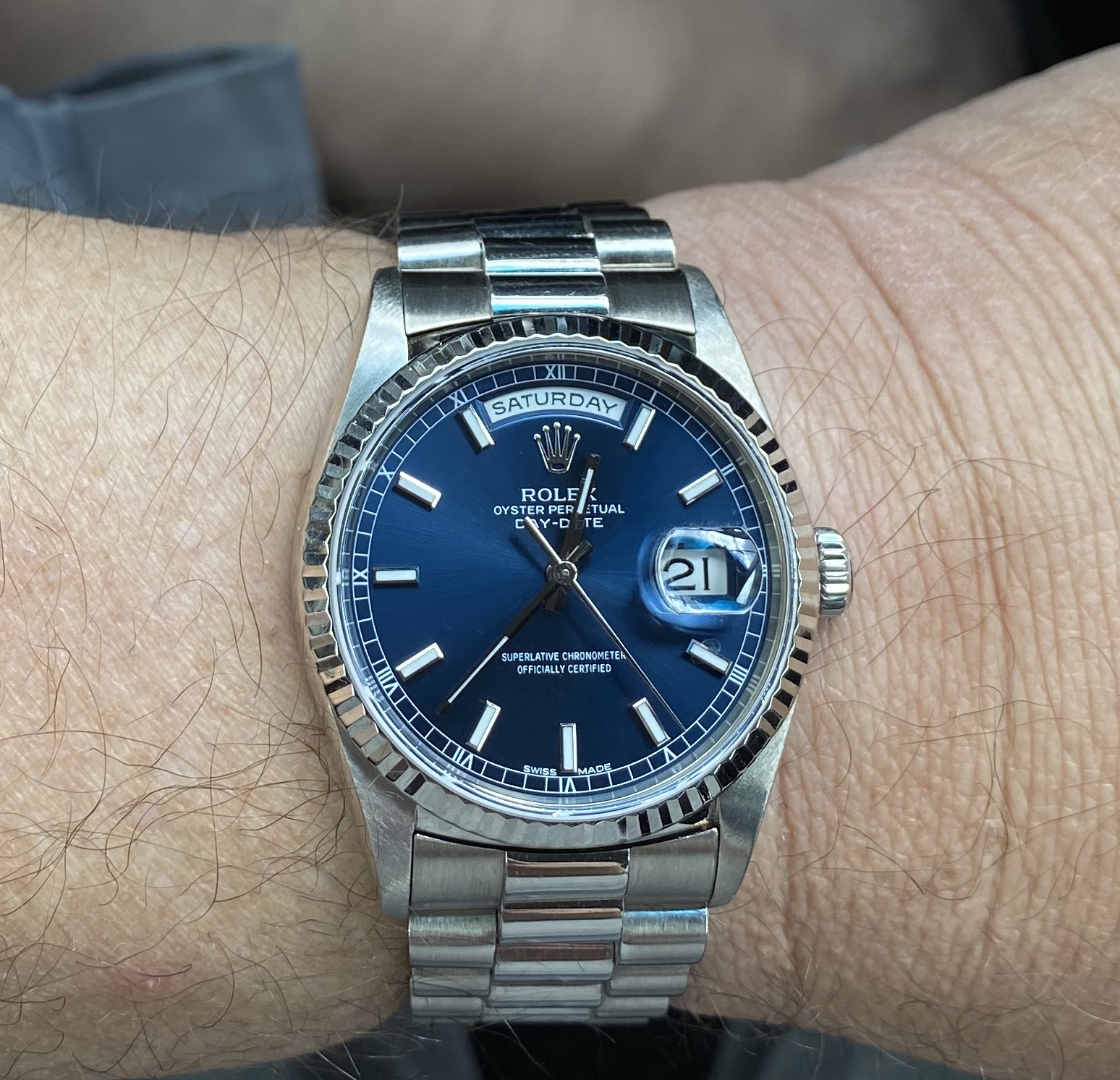 Another 80’s estate auction in a hotel ballroom. That day, there were at least a dozen white faced 70’s Rolexes, some with dates, but nothing special, and this one. I loved that mercury dial at first sight.