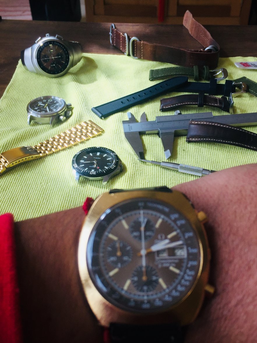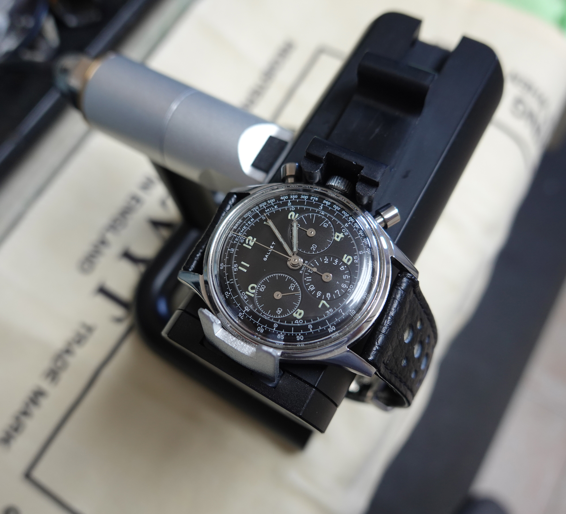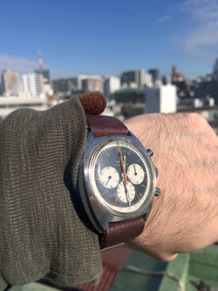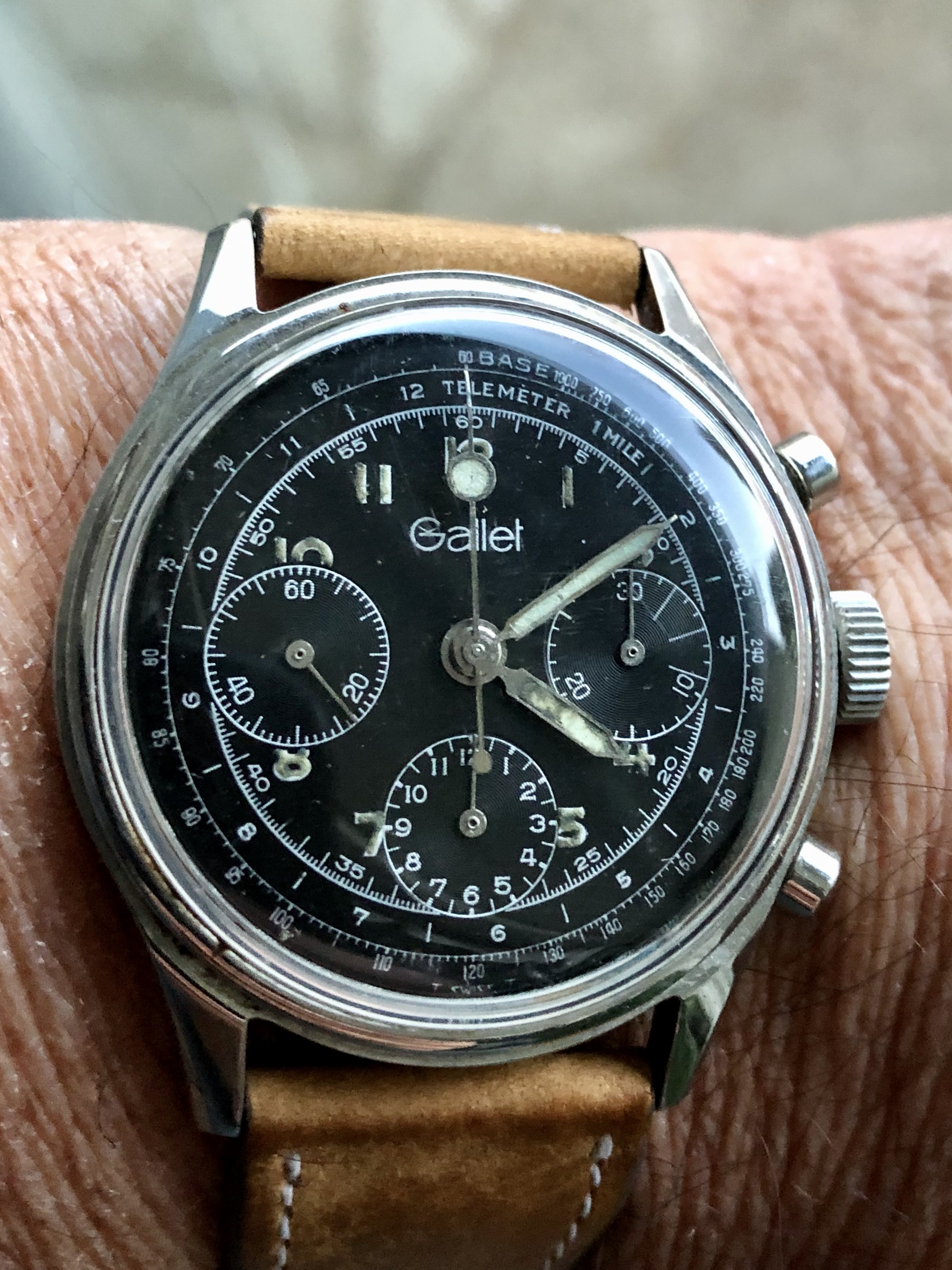 I had the pushers replaced and the central hands relumed as they were in pretty sad shape. There remains a small bit of rust after polishing the hands. Many would have left them as I found them, but they bothered me. I am a bit finicky. 😉..