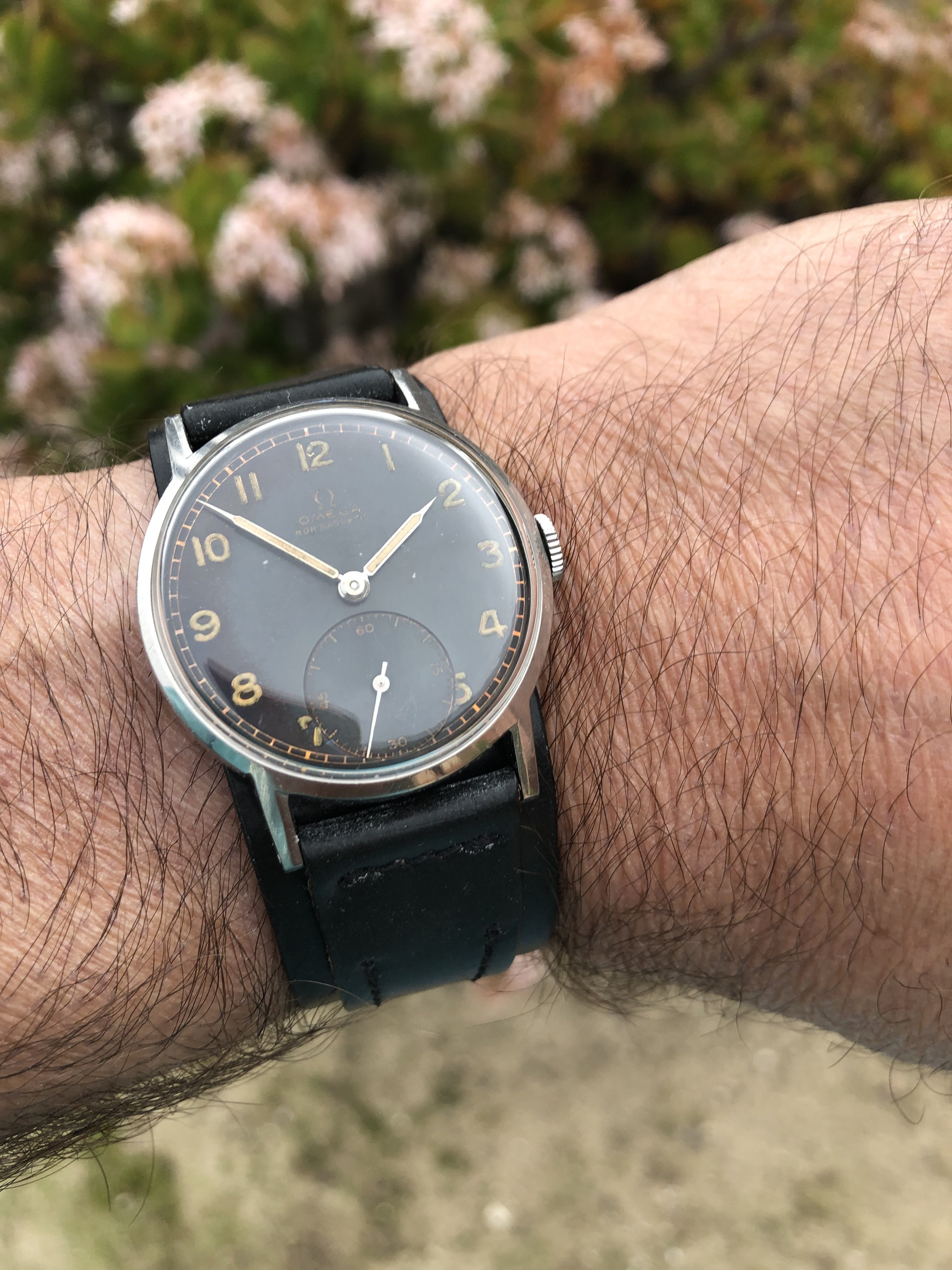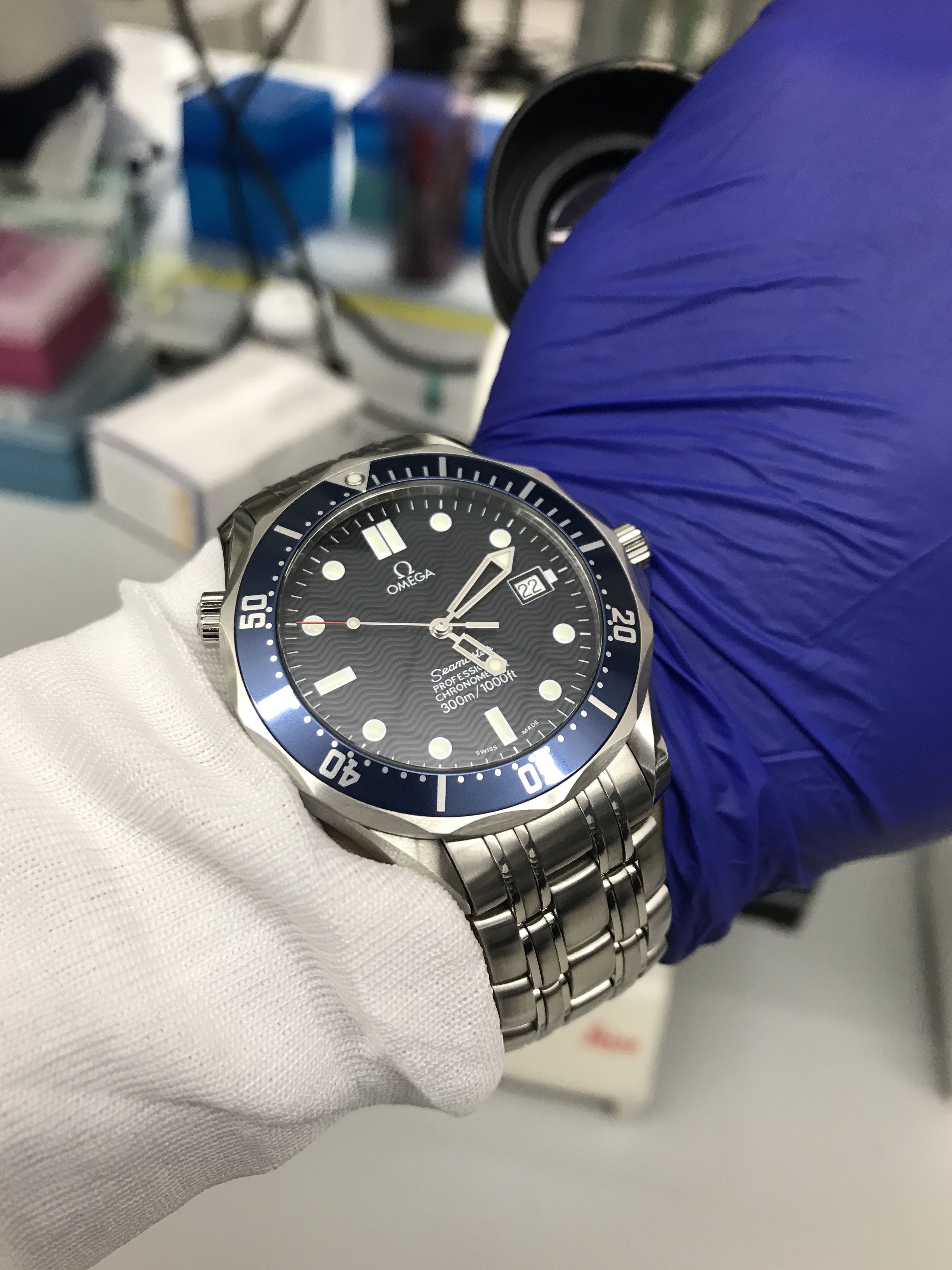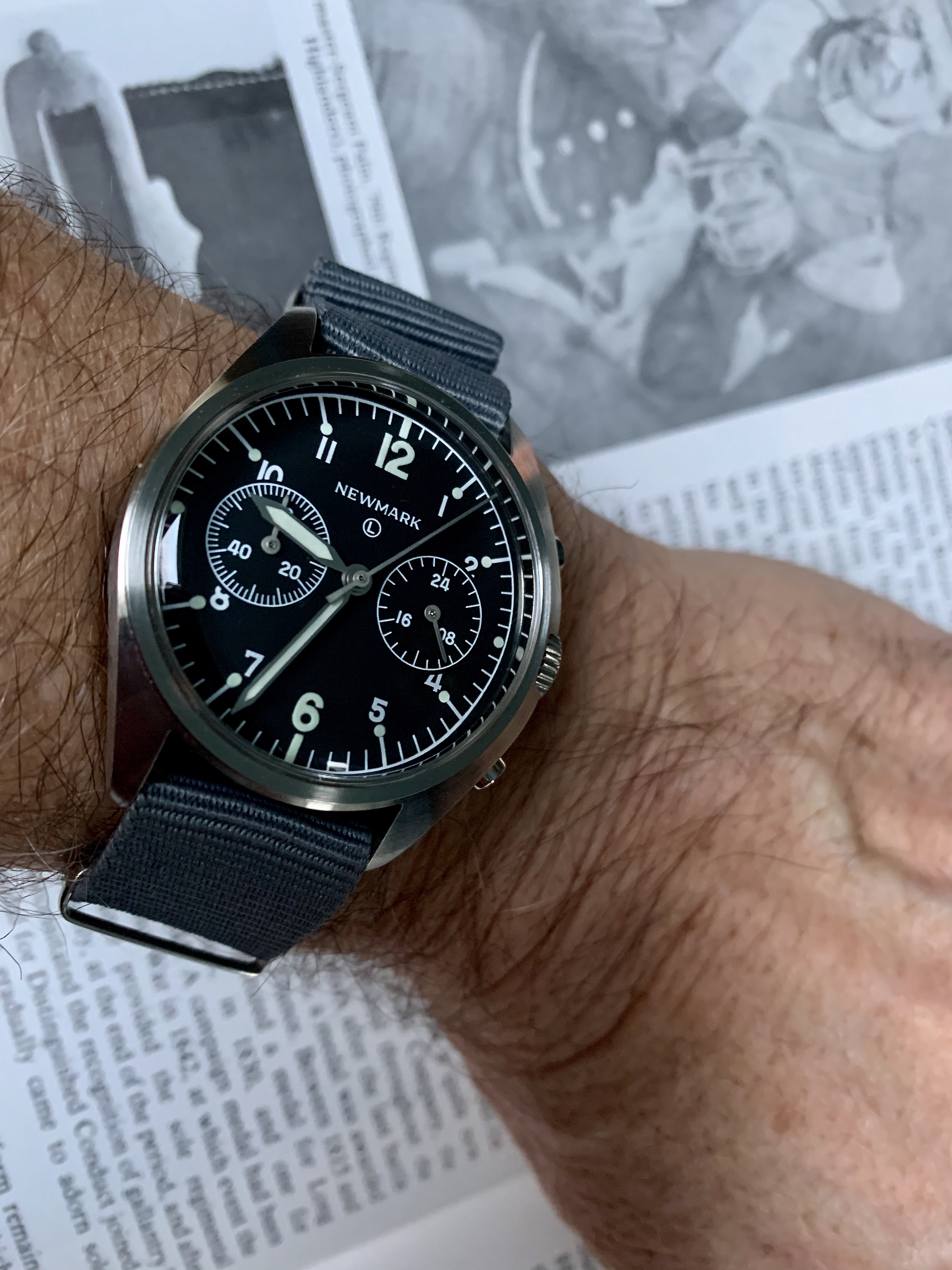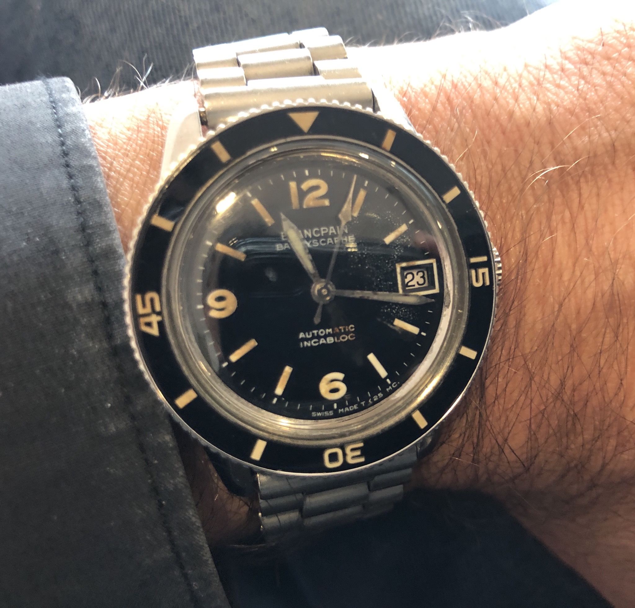 I had the pushers replaced and the central hands relumed as they were in pretty sad shape. There remains a small bit of rust after polishing the hands. Many would have left them as I found them, but they bothered me. I am a bit finicky. 😉..