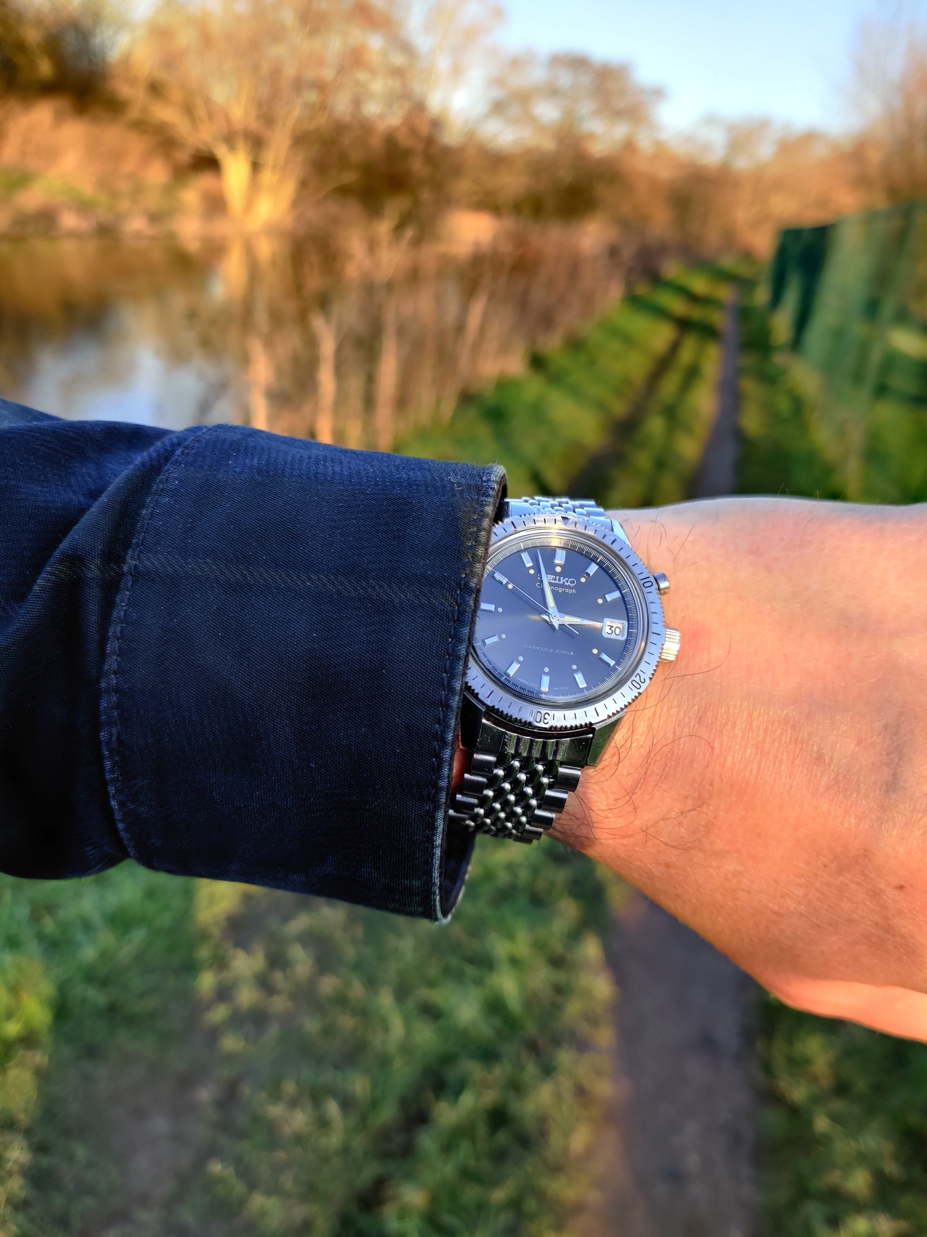 A Seiko 5717 one-button chrono from 1964, out for a walk along the canal on a sunny winter's afternoon; I think I read that this was the first chronograph produced from Japan.