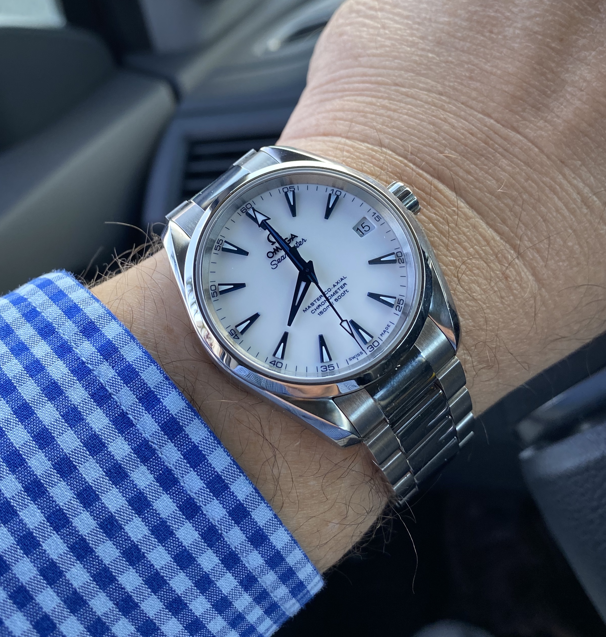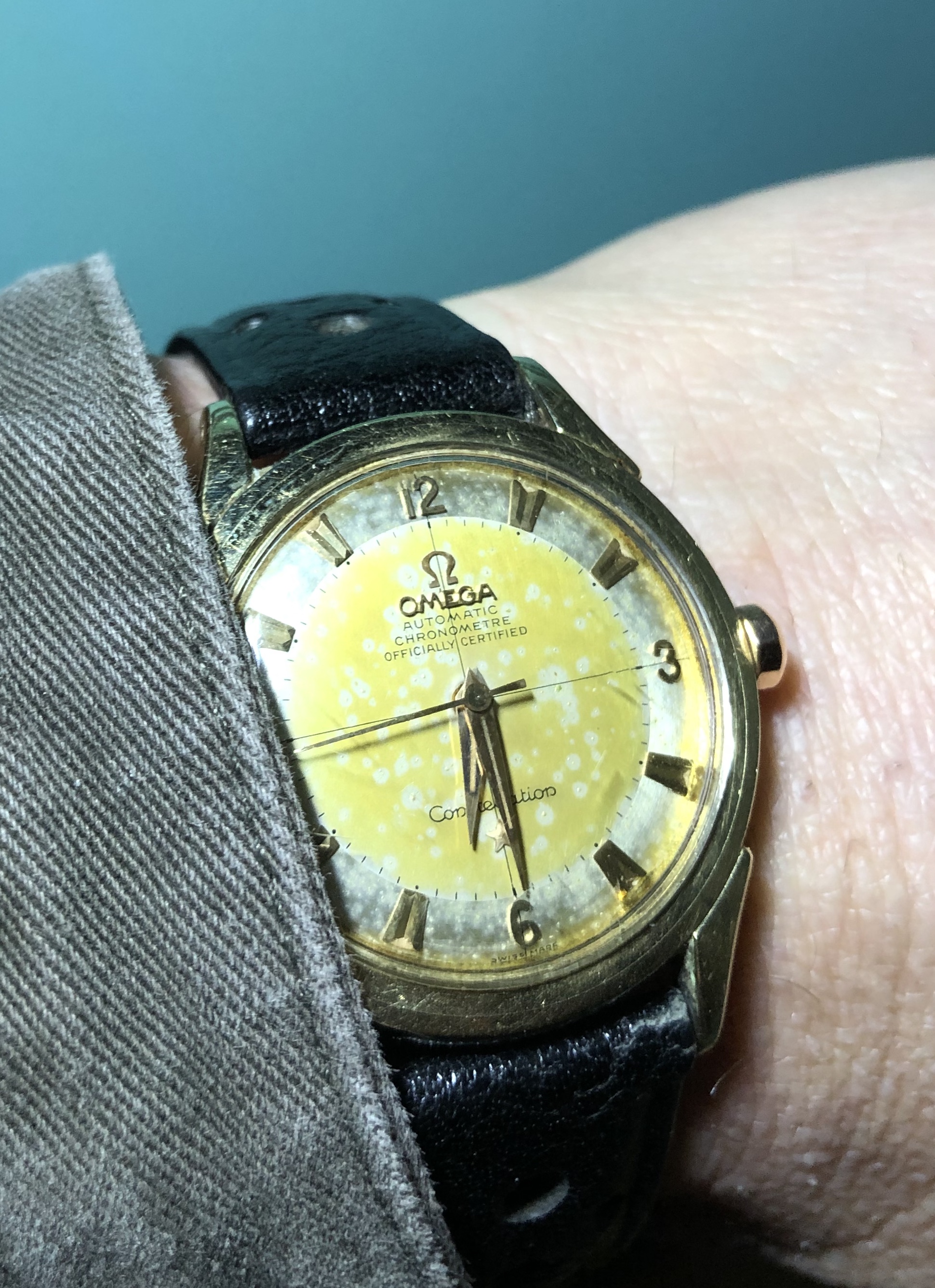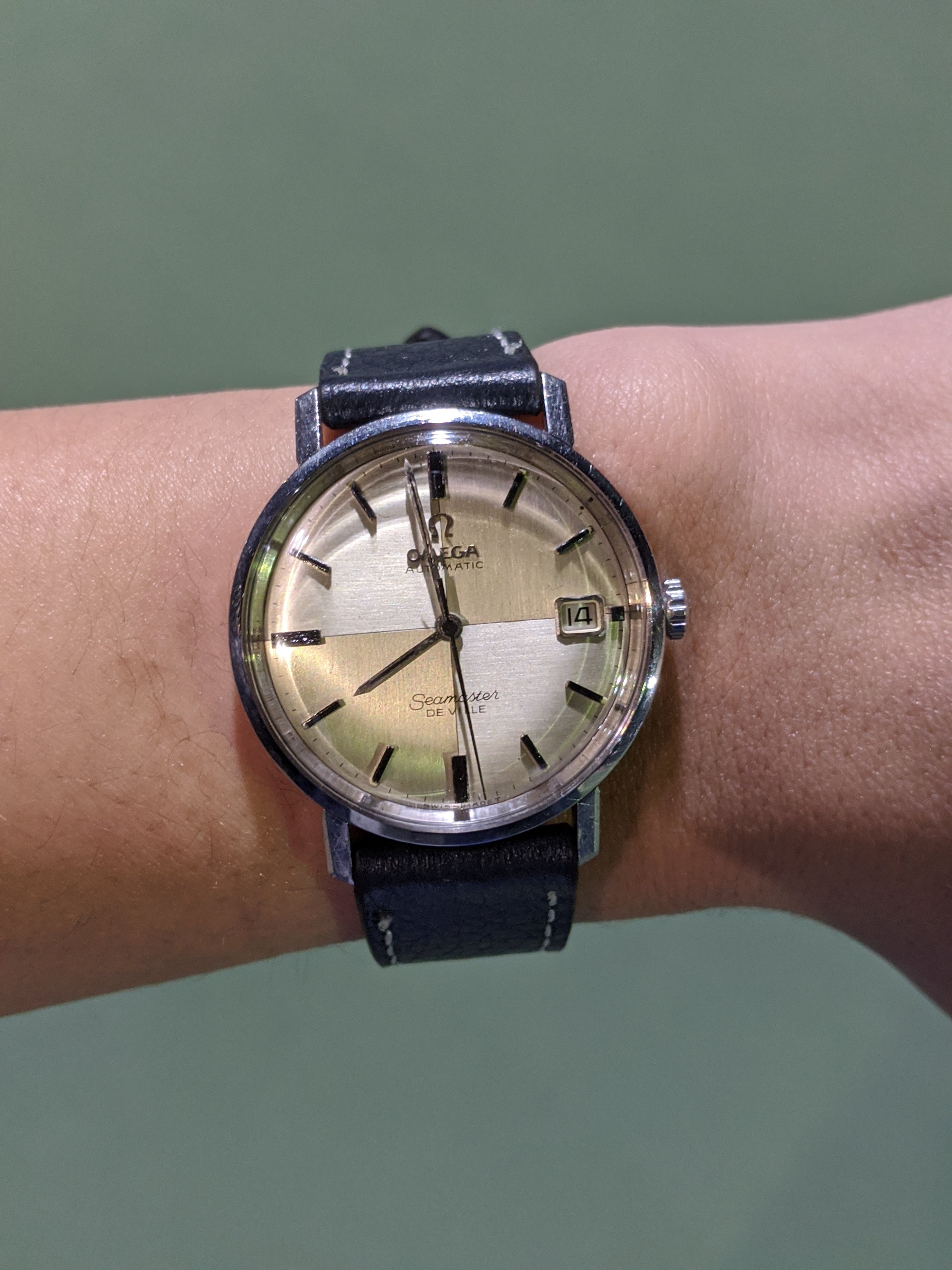 Recent acquisition - Seamaster De Ville with a crosshaired, quilt-like dial. Even though it's got some black paint in the wrong places, I quite like it. It adds contrast to the dial and sets the watch apart.