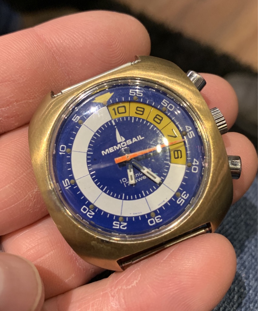 Memosail regatta countdown. Very 70's look. Note: polished down to the brass of the case.