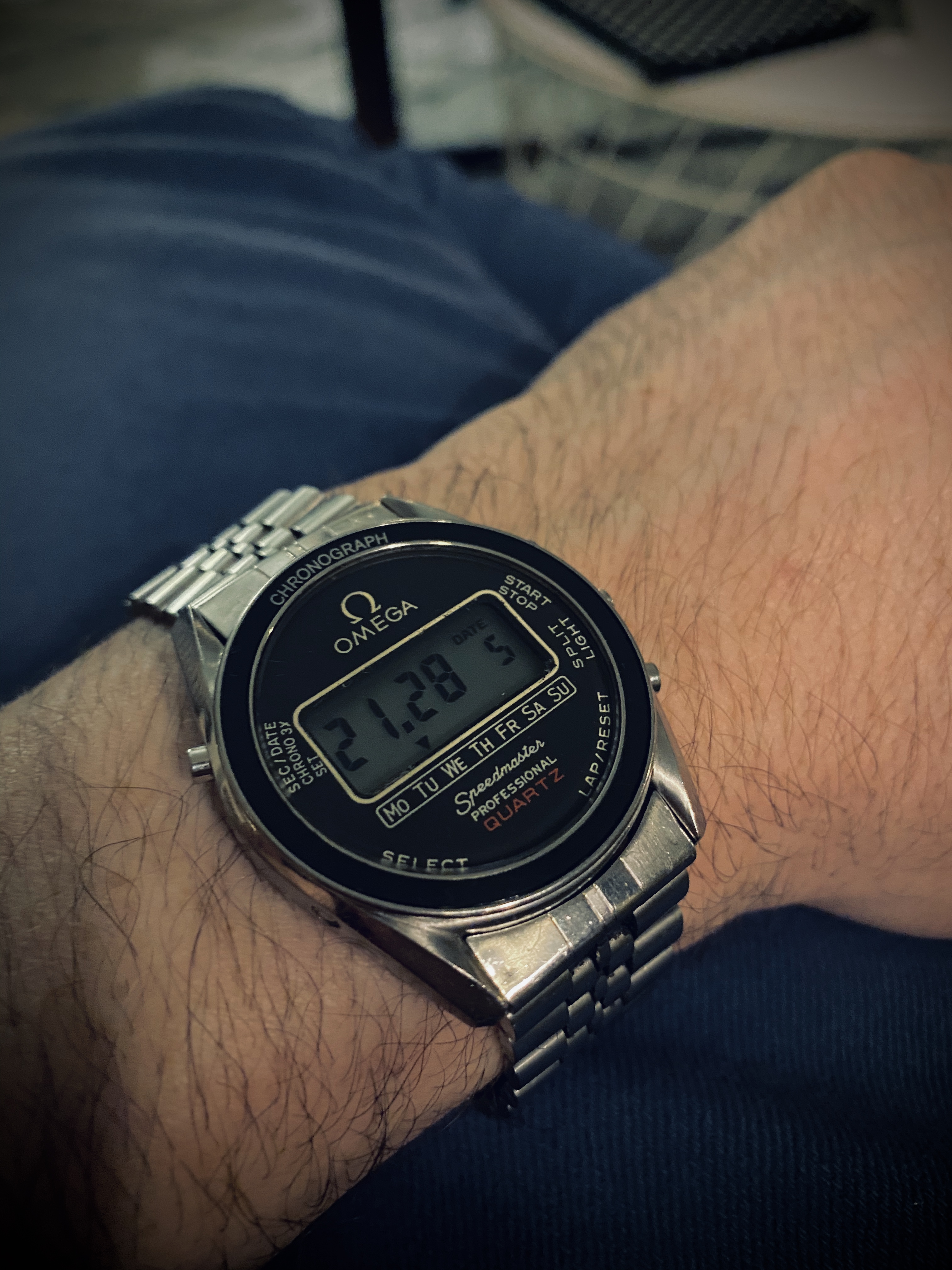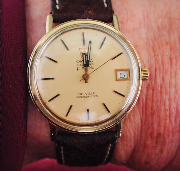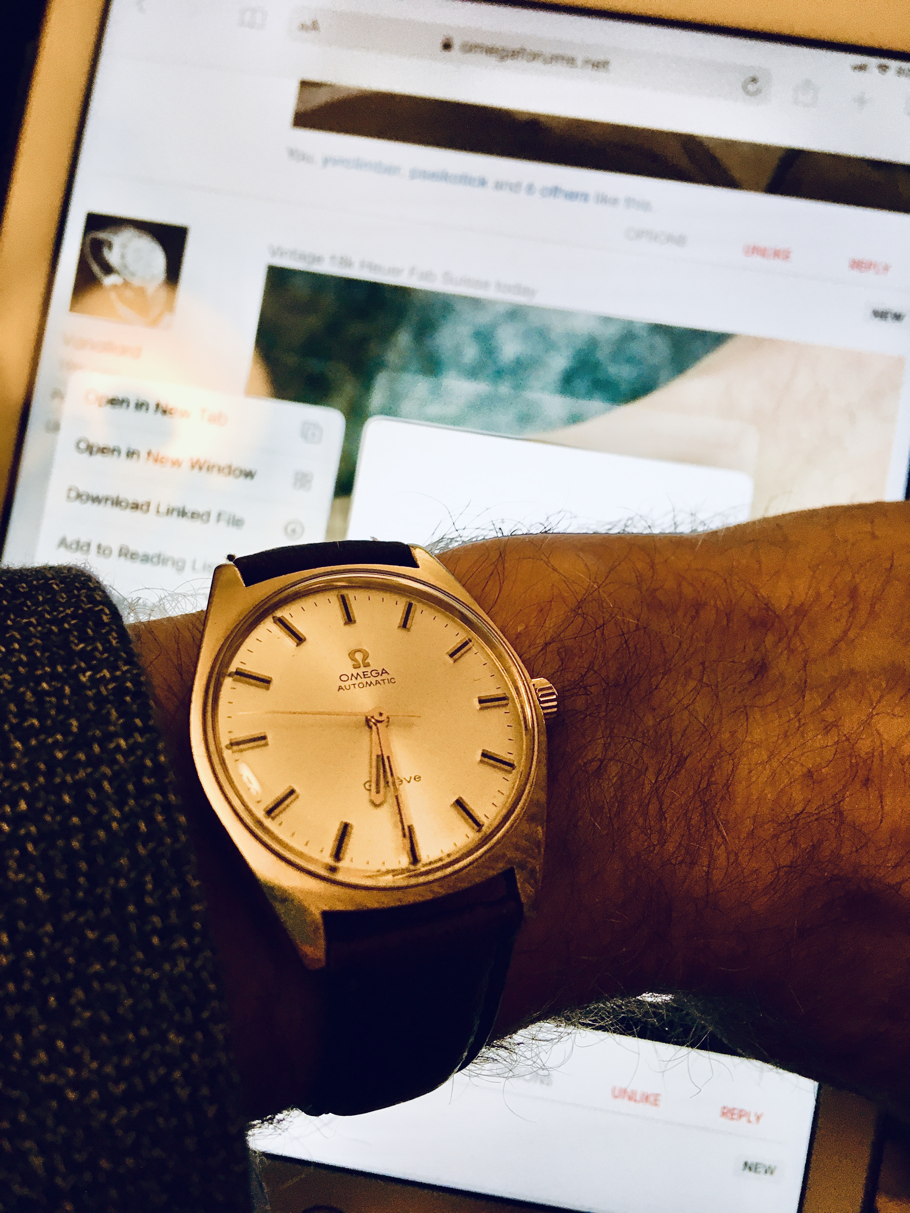 I received a technical question from a frequenter of this MB, on an Omega F300 (electronic), recently. I had to dig this one out so I could refer to it, in order to reply to him. Since I had it out of the vault, and it was on the correct day, I decided to put the Accutron Spaceview aside and give it a rest, and wear this one for a change. This watch is about 50 years old, and the gold filled case is in excellent condition, with no brass showing. The strap is a generic one made of bison hide. I quite like it. It came to me with the typical calendar malfunction (plastic date ring with chipped teeth). The owner had given up on it. 😀 I managed to find a replacement date ring from a collector in Mannheim, Germany (thanks eBay), and the watch is serviceable again.