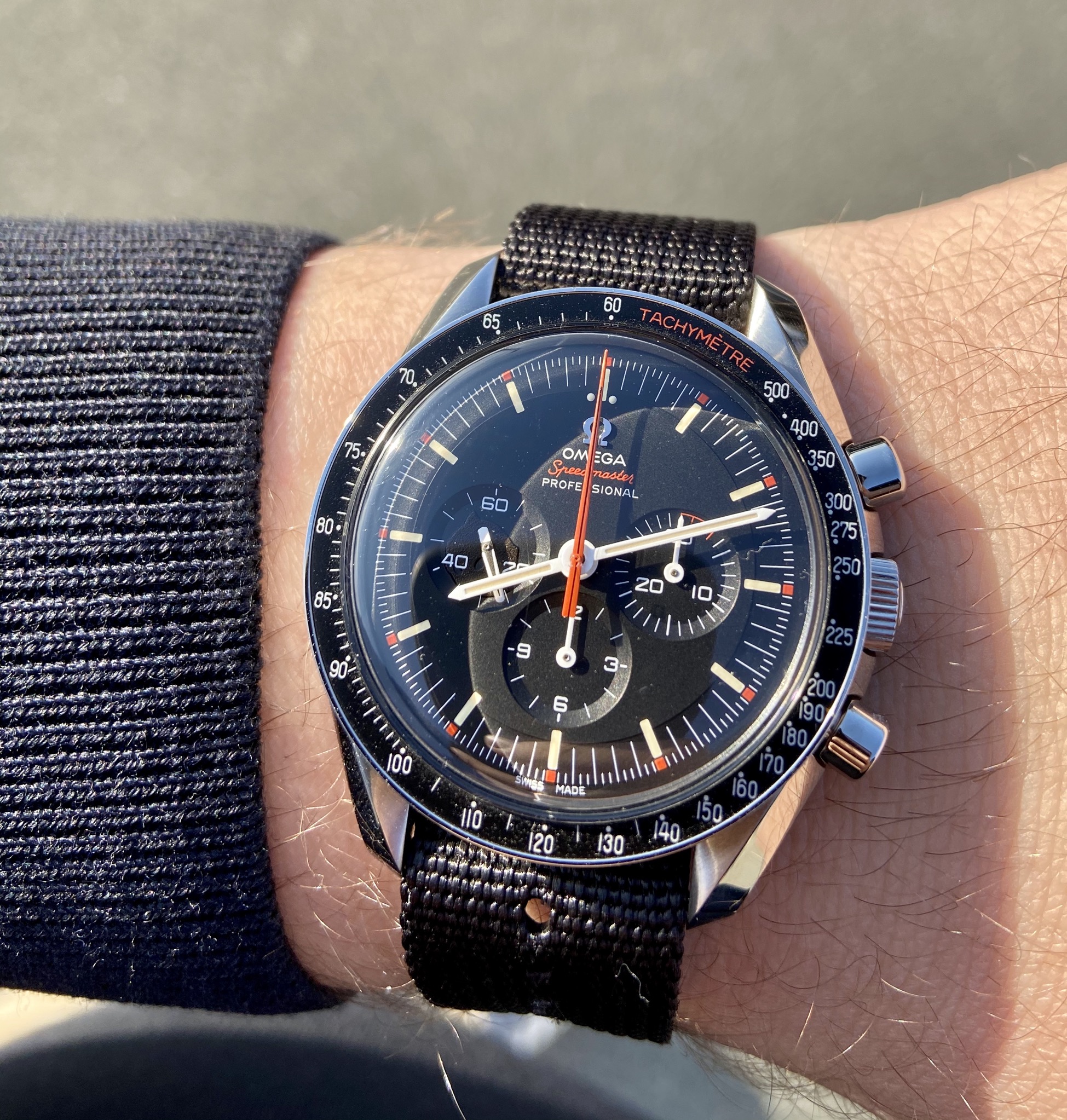 Cvalue13, watch arrived yesterday as I was leaving for work. I had to get a wrist shot after trying on the nylon strap that matches the funky dial. You are correct about the hands. The short one is for the hour. I am sure that these types of dials, however rare they are, have been perfected. Here is this morning’s shot. Watch works well!