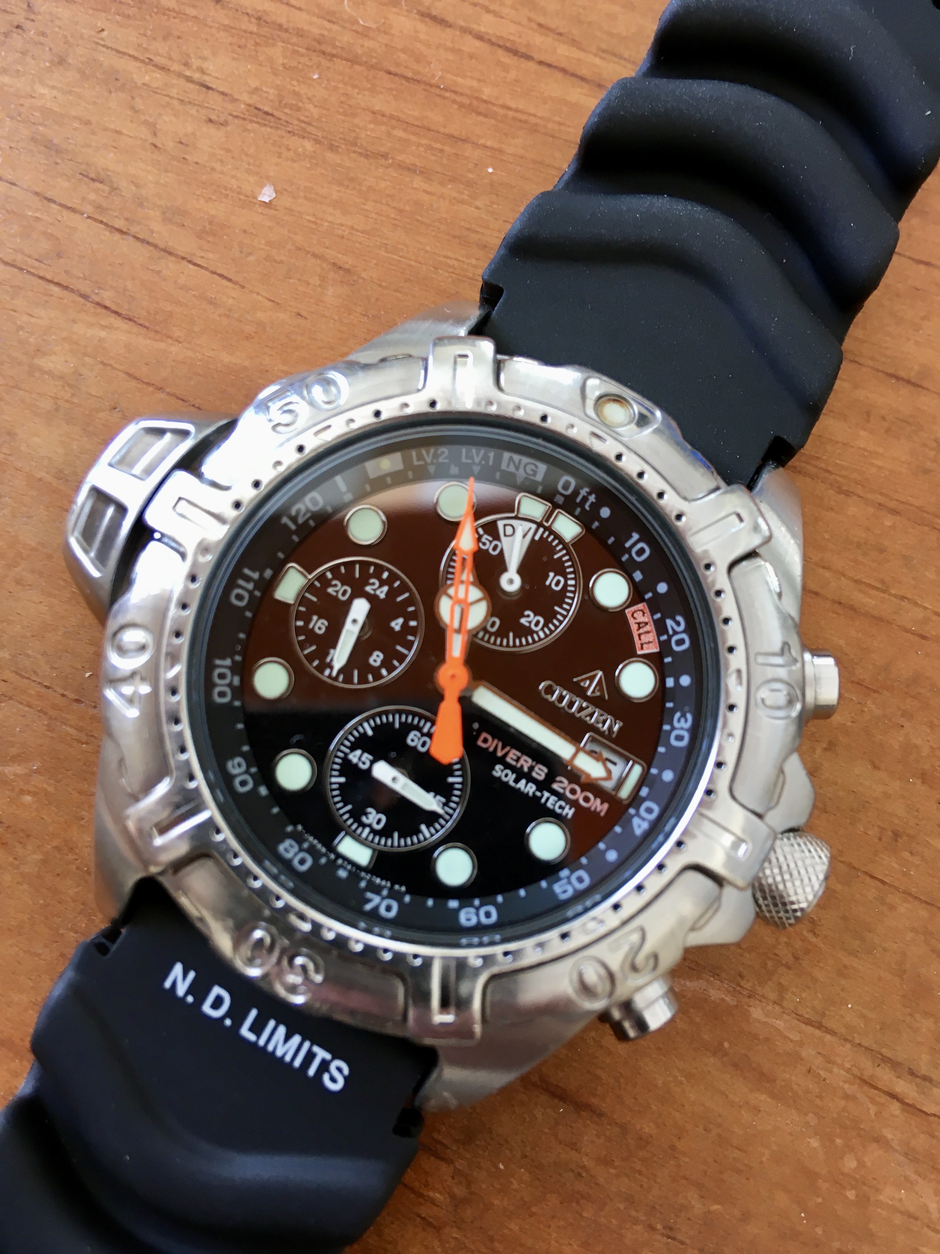 After 21 years of daily wear, I decided to replace some parts as it's become difficult to read at a glance under water. New crystal, seals, hands and crown. Pressure tested and ready to go. Treated myself to a new strap aswell!
