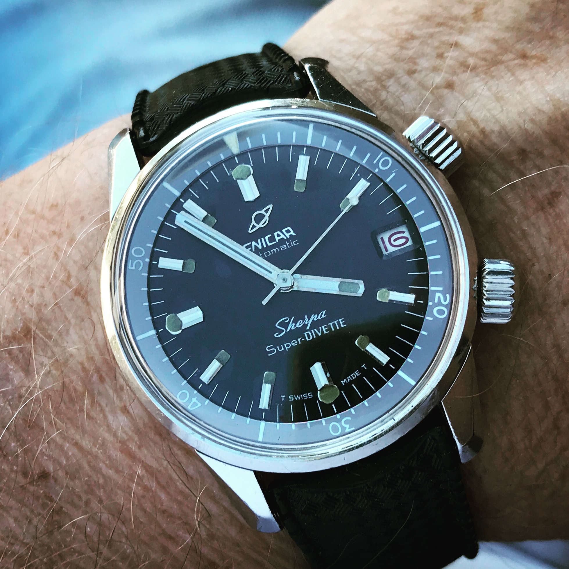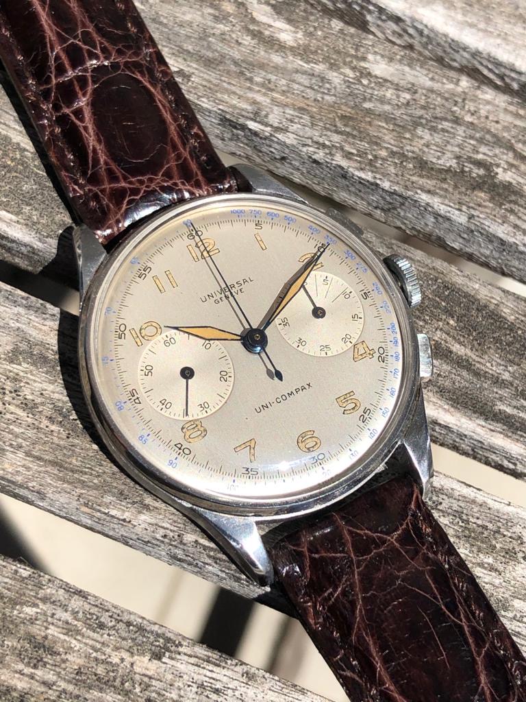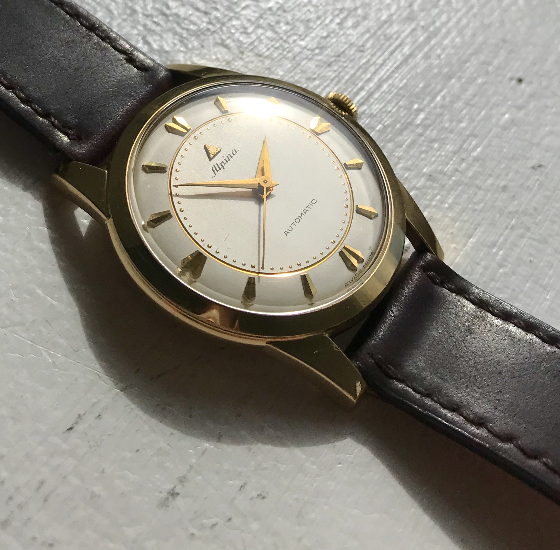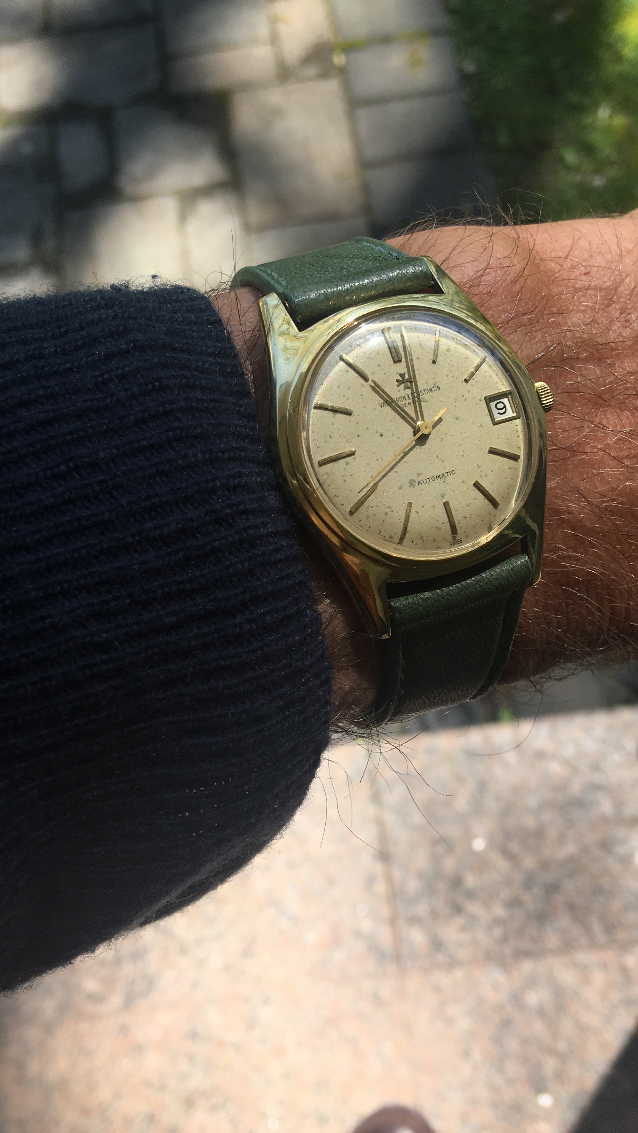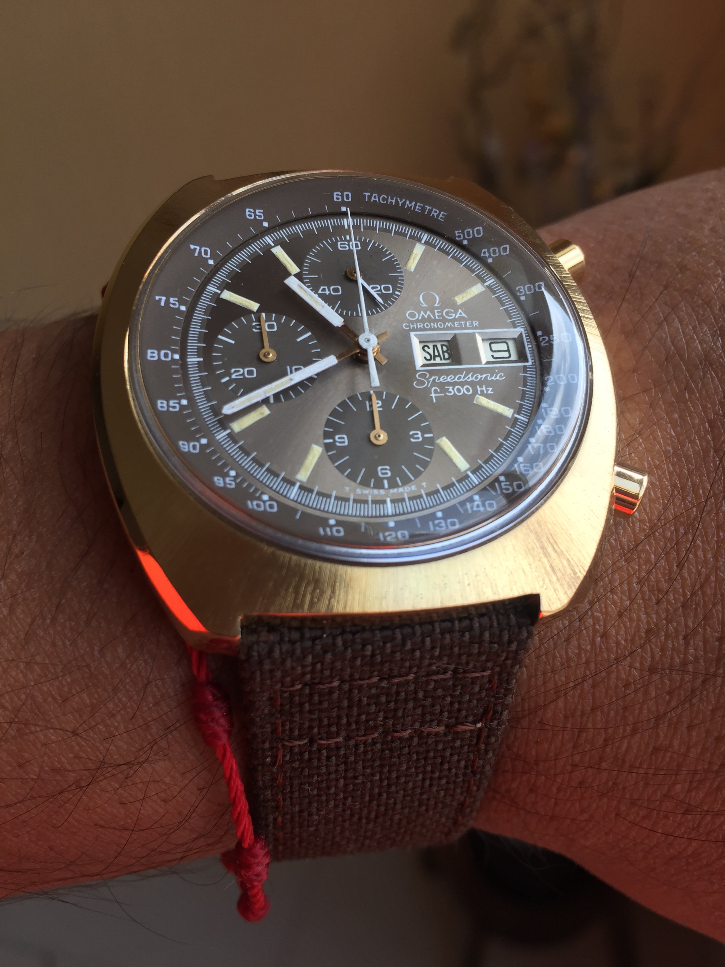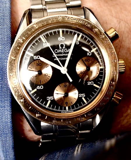 Same watch, different day. My 30 year old 18 karat rose gold and steel Speedmaster reduced, matte black dial, rose coloured sub dials. Came with a gawdawful brown crocodile grain strap. Why I didn’t keep the buckle, I don’t know. Only two-tone Omega bracelet available for this was steel and yellow gold! Ugh! So I bought a steel 1469 bracelet with 813 ends. Why Omega hadn’t fitted this watch with rose gold crown and pushers, I do not know. Produced only for Europe, and for a limited time might explain it.