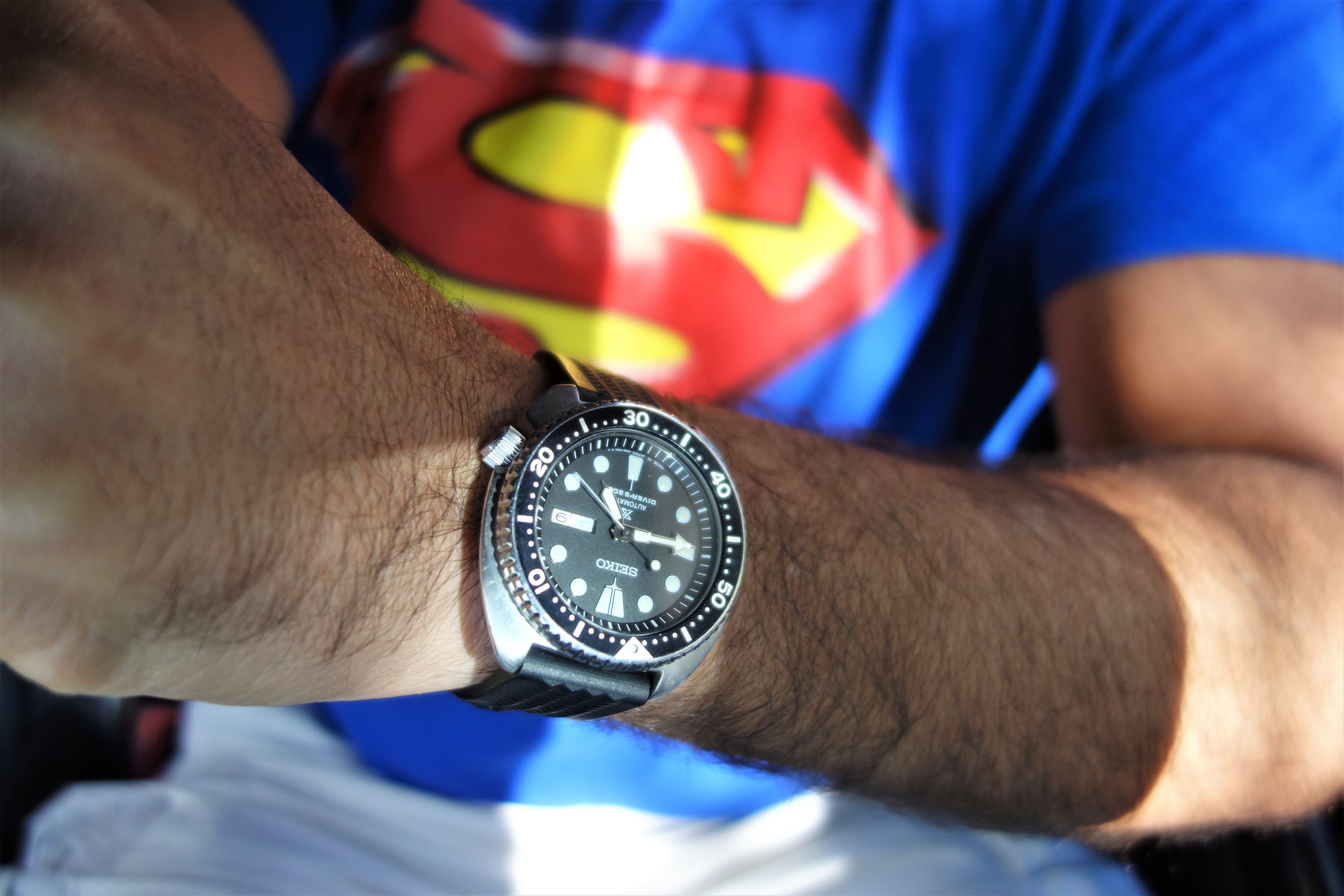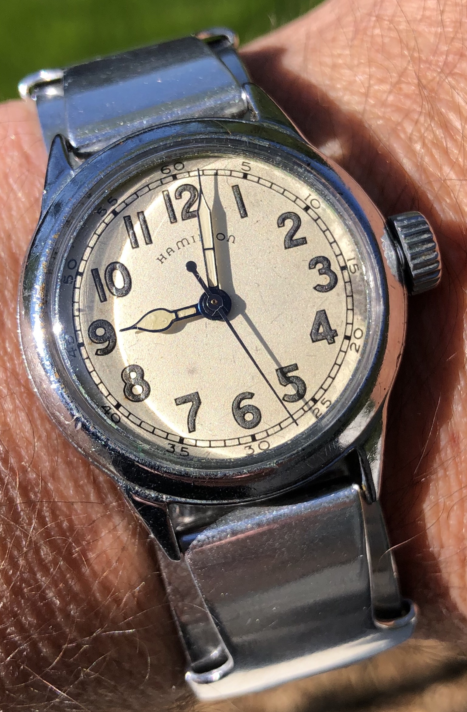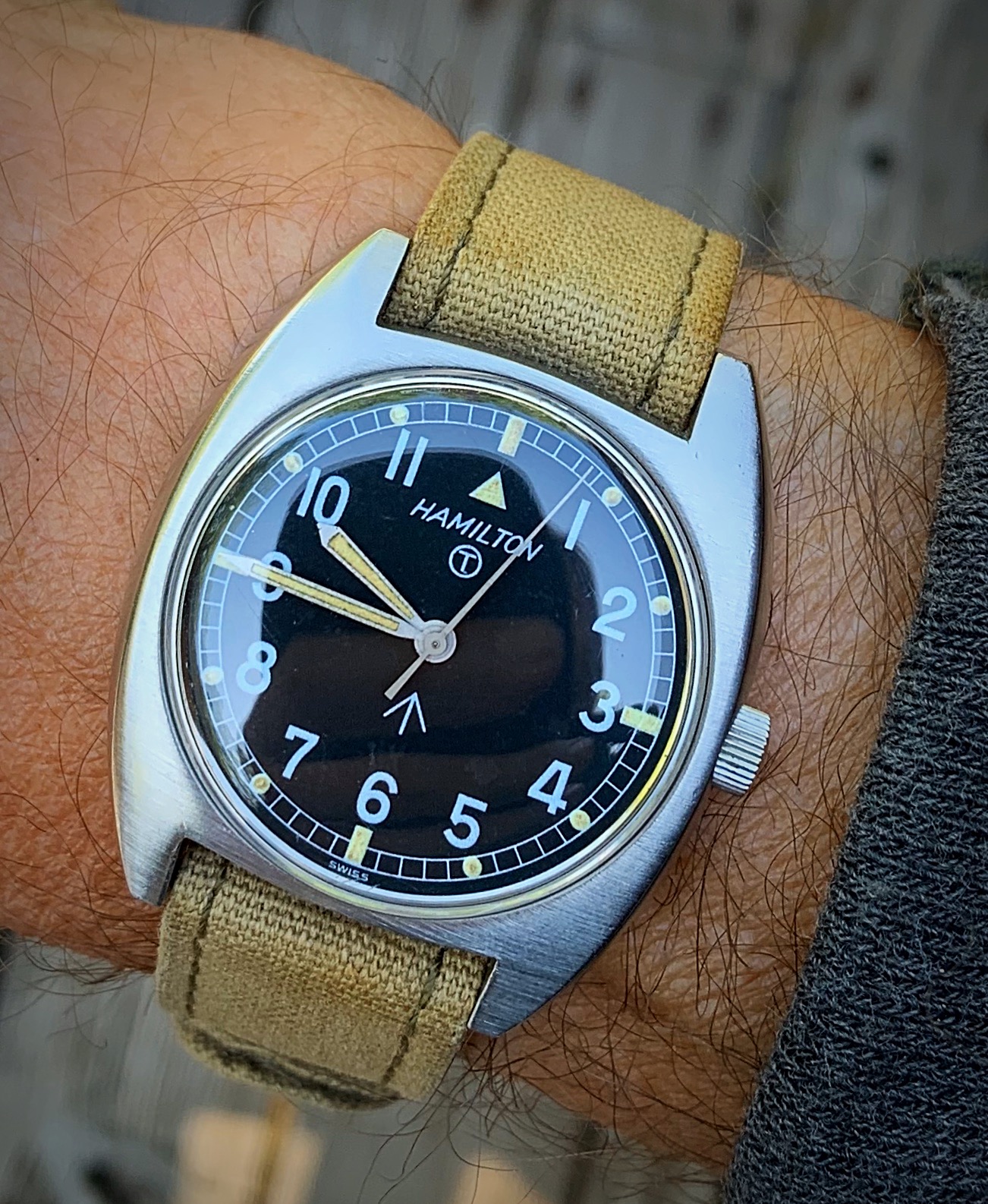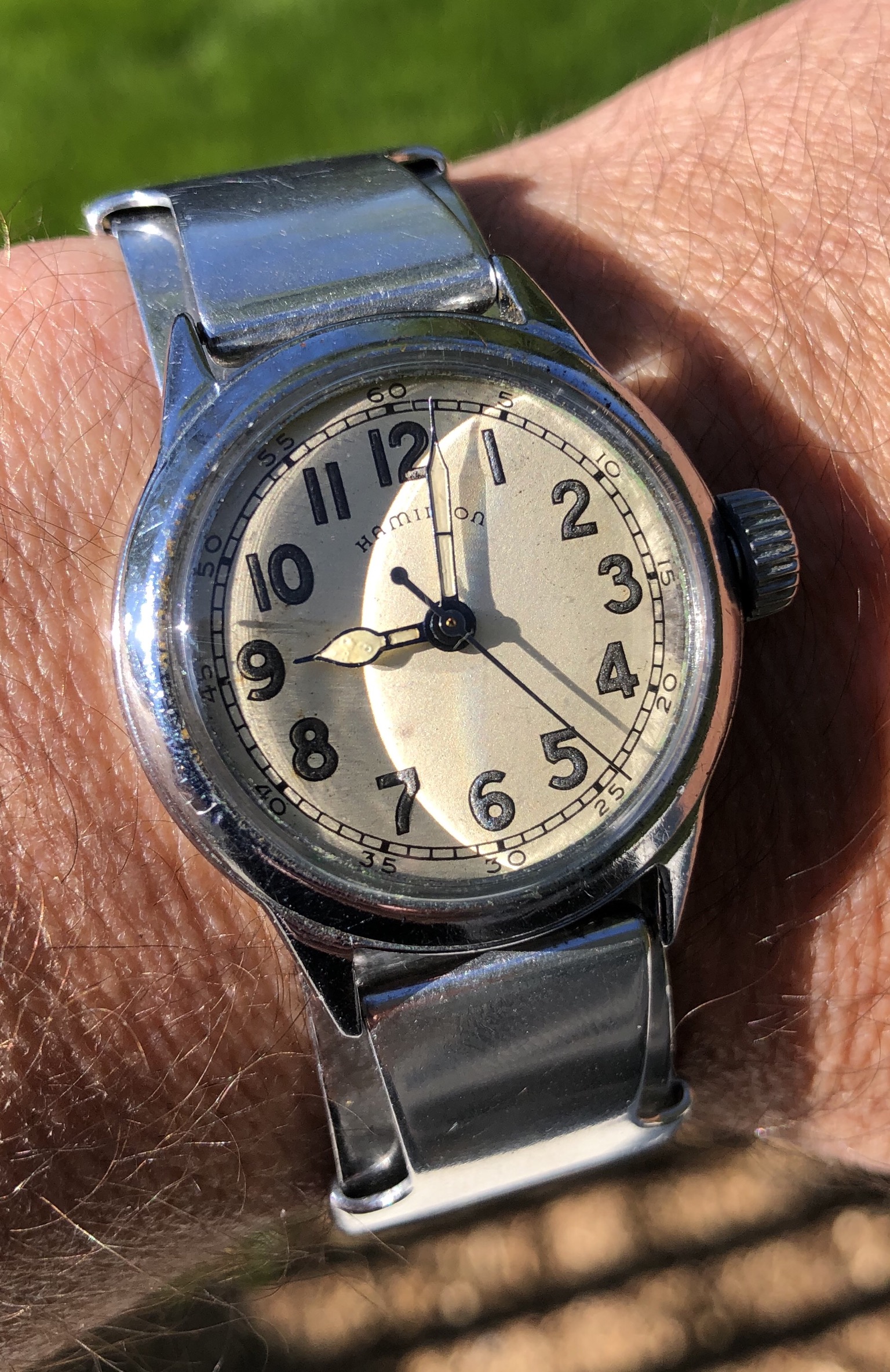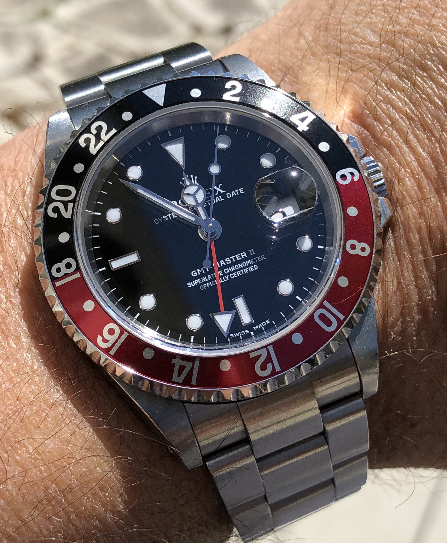 Same watch, different day. My 30 year old 18 karat rose gold and steel Speedmaster reduced, matte black dial, rose coloured sub dials. Came with a gawdawful brown crocodile grain strap. Why I didn’t keep the buckle, I don’t know. Only two-tone Omega bracelet available for this was steel and yellow gold! Ugh! So I bought a steel 1469 bracelet with 813 ends. Why Omega hadn’t fitted this watch with rose gold crown and pushers, I do not know. Produced only for Europe, and for a limited time might explain it.