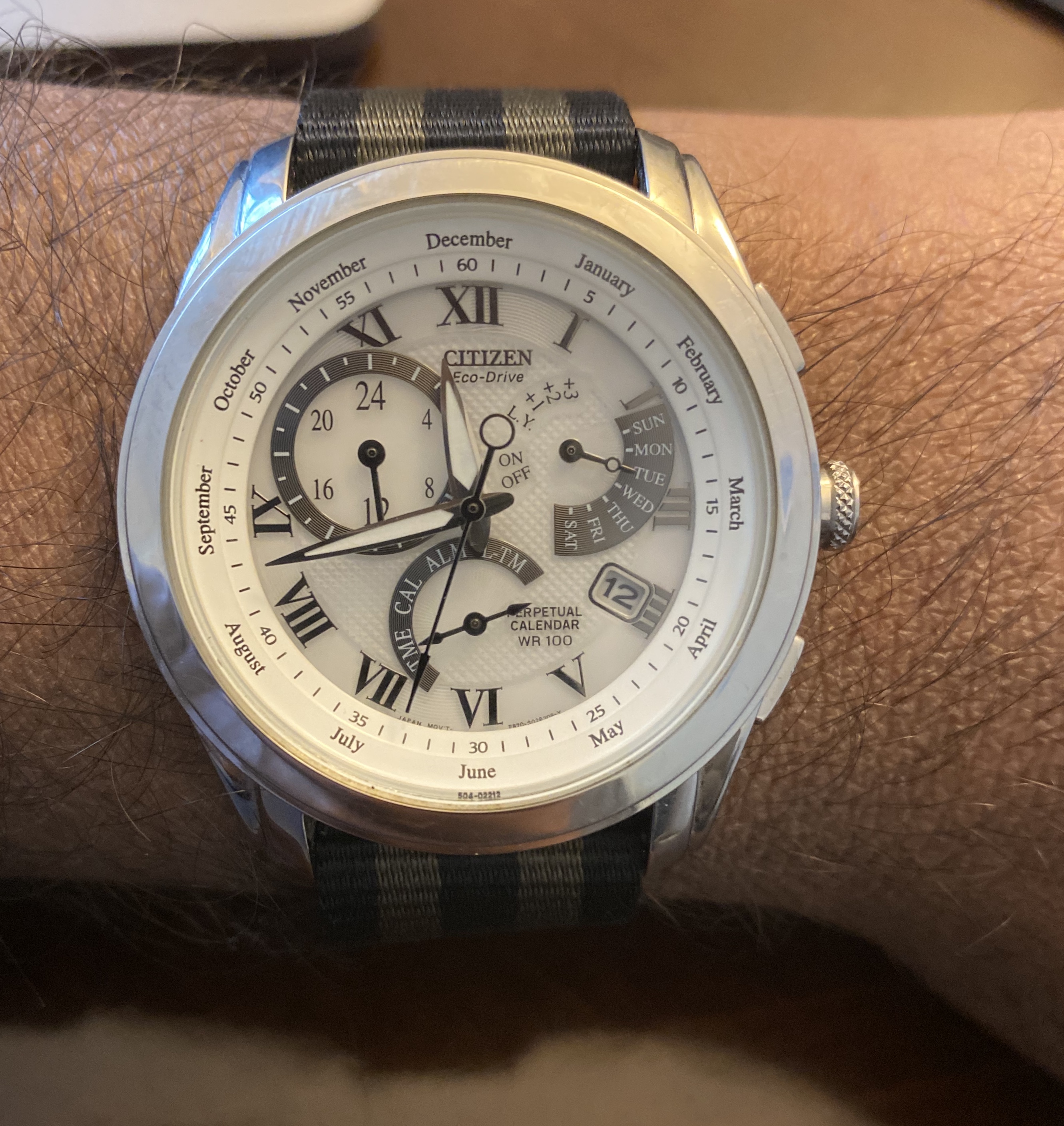 My old Citizen Eco Drive perpetual calendar. Took it out of the box after 8 years or so. Kept it on the Window for some sunlight and started running like a charm again.