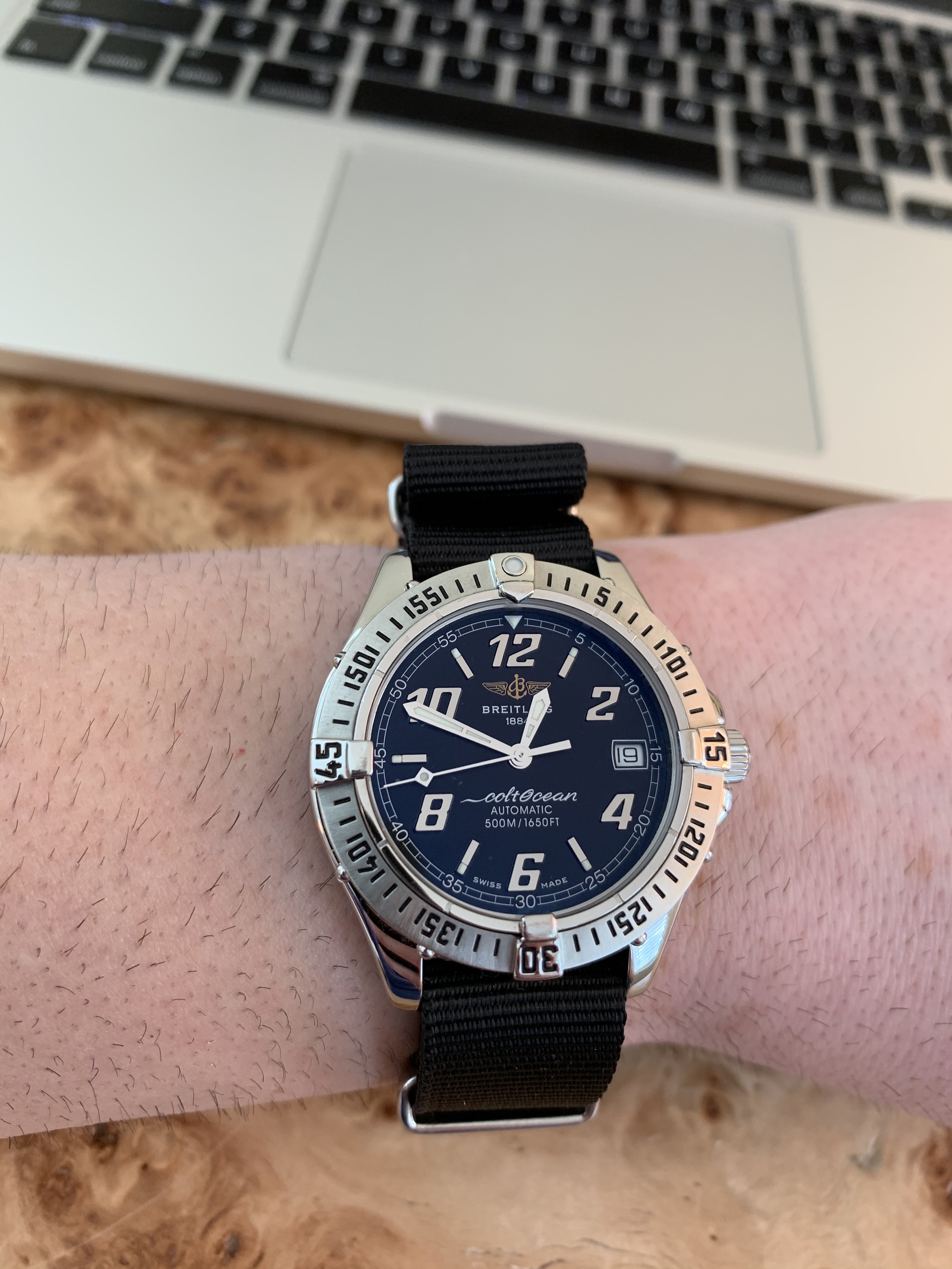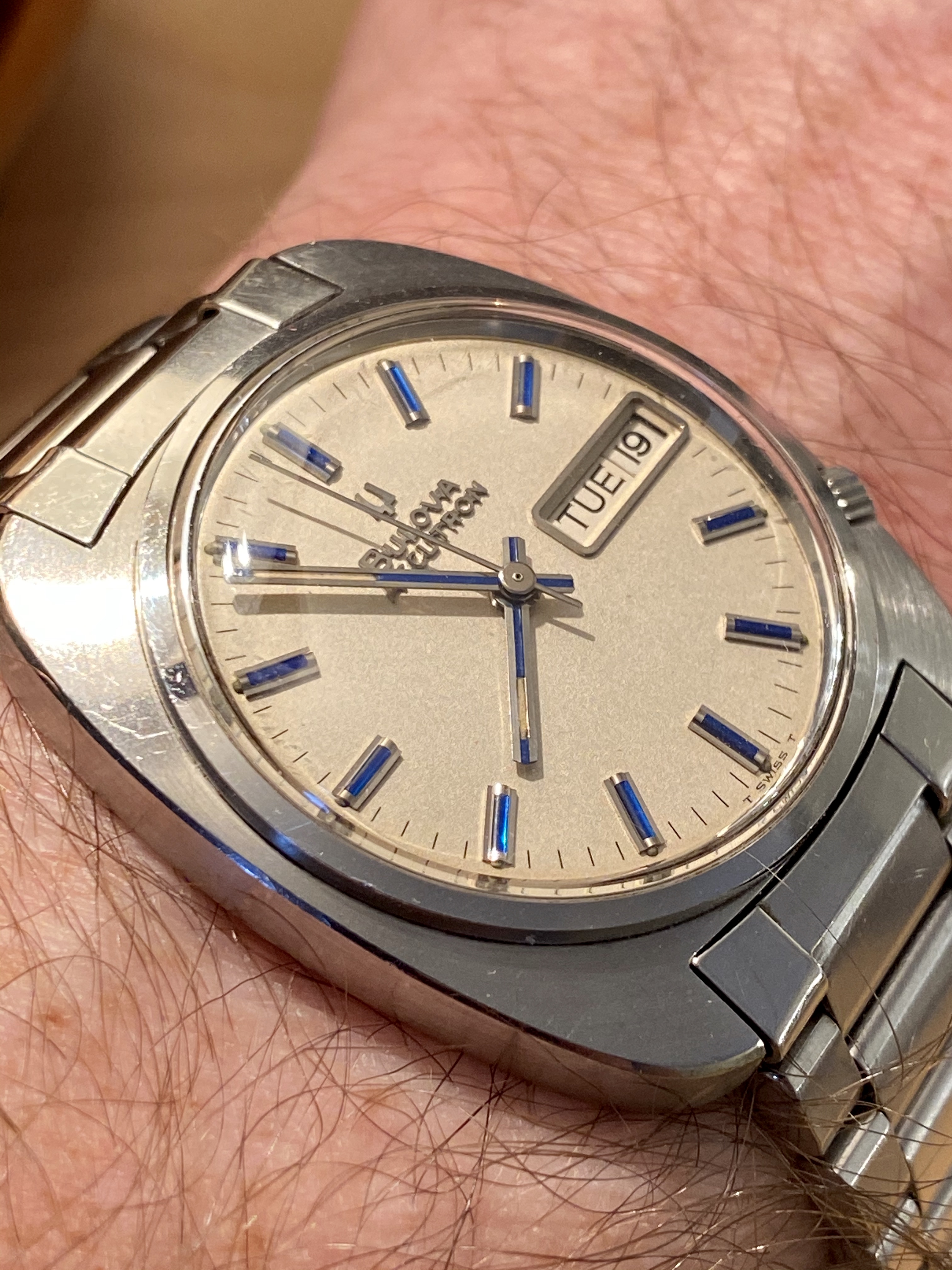 This one. Why? Two reasons. Inclination being the primary one. But also, a week or two ago, when I had my storage case out of the vault, I noticed the date was set on the 17th. Aha, thought I! I must wear this soon, since the date will be easy to set. So there you have it. This one, along with my grade 1623 Waltham Vanguard, are my watches of choice, today.