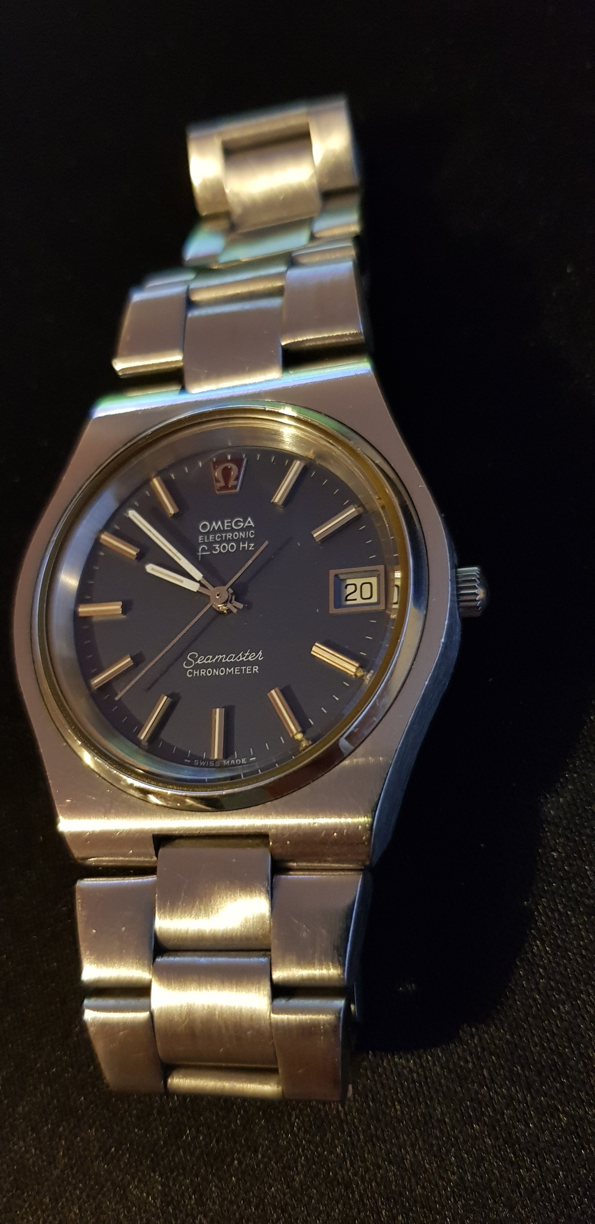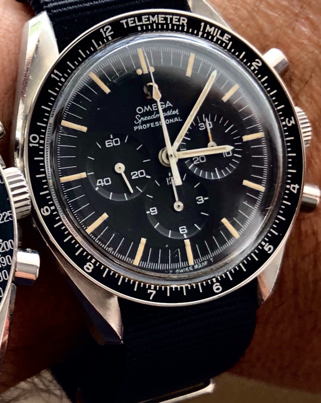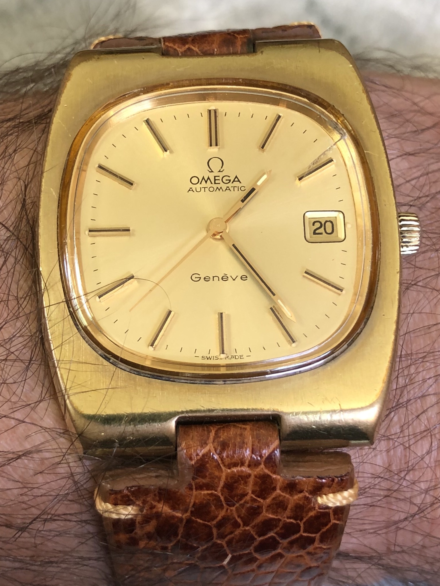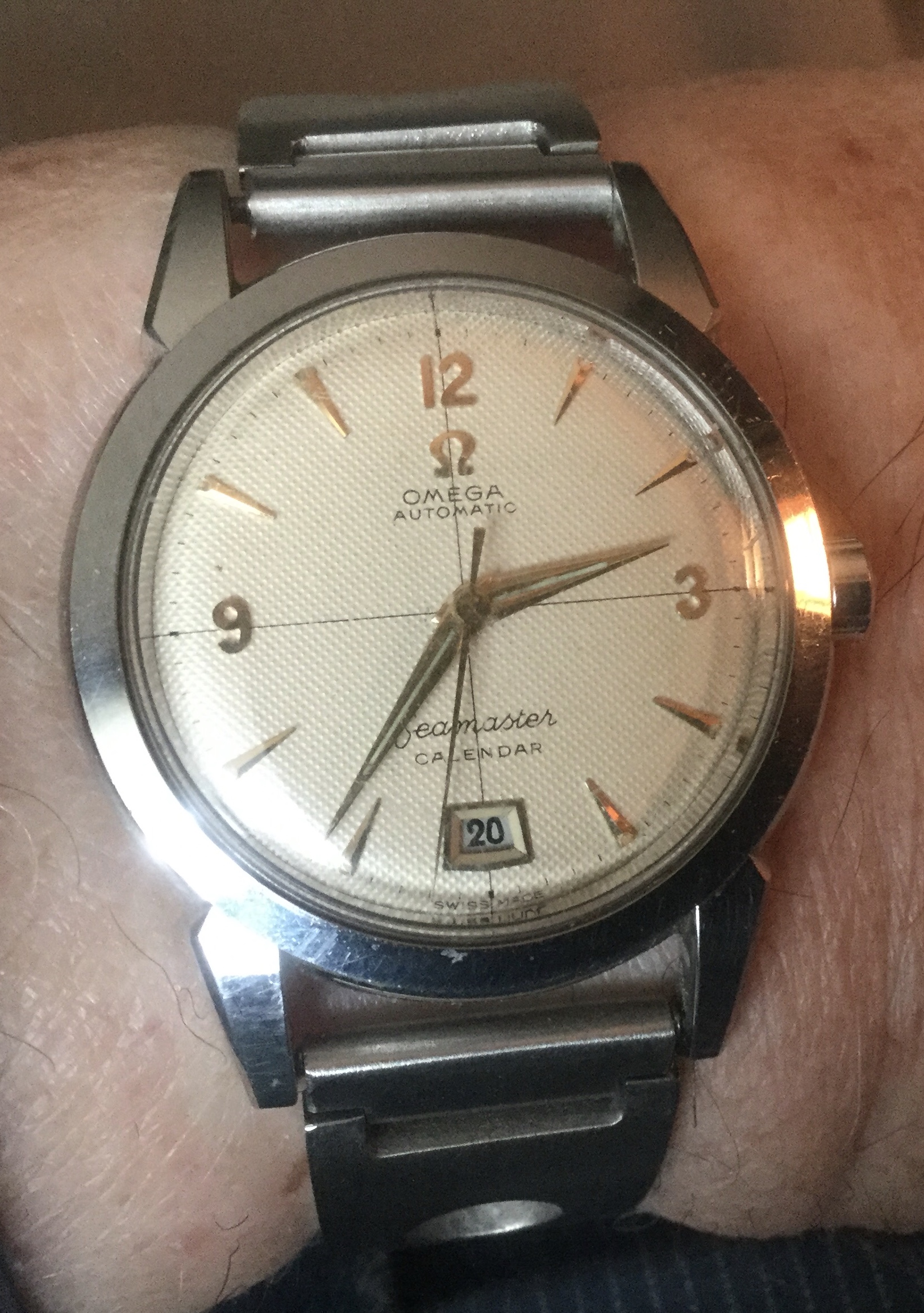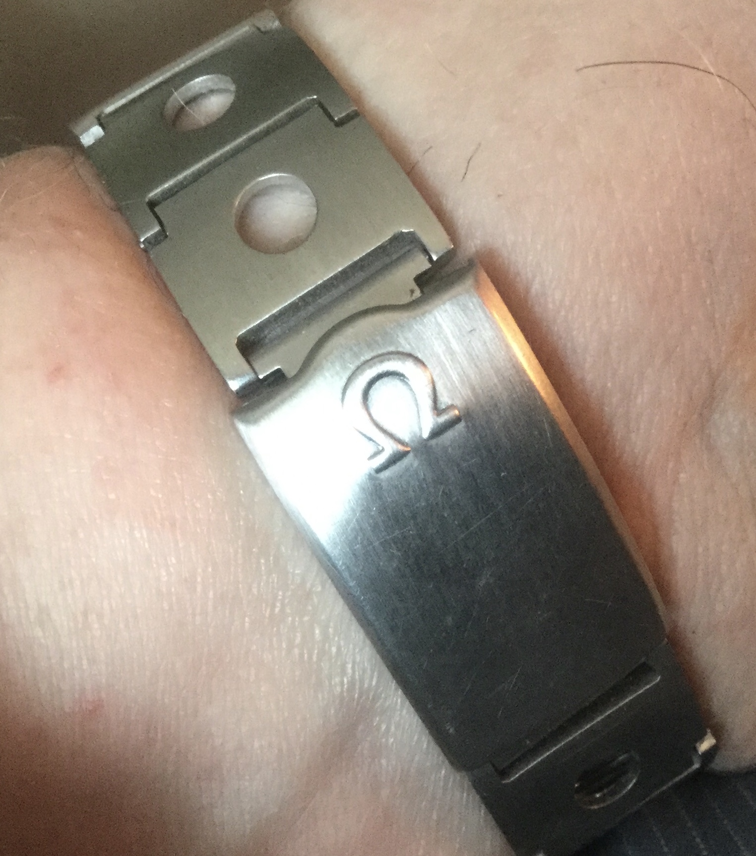 Same watch as yesterday, with a difference. In rummaging through my stash, looking for something else, what do I find but a steel bracelet with an Omega logo on the buckle! It is likely aftermarket because the buckle isn’t marked Omega anywhere else, other than on the buckle.