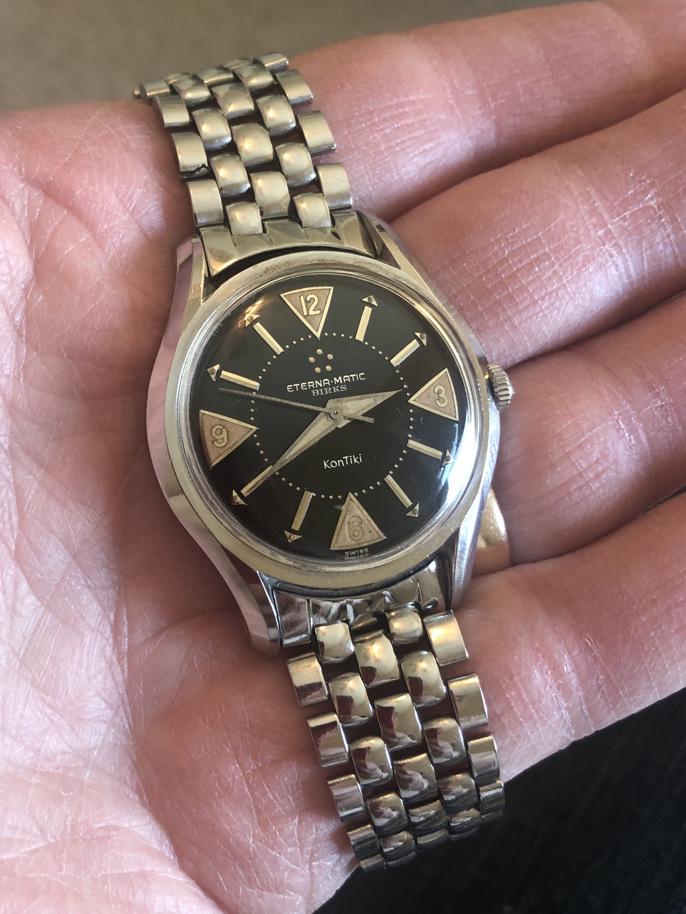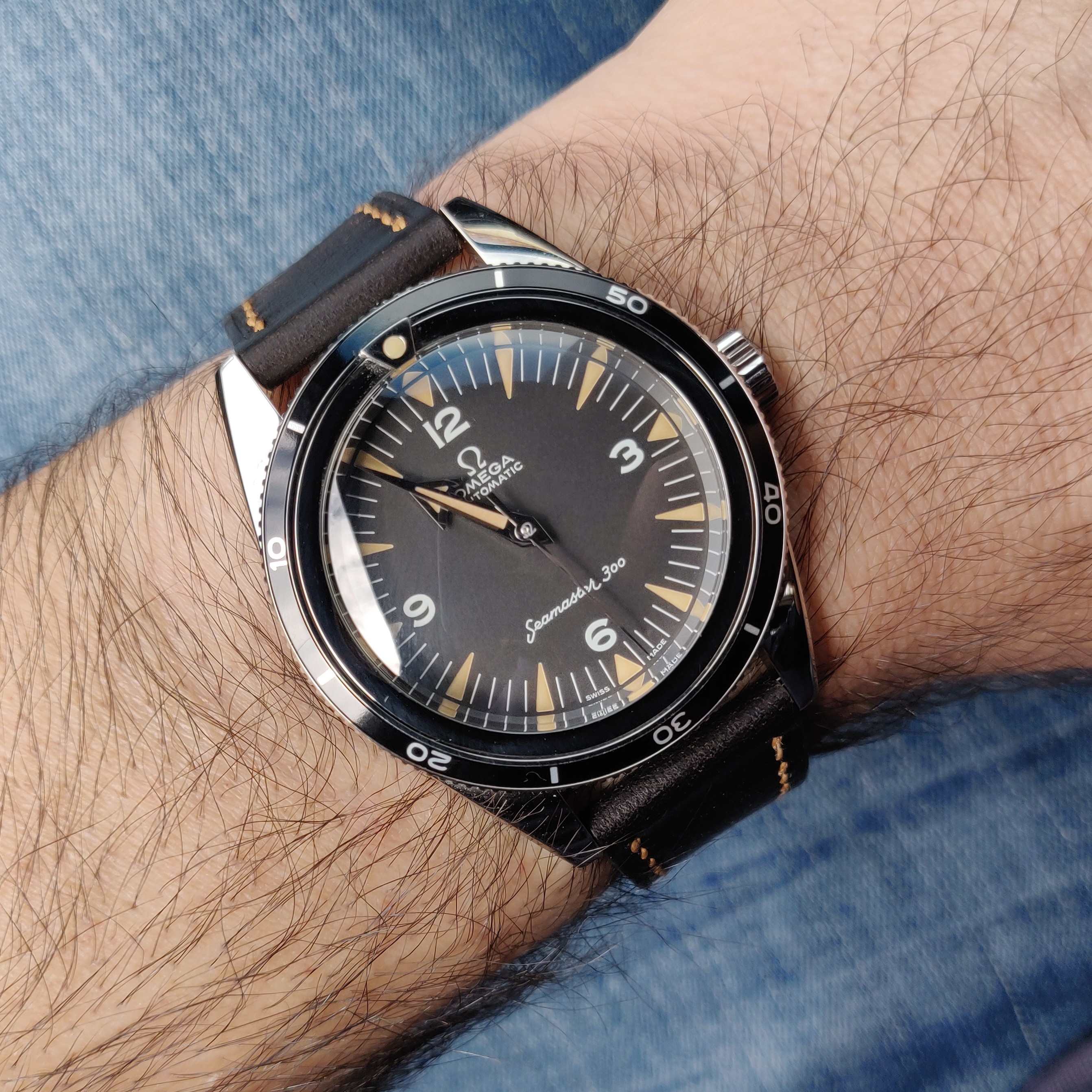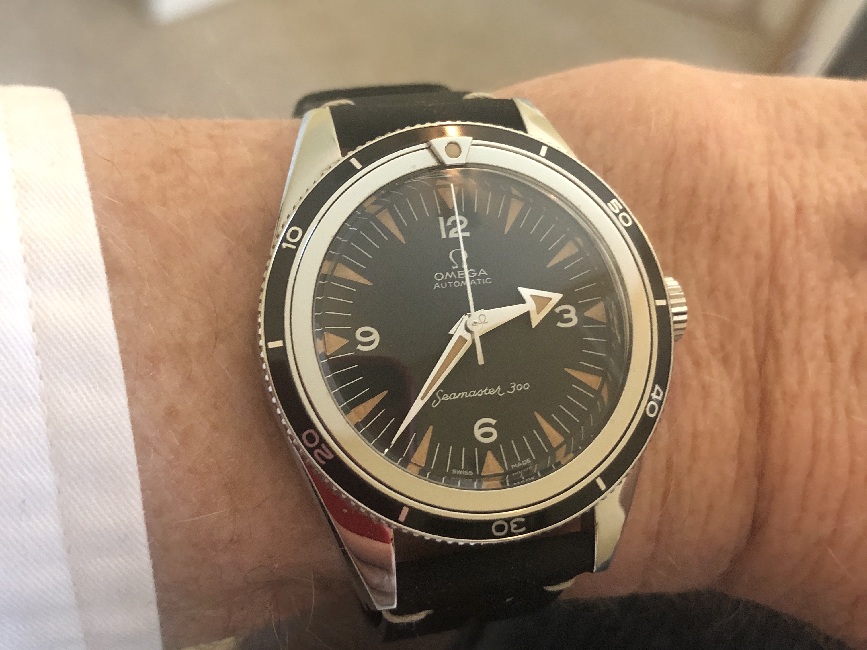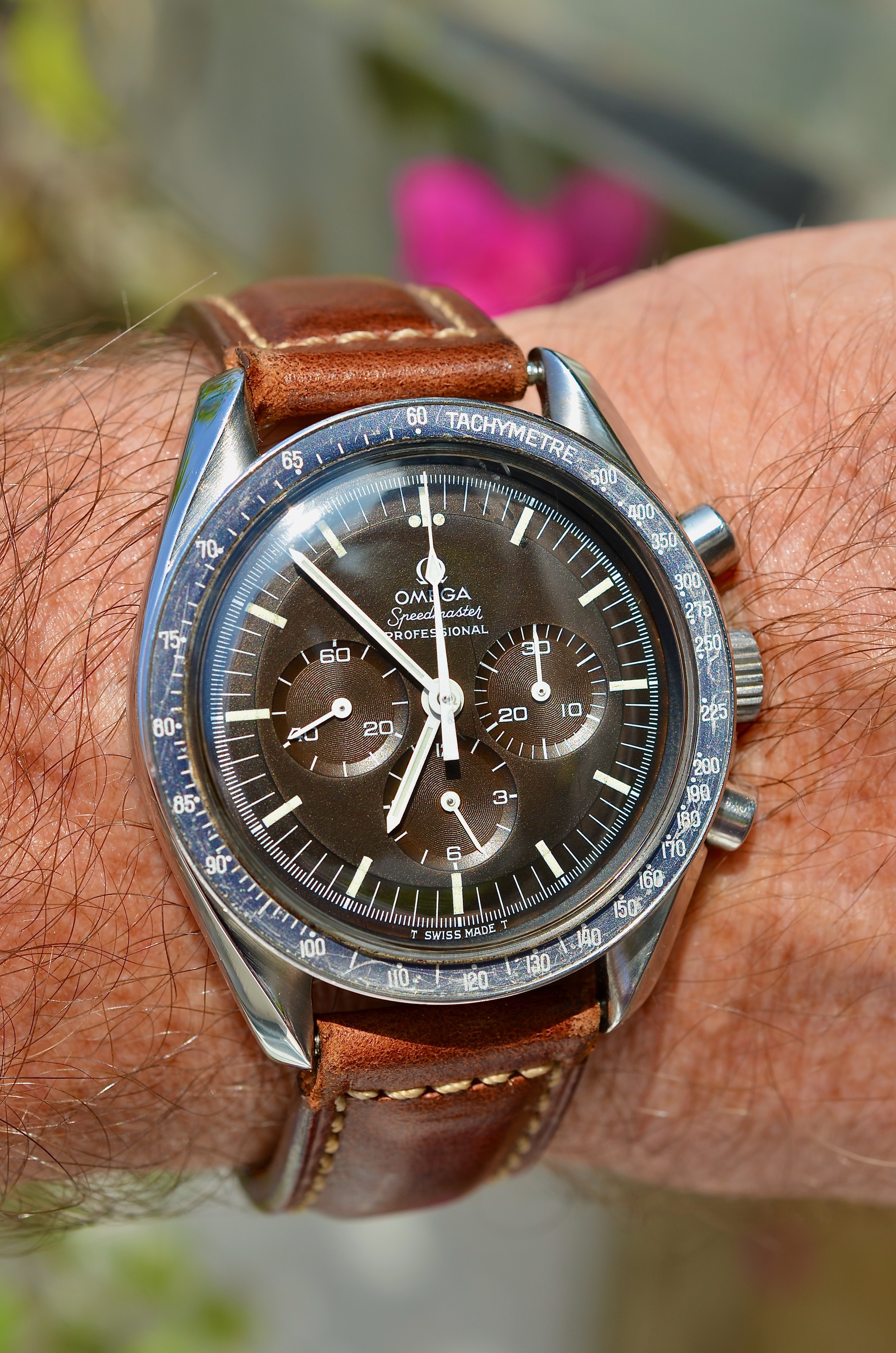 Same watch as yesterday, with a difference. In rummaging through my stash, looking for something else, what do I find but a steel bracelet with an Omega logo on the buckle! It is likely aftermarket because the buckle isn’t marked Omega anywhere else, other than on the buckle.