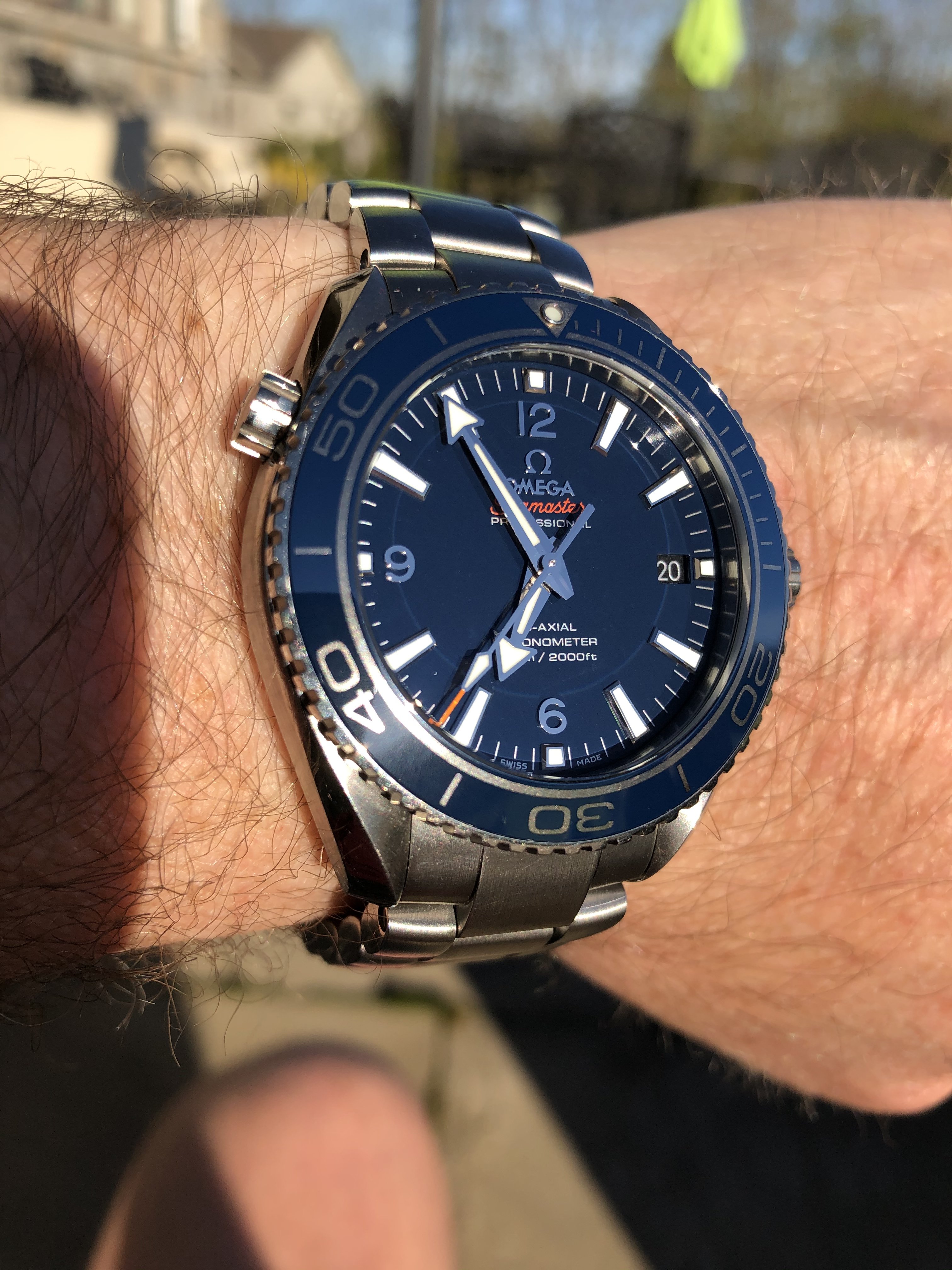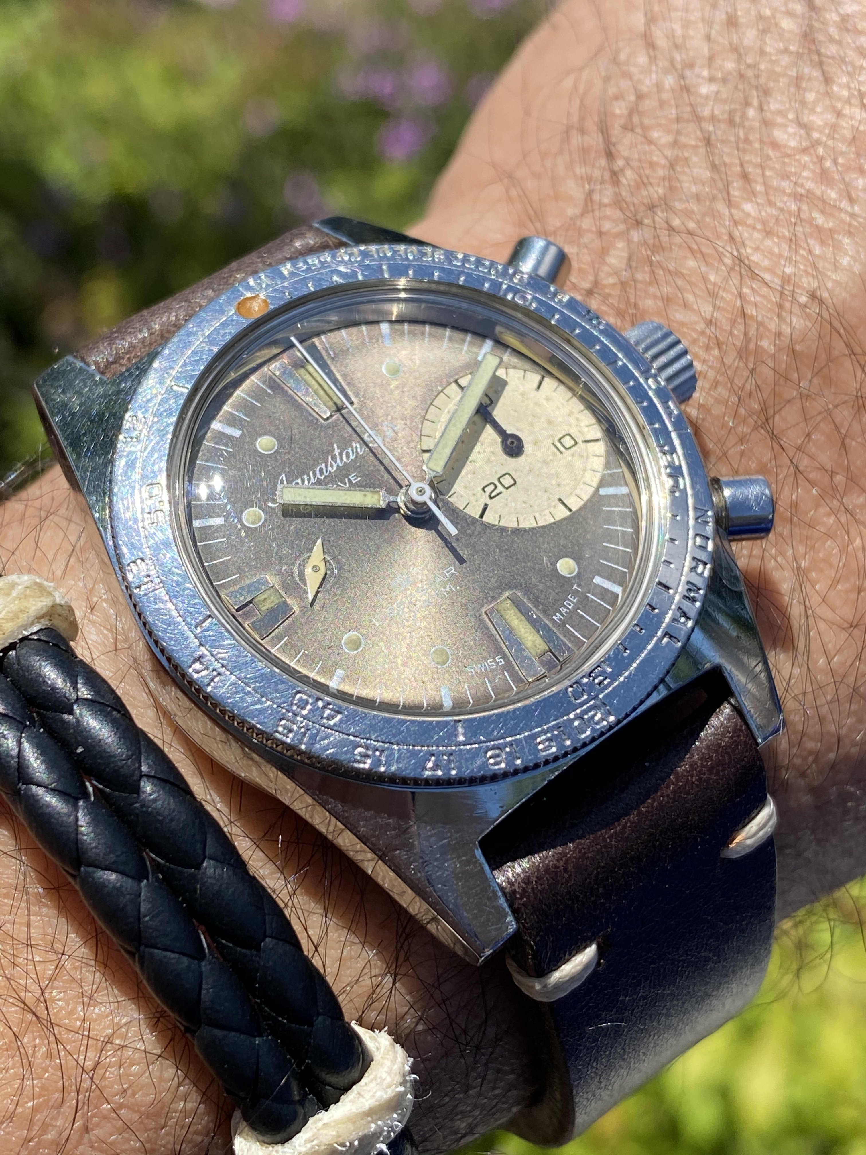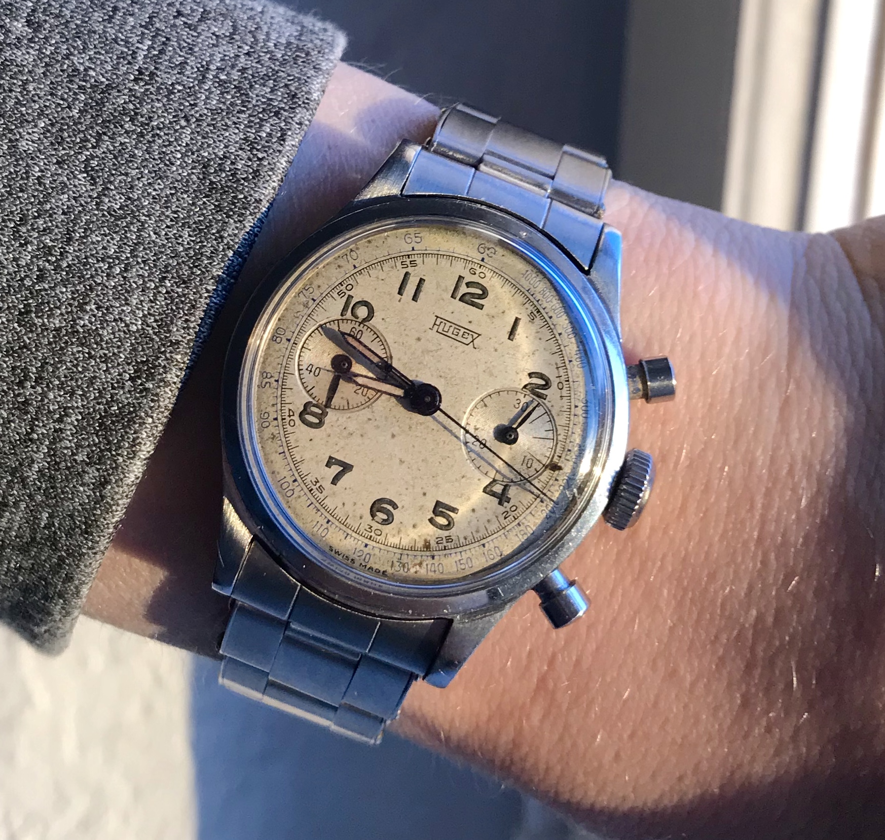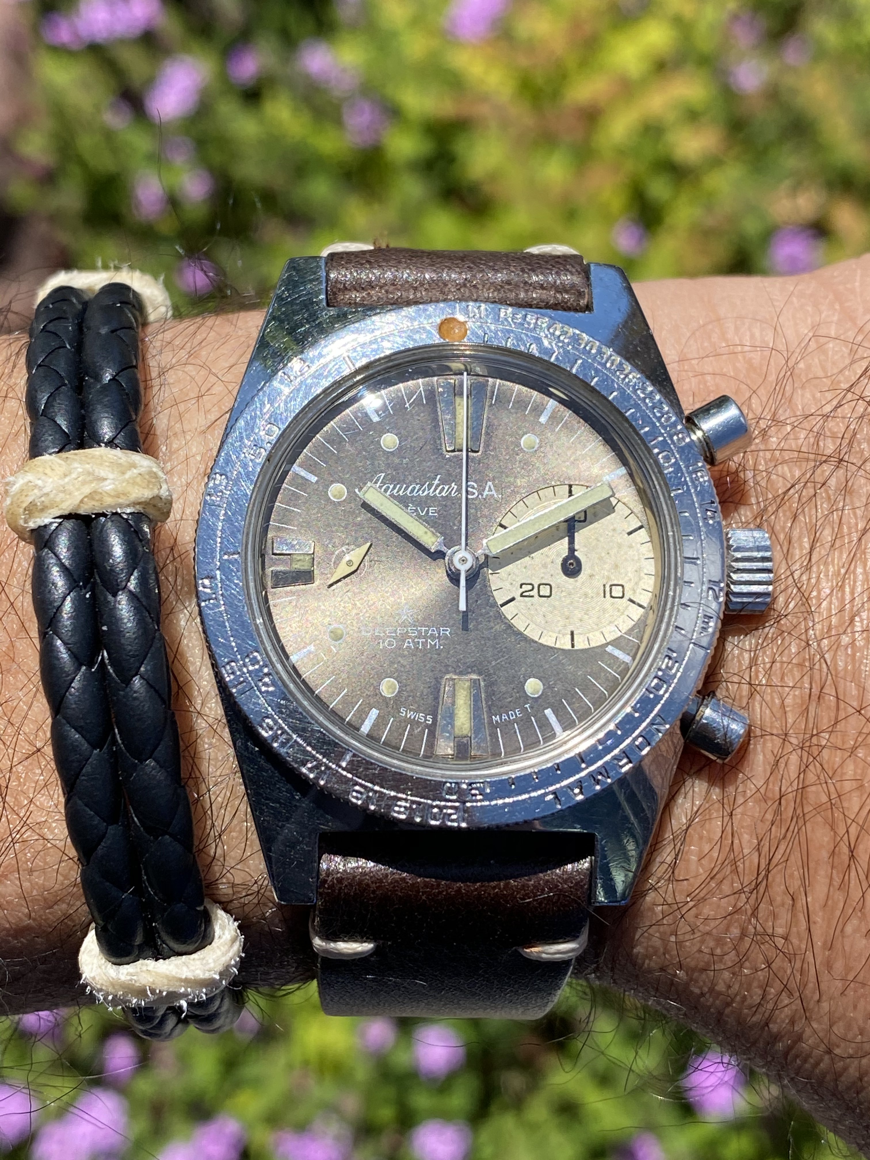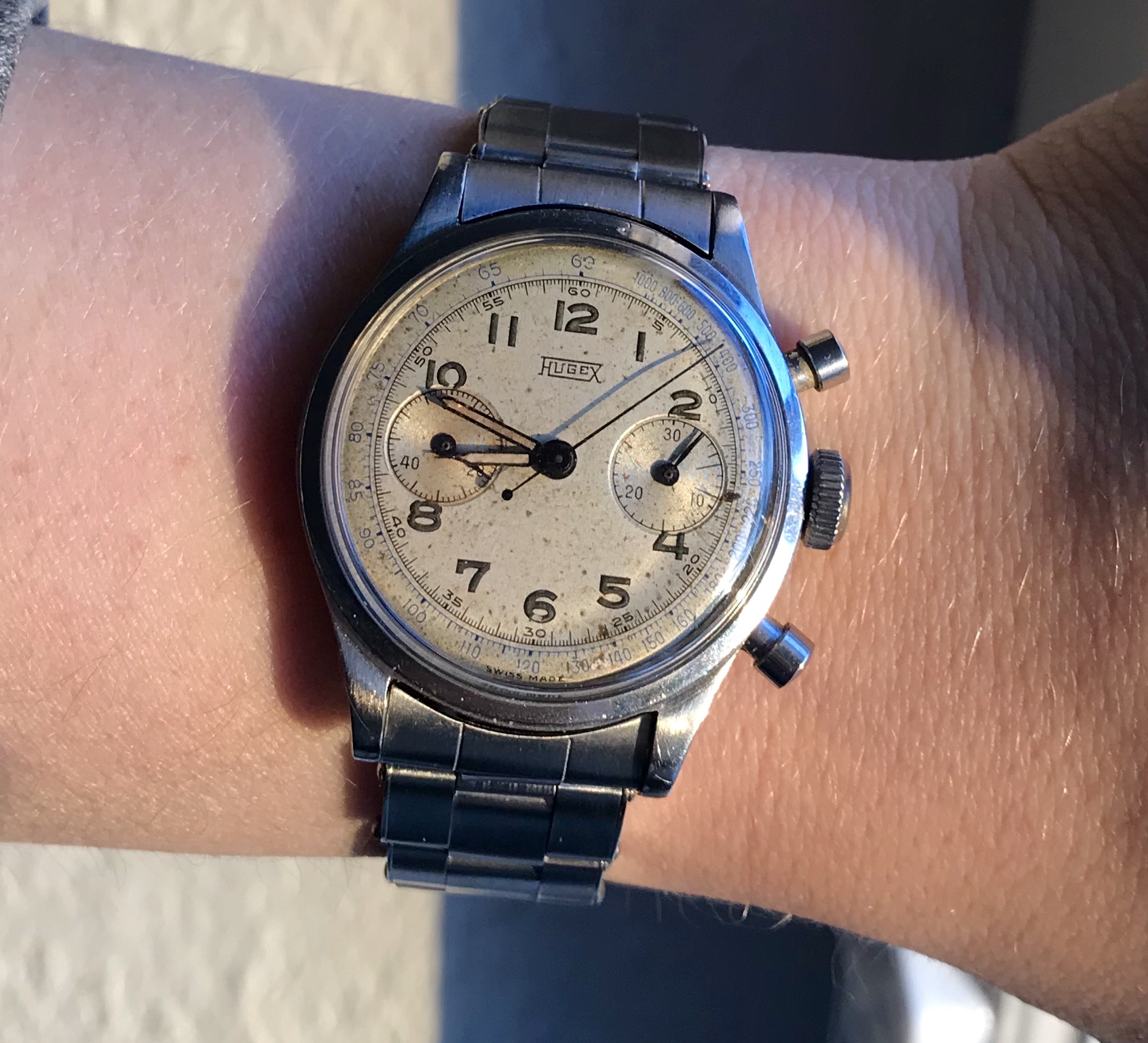 Same watch as yesterday, with a difference. In rummaging through my stash, looking for something else, what do I find but a steel bracelet with an Omega logo on the buckle! It is likely aftermarket because the buckle isn’t marked Omega anywhere else, other than on the buckle.