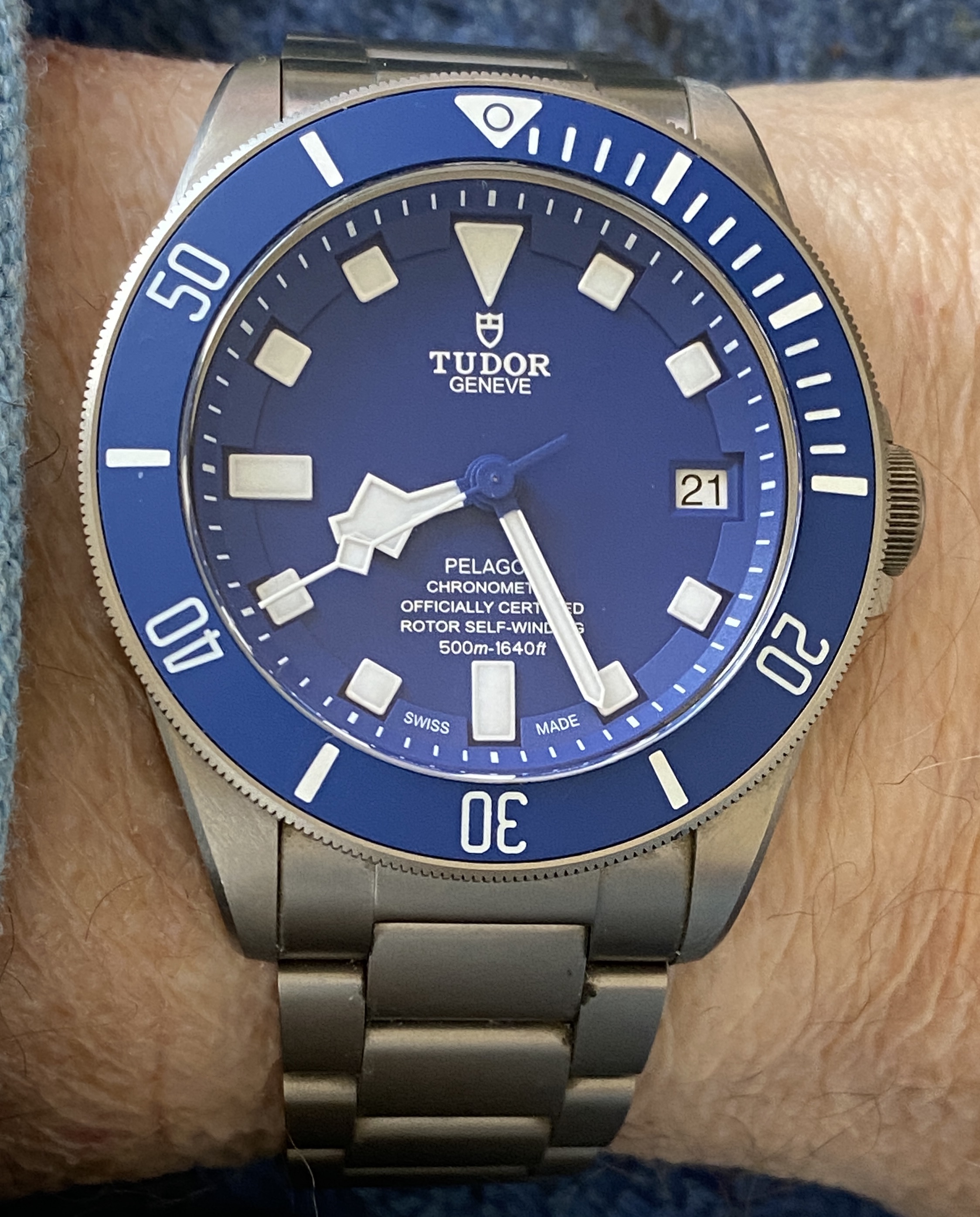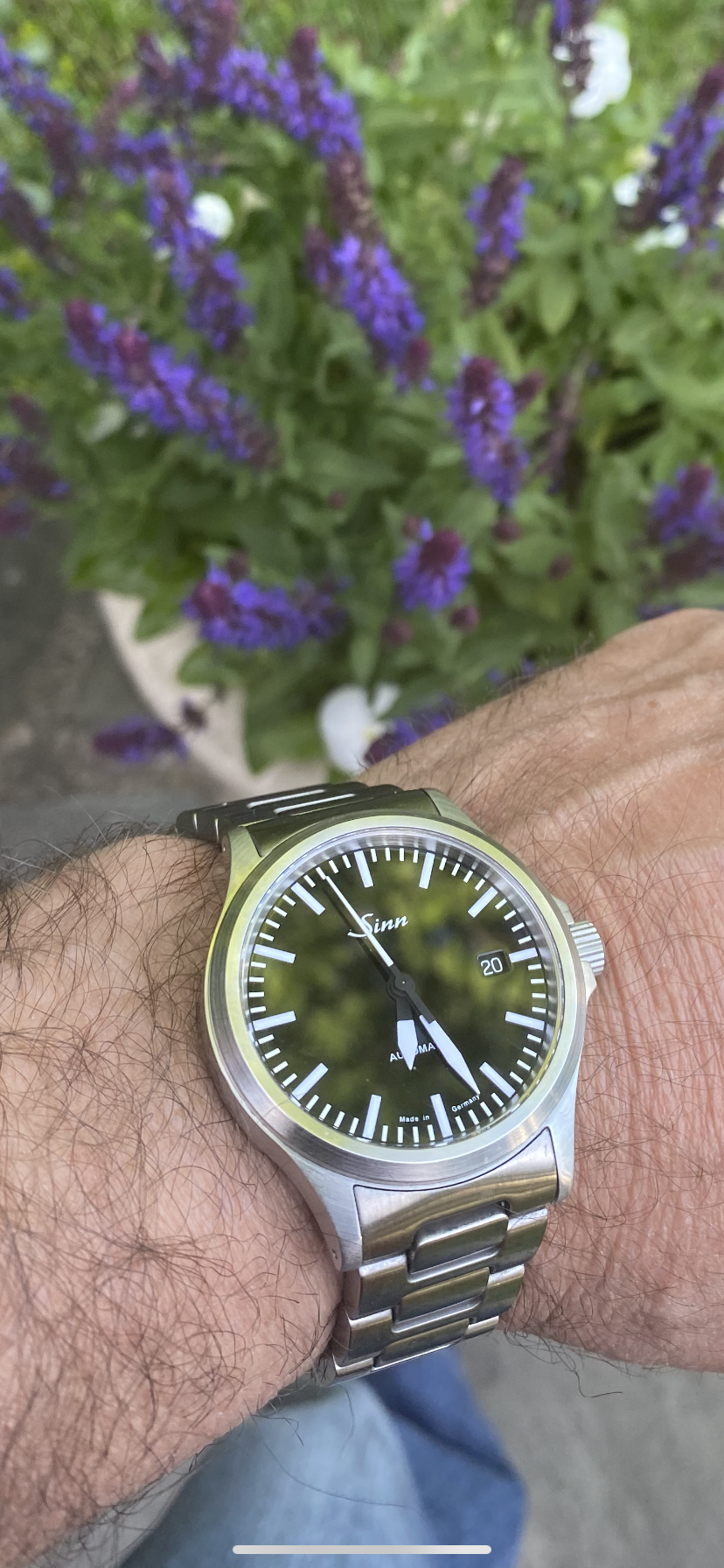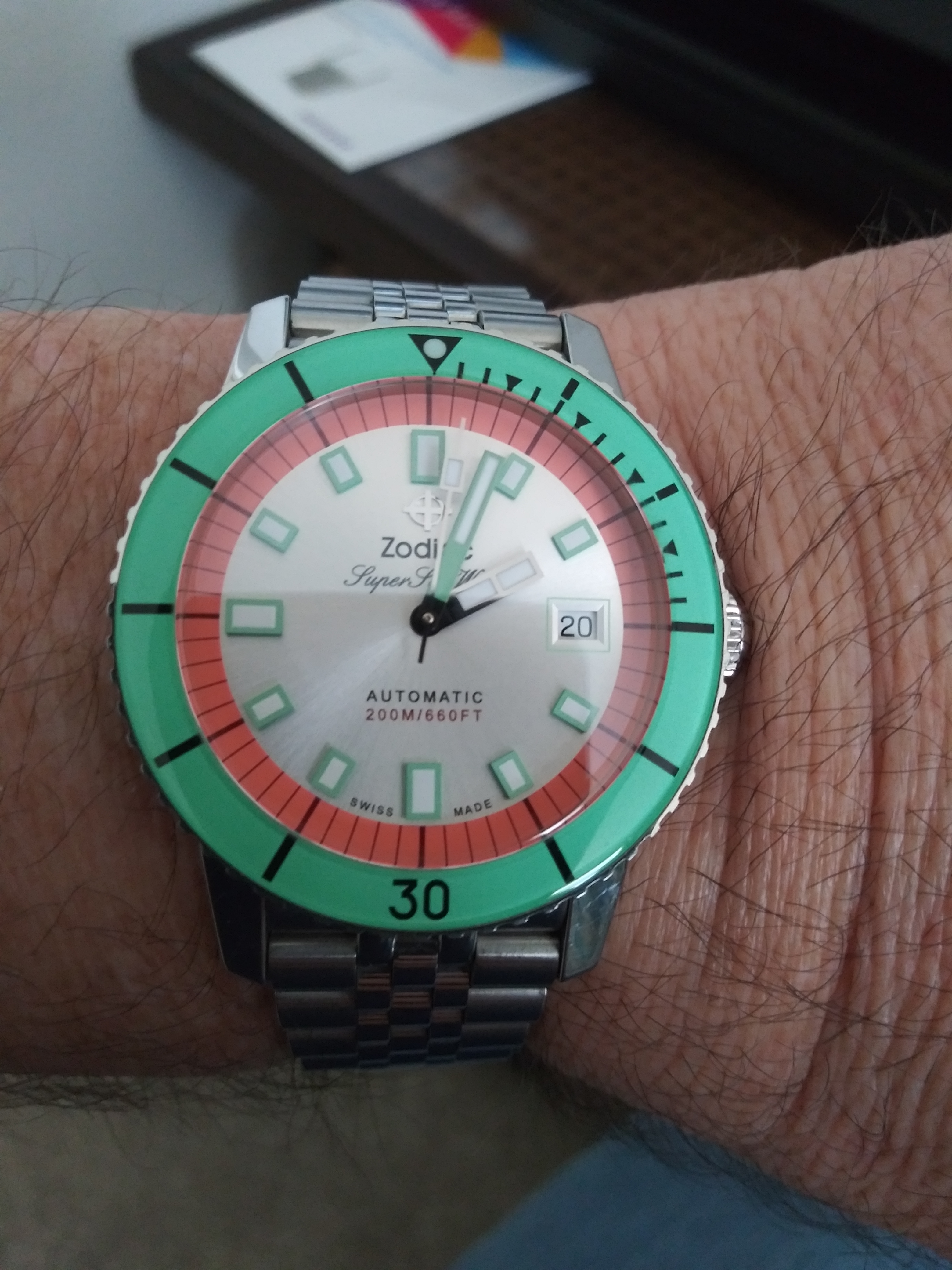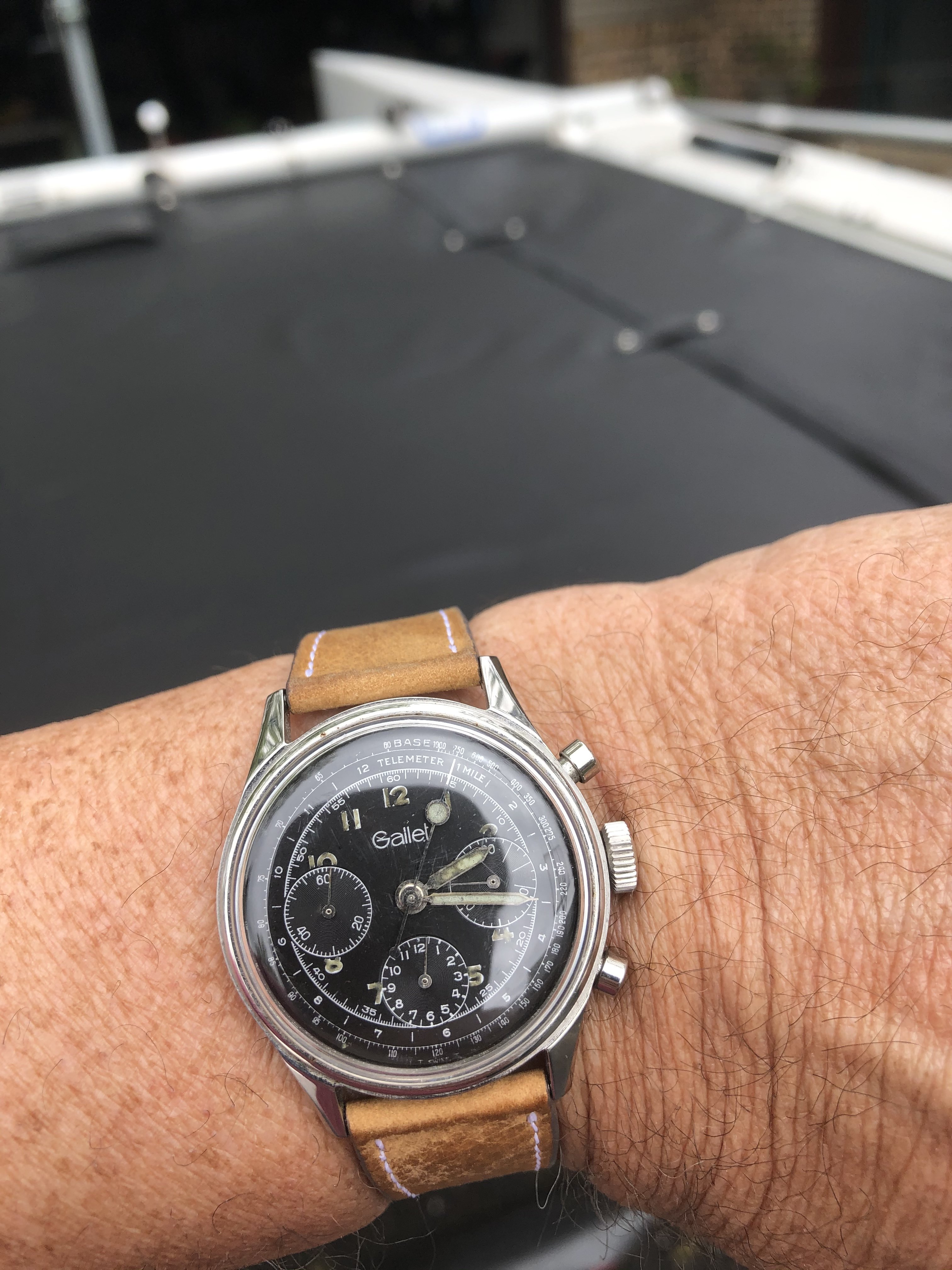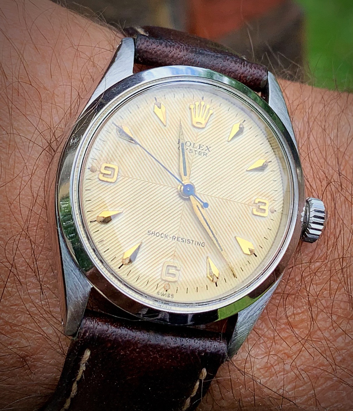 Same watch as yesterday, with a difference. In rummaging through my stash, looking for something else, what do I find but a steel bracelet with an Omega logo on the buckle! It is likely aftermarket because the buckle isn’t marked Omega anywhere else, other than on the buckle.