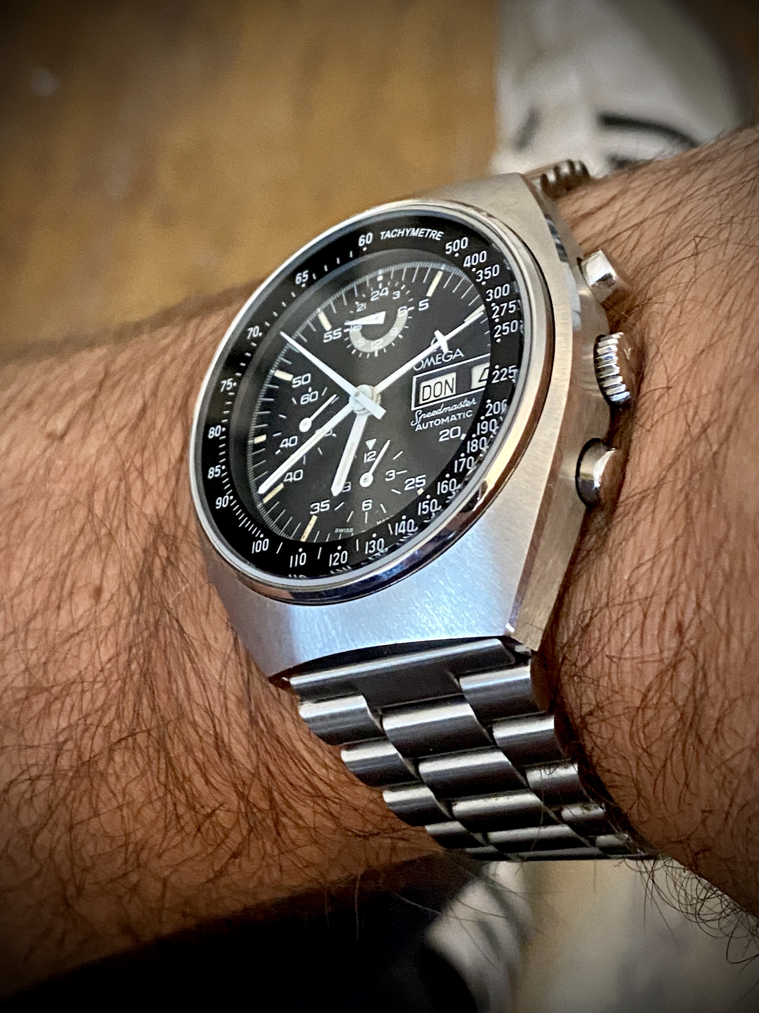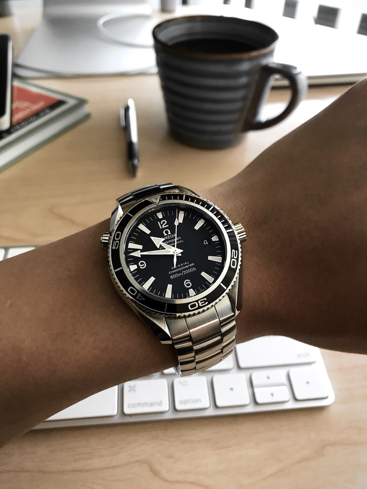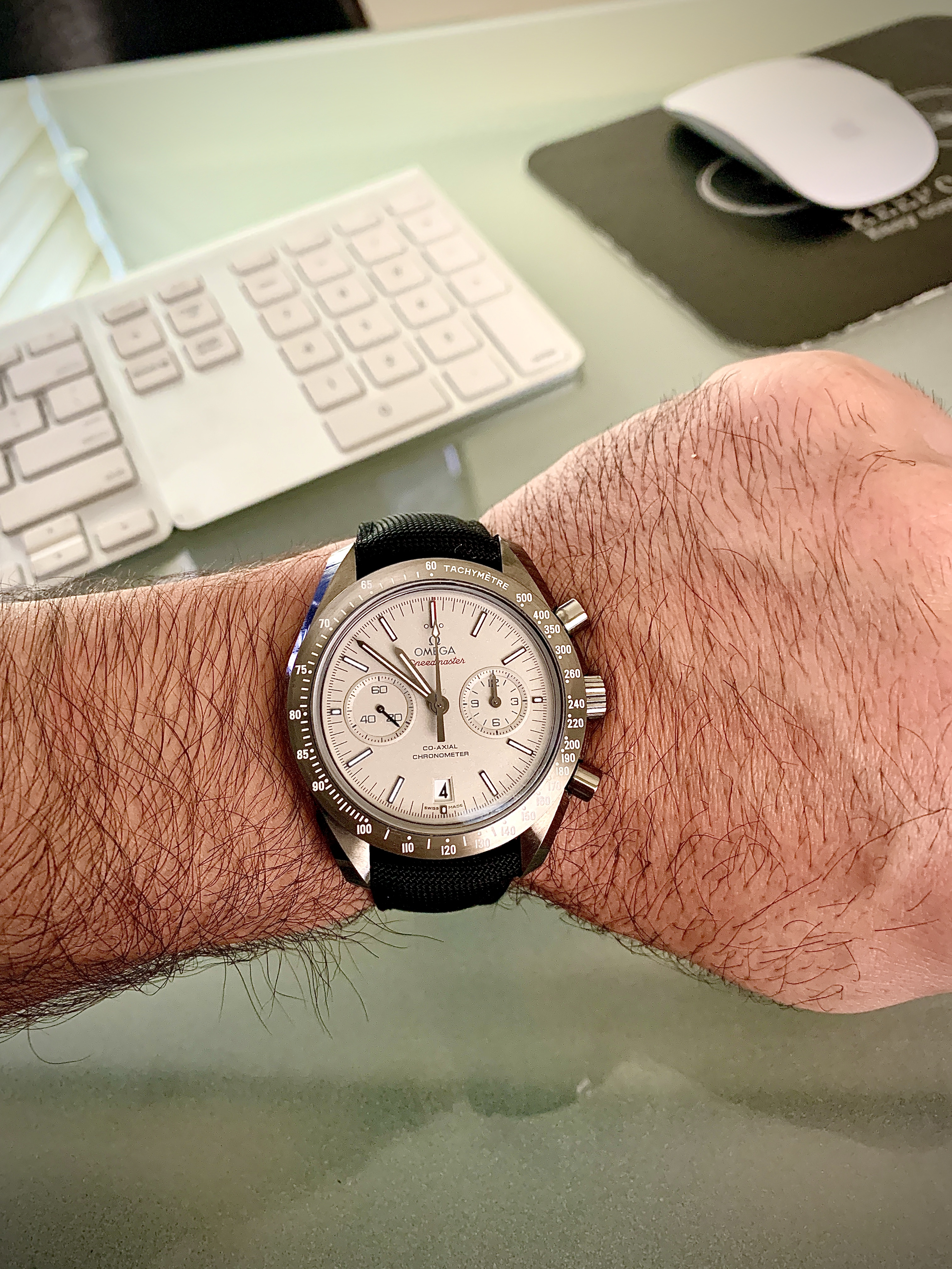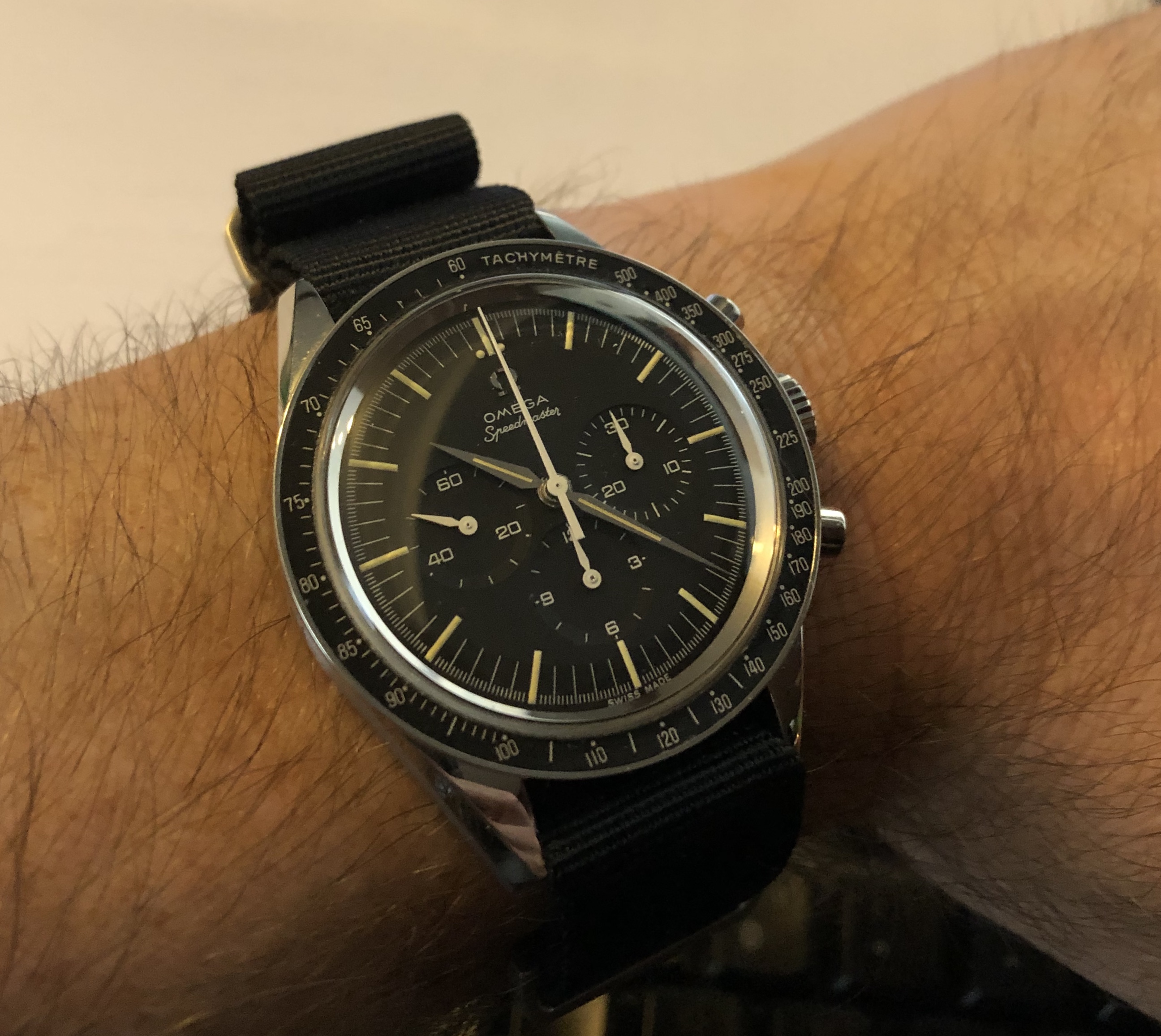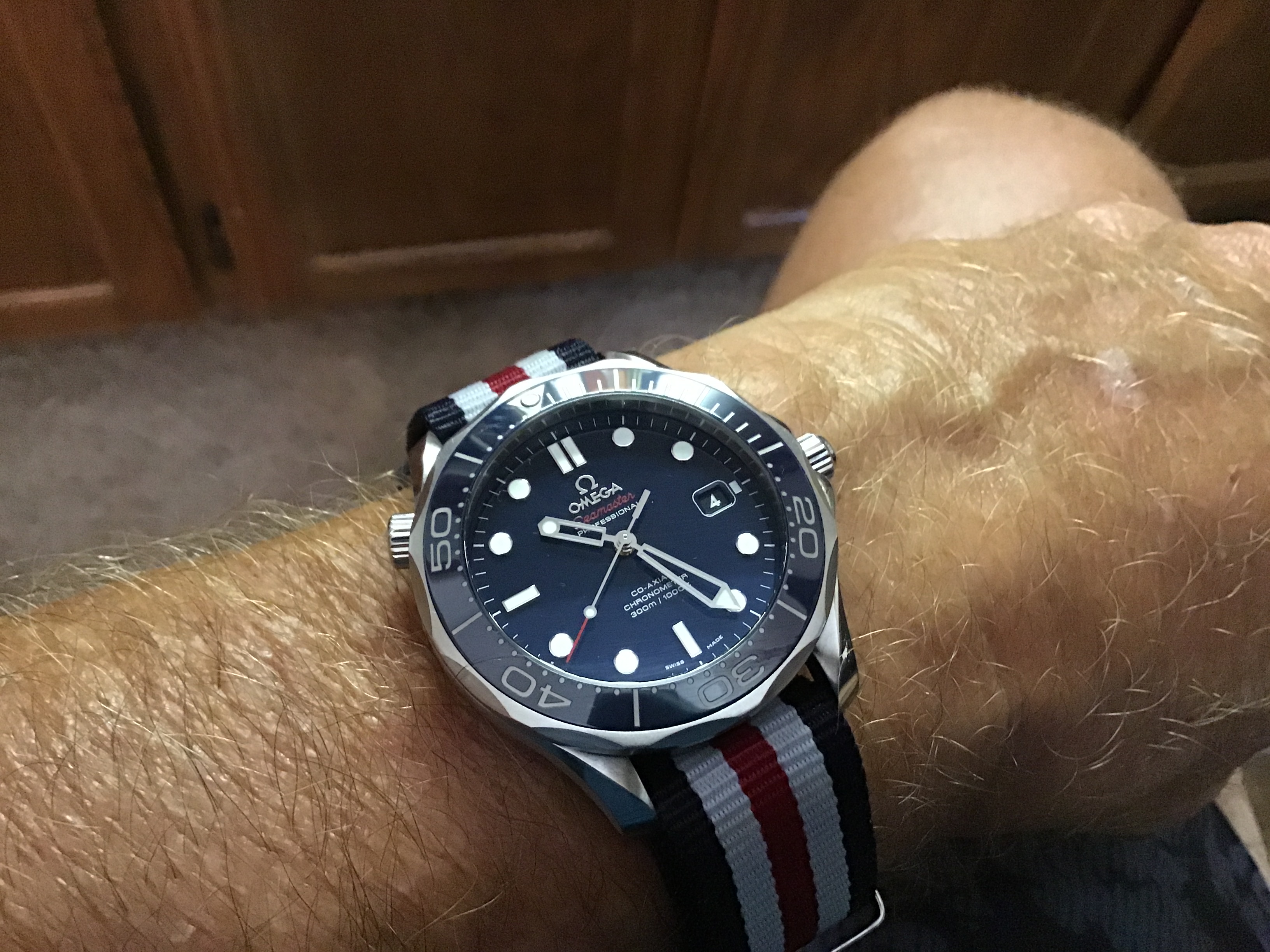 Since the weather has turned today, I'm taking it back indoors. Changed the omega Nato for a black Watchgecko Zuludiver. This one wears relatively thin on the wrist (as opposed to the higher quality Omega Nato). At 20mm a bit wide for this watch, but still fits nicely.