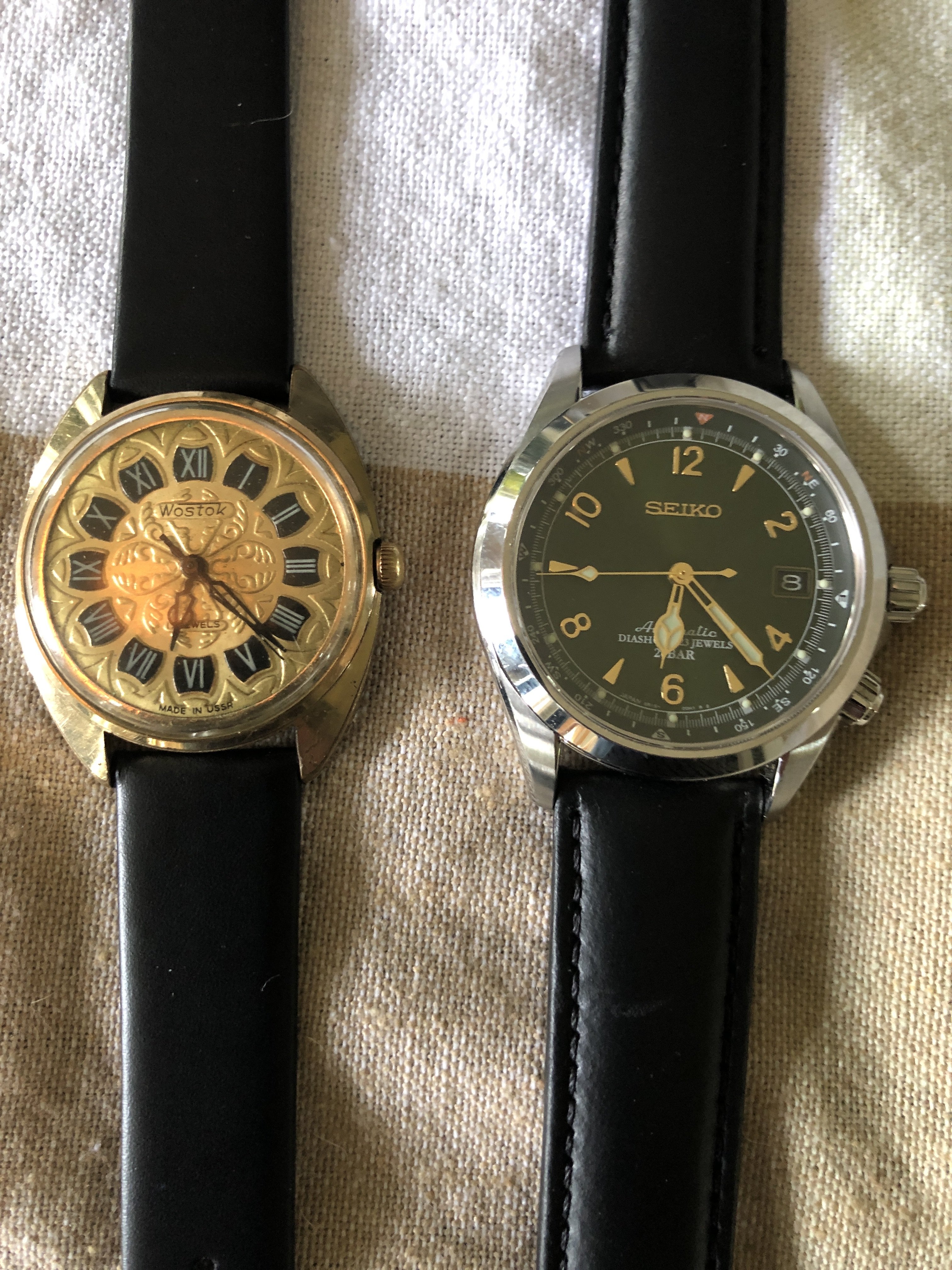 I just visited my watch maker store. He wasn’t in but his family members were. They seem a little gloomy I’m hoping business picks up for them. I picked up a couple cheap straps as it’s all he had in at the moment. I’m going to get something nicer for the alpanist eventually. I just felt compelled to spend something to support them a bit. These are two watches I picked up during the crisis. Pay particular note to the ugly vostok.