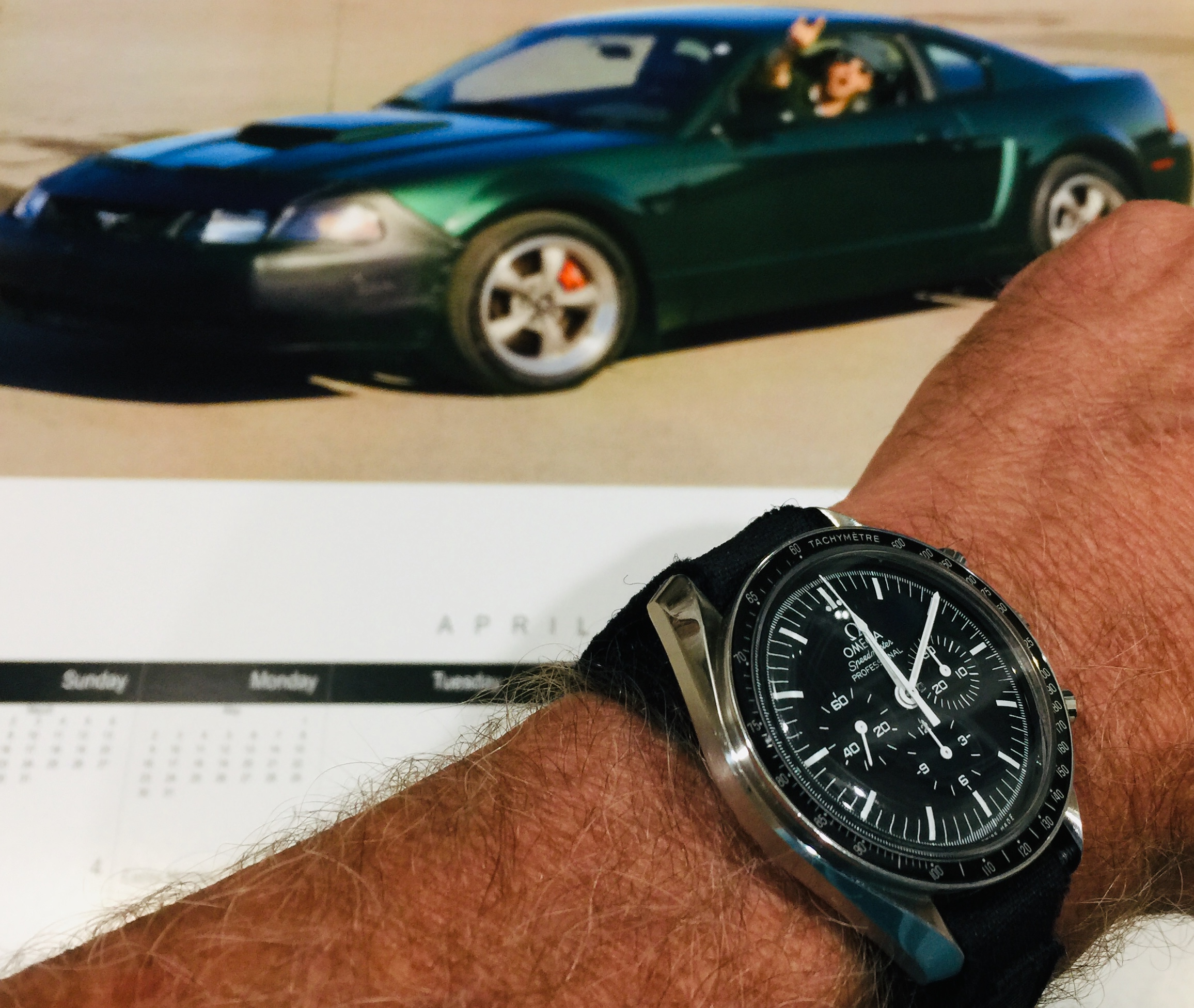 Yeppers...me thinks the wife unit [MacGyverette] is sort of ticked off right now...just got back from a cruise-in where I hung out with my Ford Mustang buddies...as well as Mopar people and GM people. Took my stock 2001 Mustang Bullitt GT and standard issue modern Speedy Gonzales Moonwatch on its original Omega replica NASA strap...