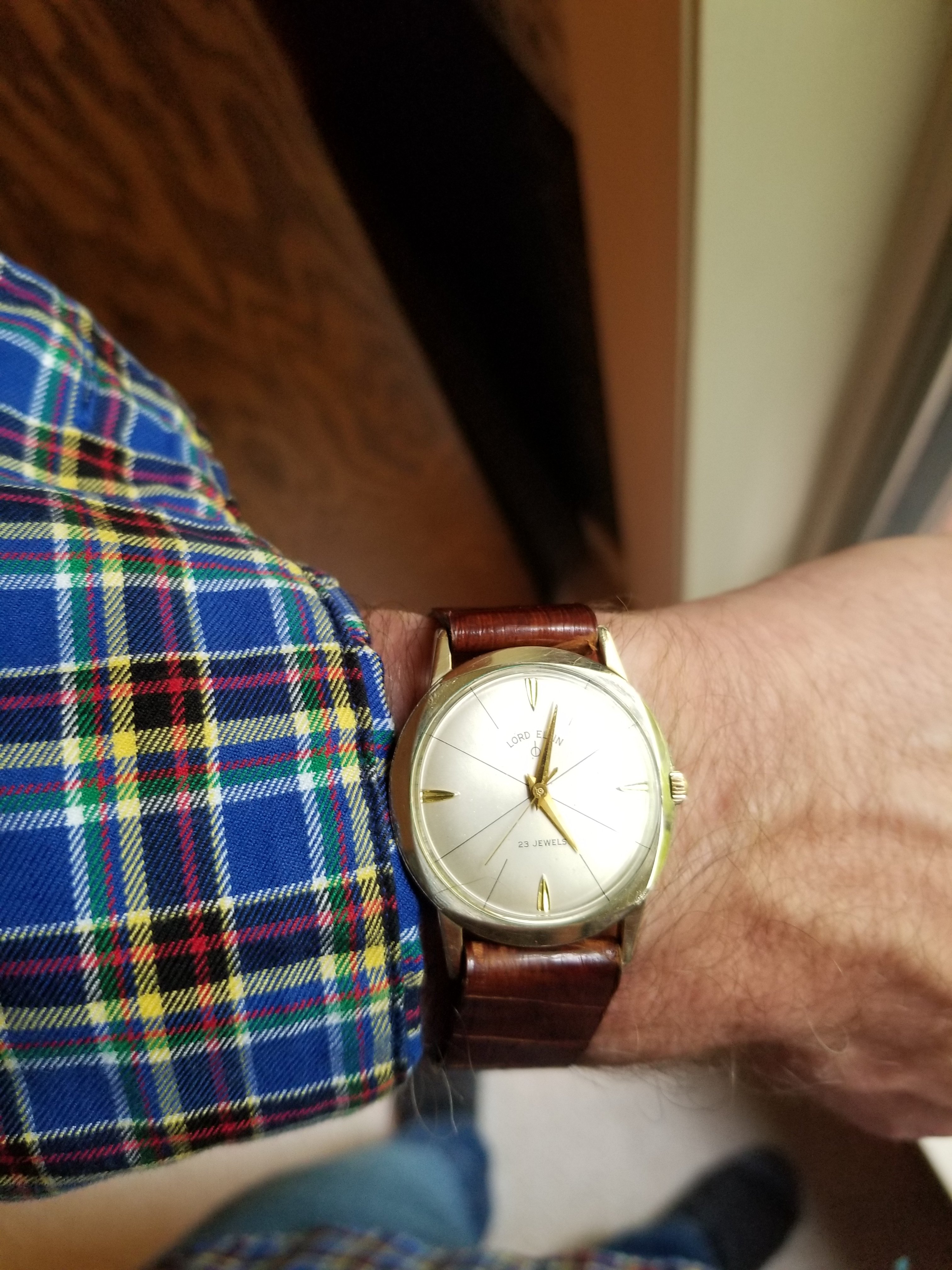 It is cool here in New England this evening and I went and put this long sleeve shirt on.....as soon as I did I knew which watch I had to switch to. I thought I had left gold toned watches behind for SS sports watches and chronographs, but for some reason this little 32mm Lord Elgin has been getting a lot of wear lately. It's actually like wearing nothing at all.