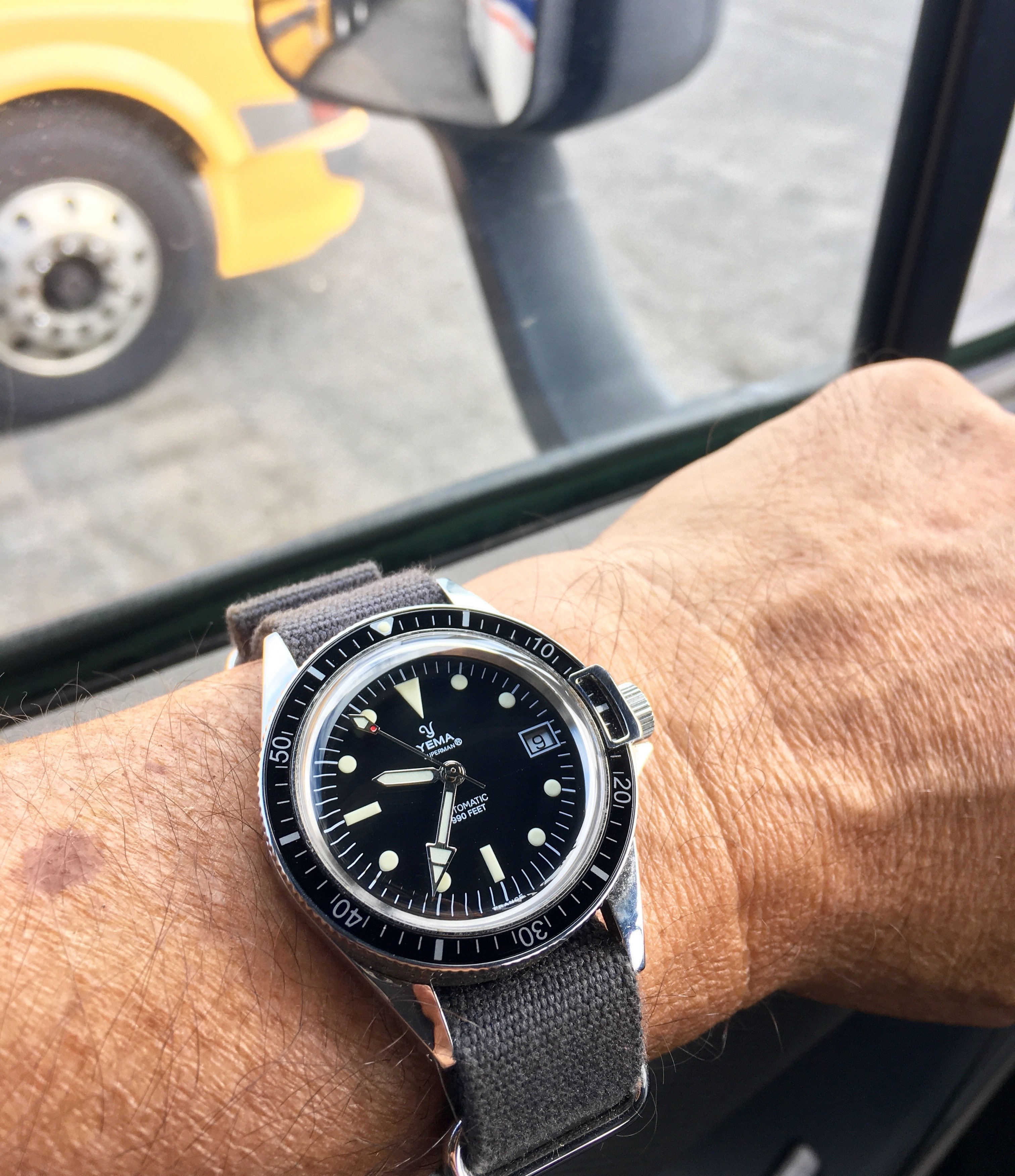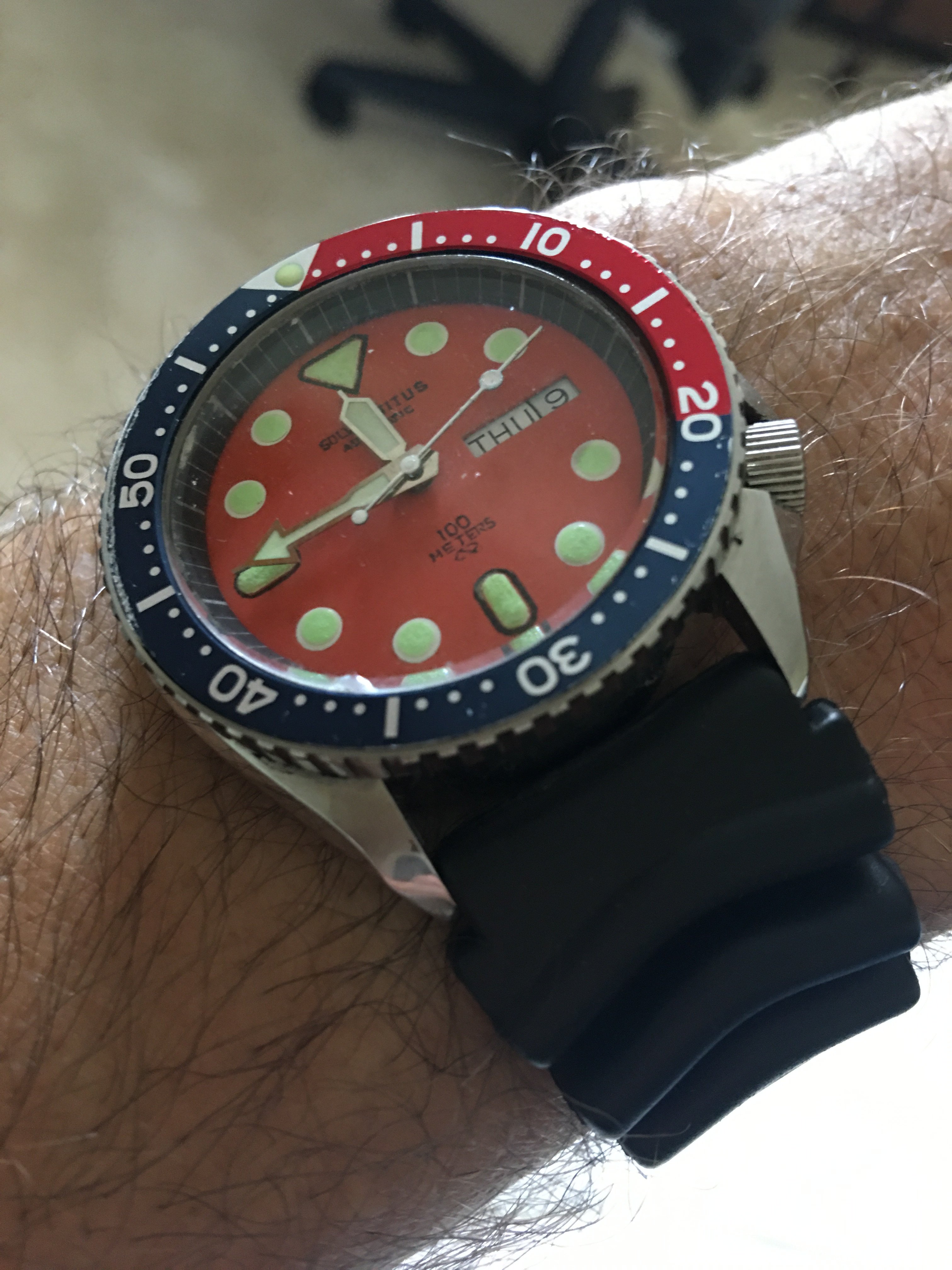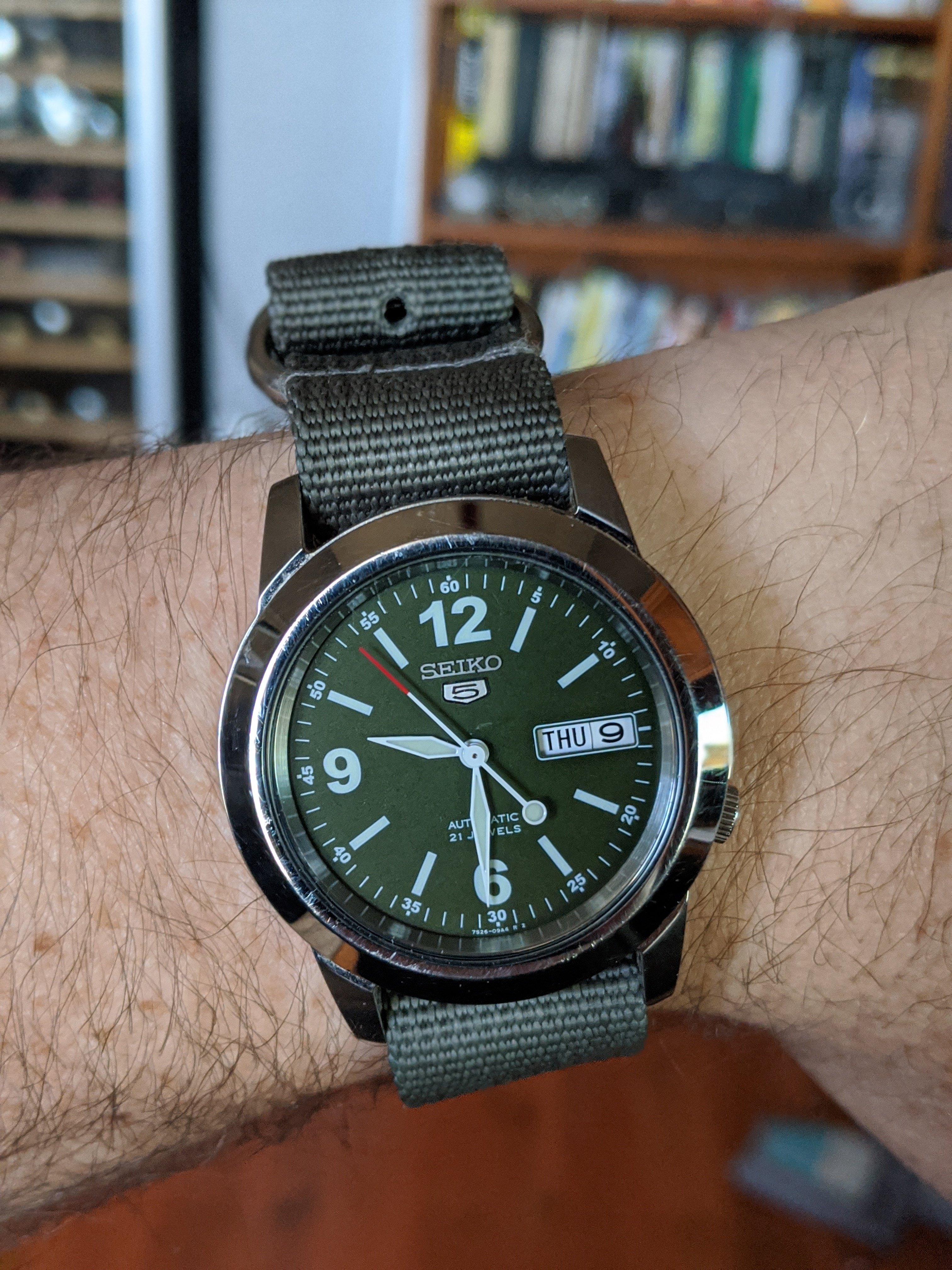 This was my first automatic/mechanical watch and I've not worn it in over a decade. I pulled the rattly and cheap seiko 5 bracelet off of it for the first time last night, and put it on this Zulu strap I had laying around. It is vastly improved I think!
