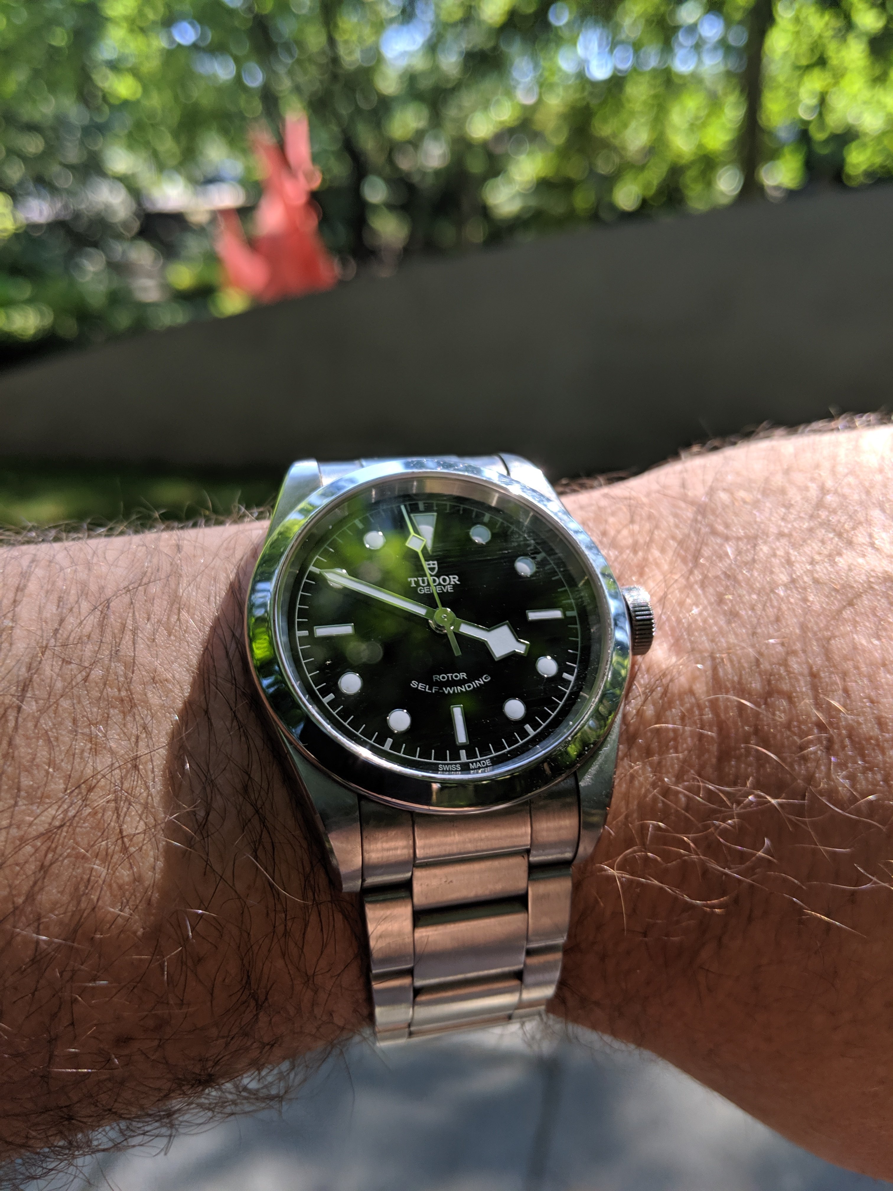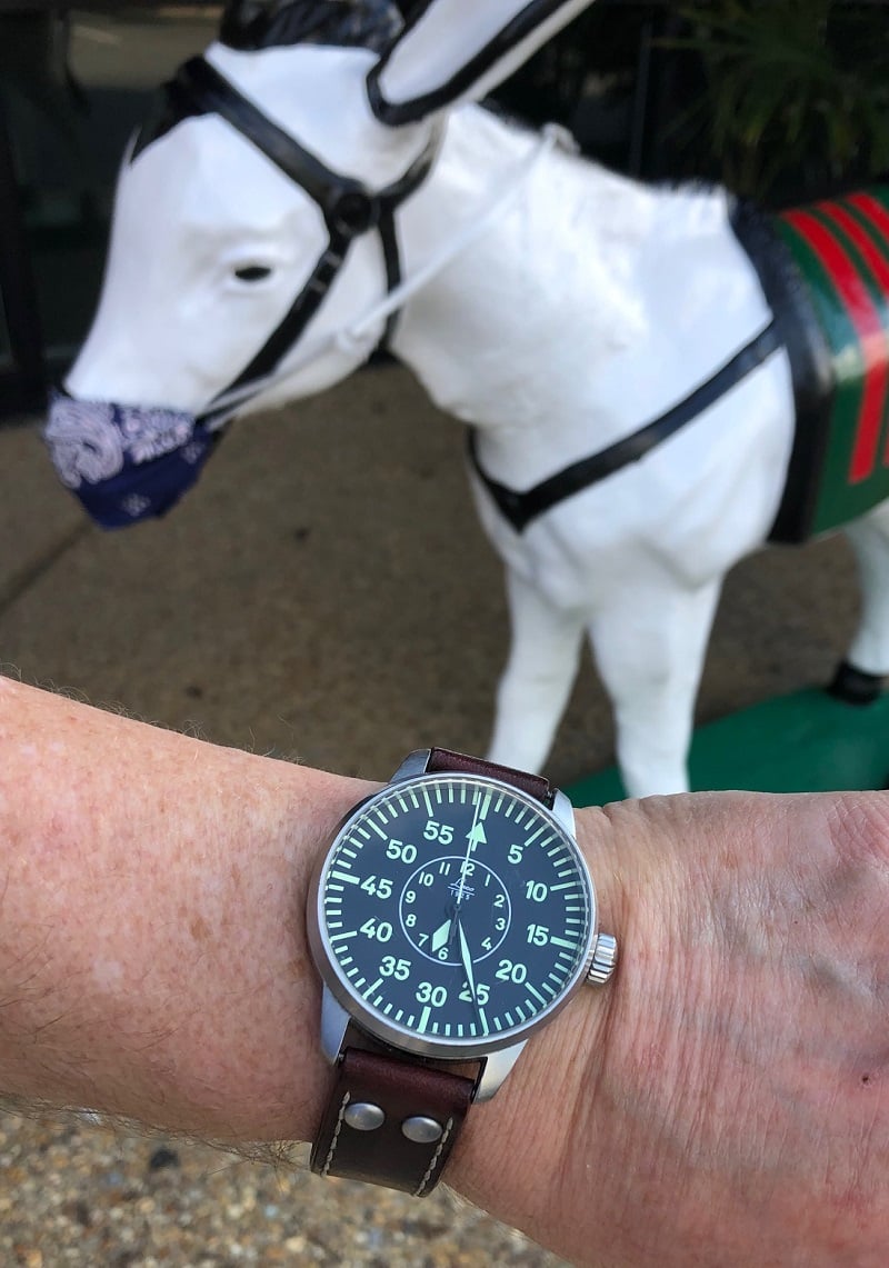 Picture of my Laco Type B pilot watch in front of a donkey statue.