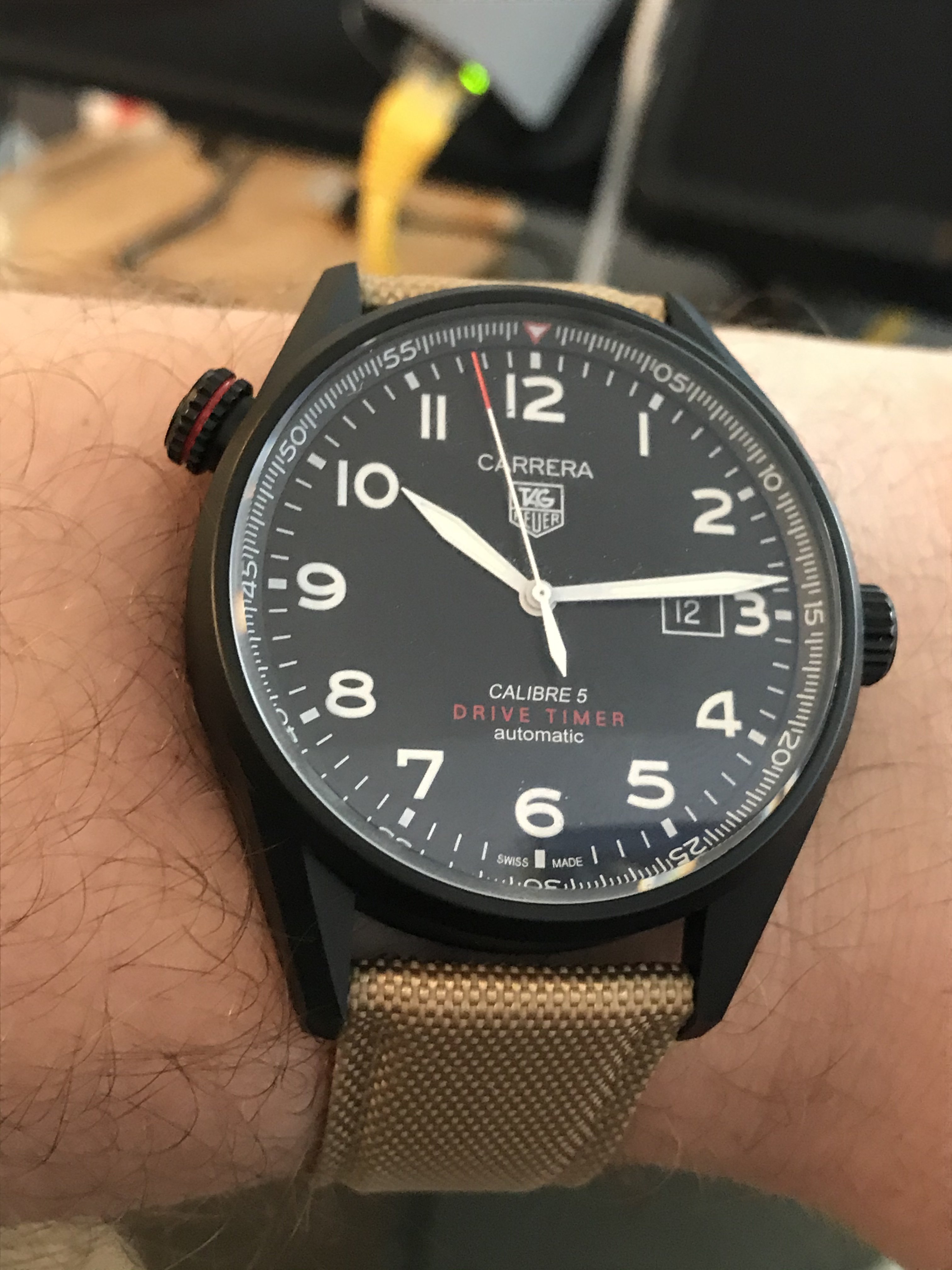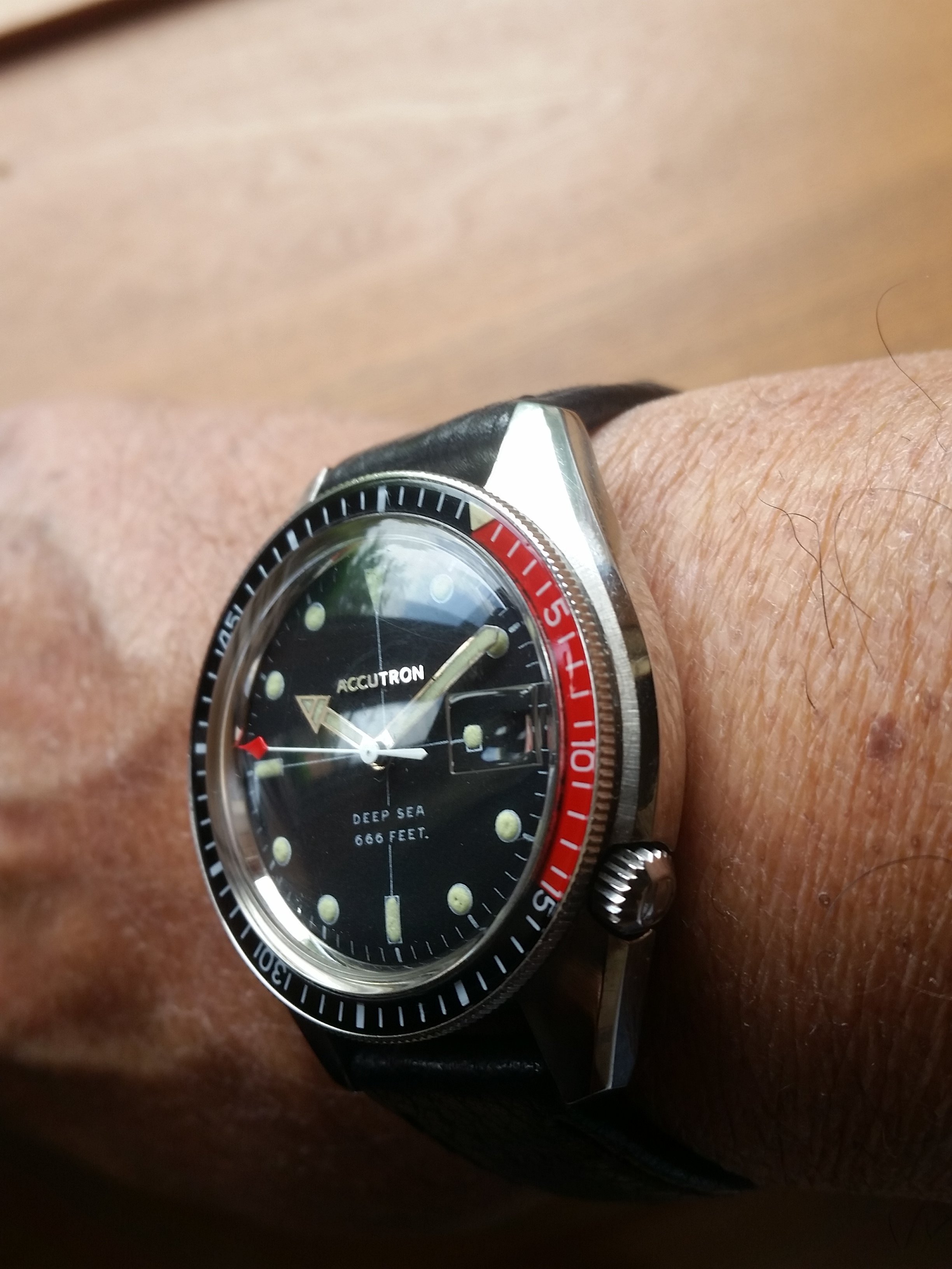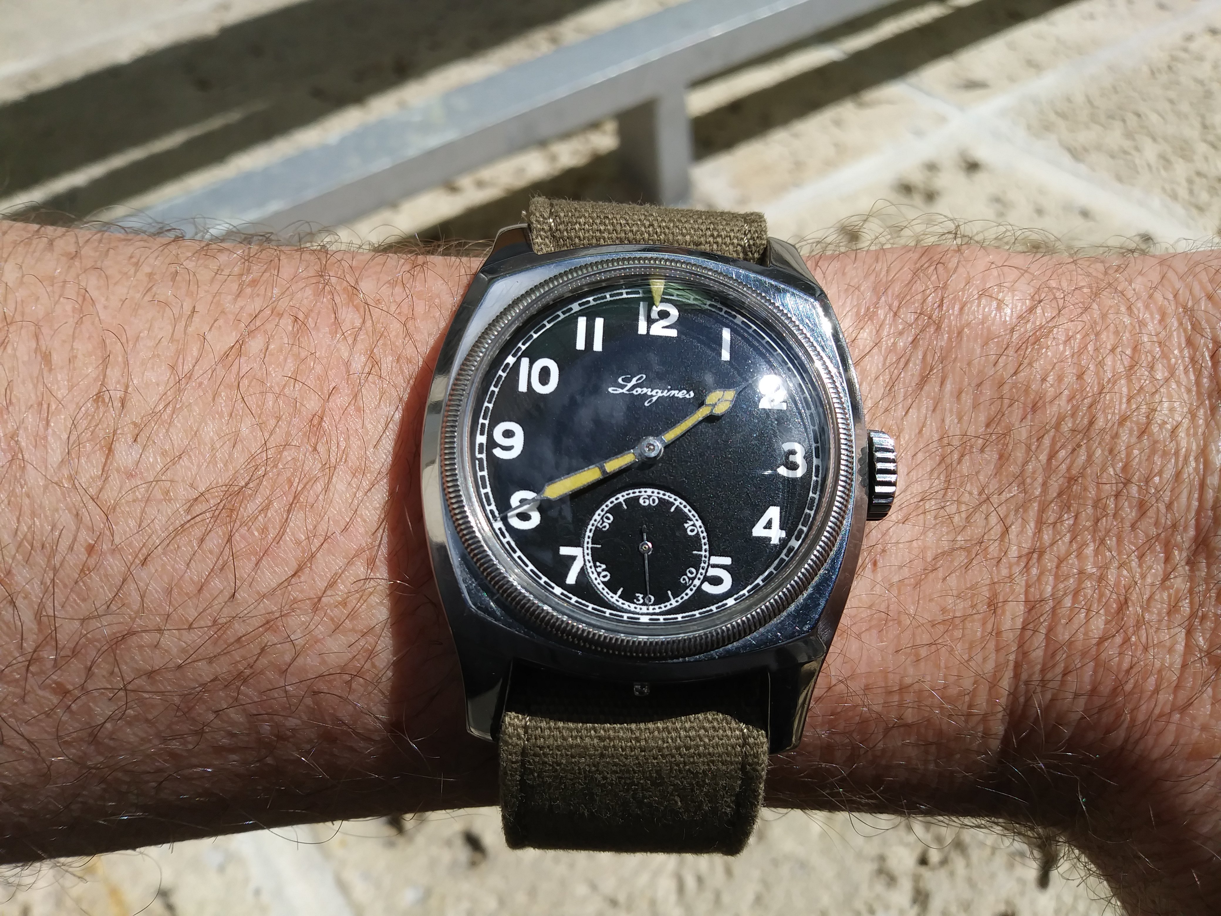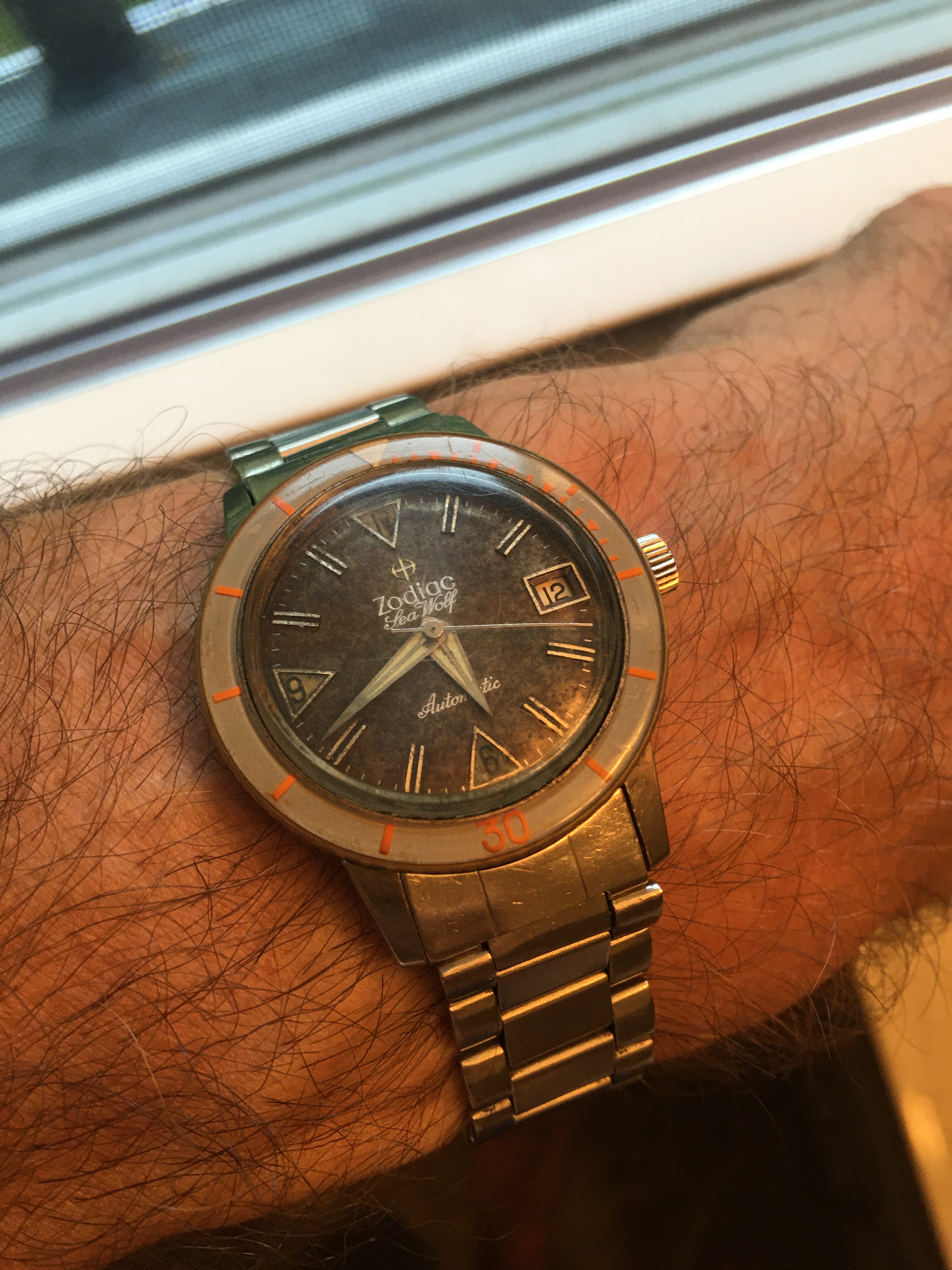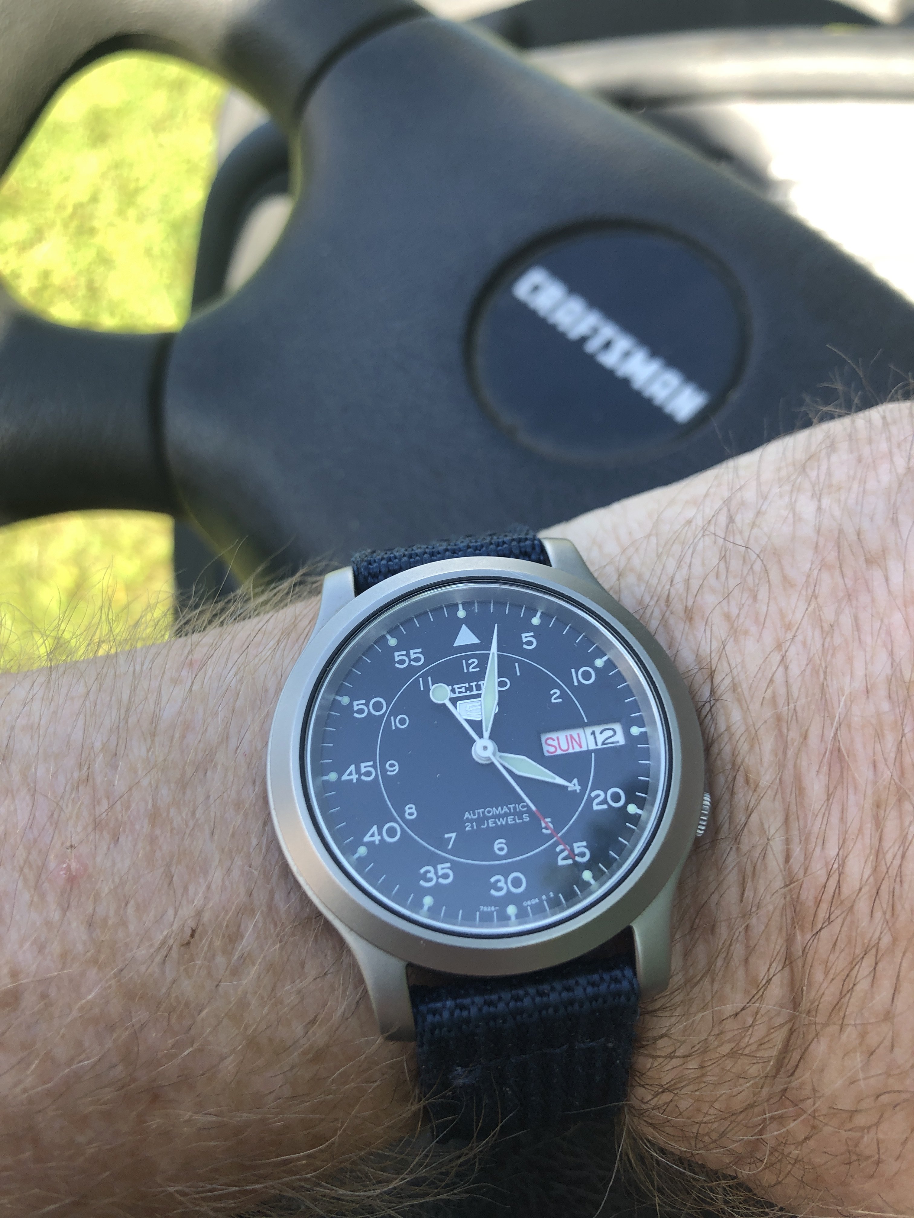 I recieved this watch 1 yr ago today. My wife calls it my "Holiday watch", because I wired out the money on my maternal Grandfather's birthday, it hit the U.S. on my wife's birthday and it arrived at our home on July 12th, our Anniversary. So, today, more importantly, is my 34th wedding anniversary. My wife will accept any and all condolences you fellow watch addicts wish to extend her. LOL. This is an old pic, as I am at work, doing manual labor and I won't actually wear it until I am home and maybe take the lil lady out for a well deserved dinner.