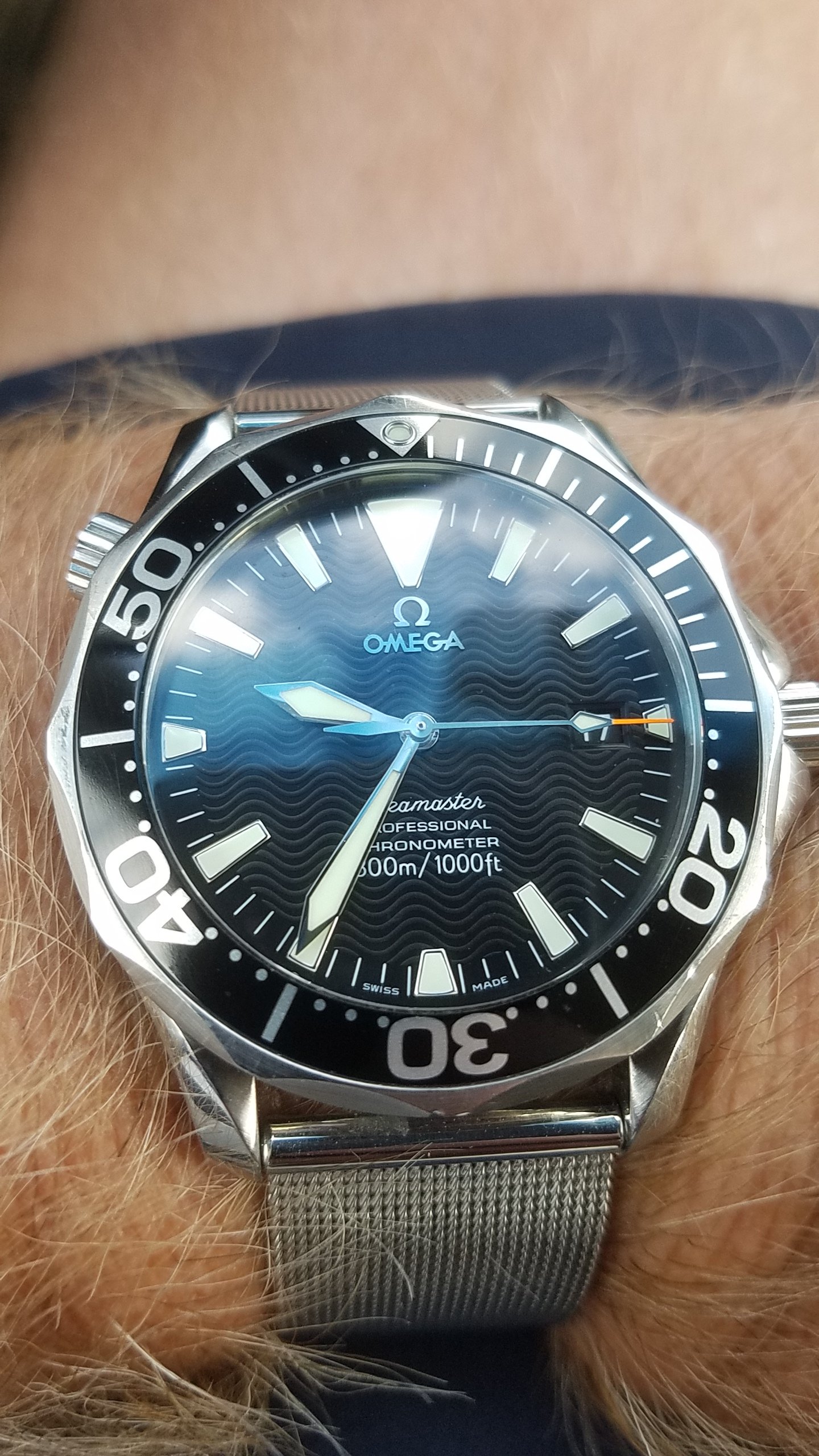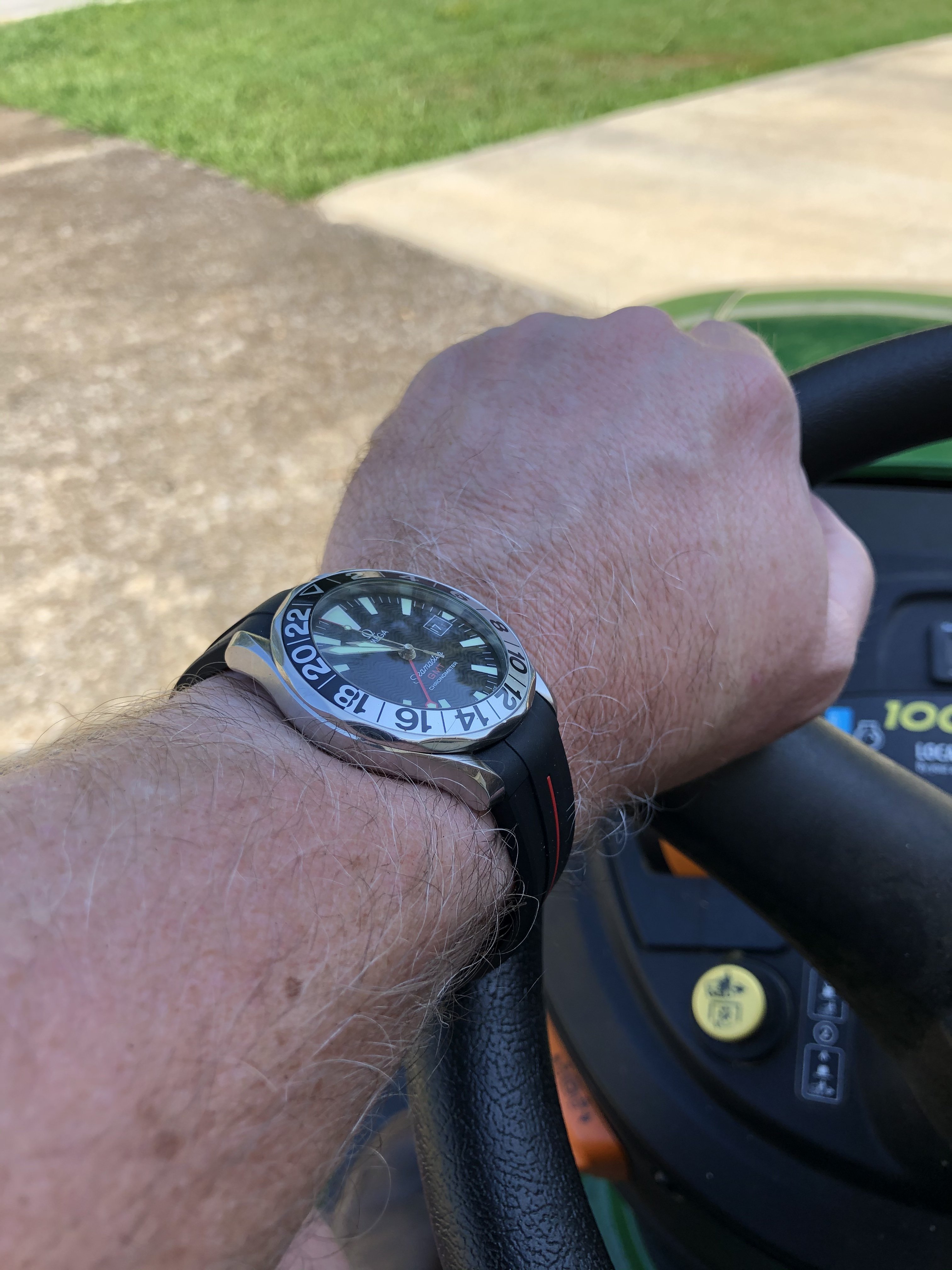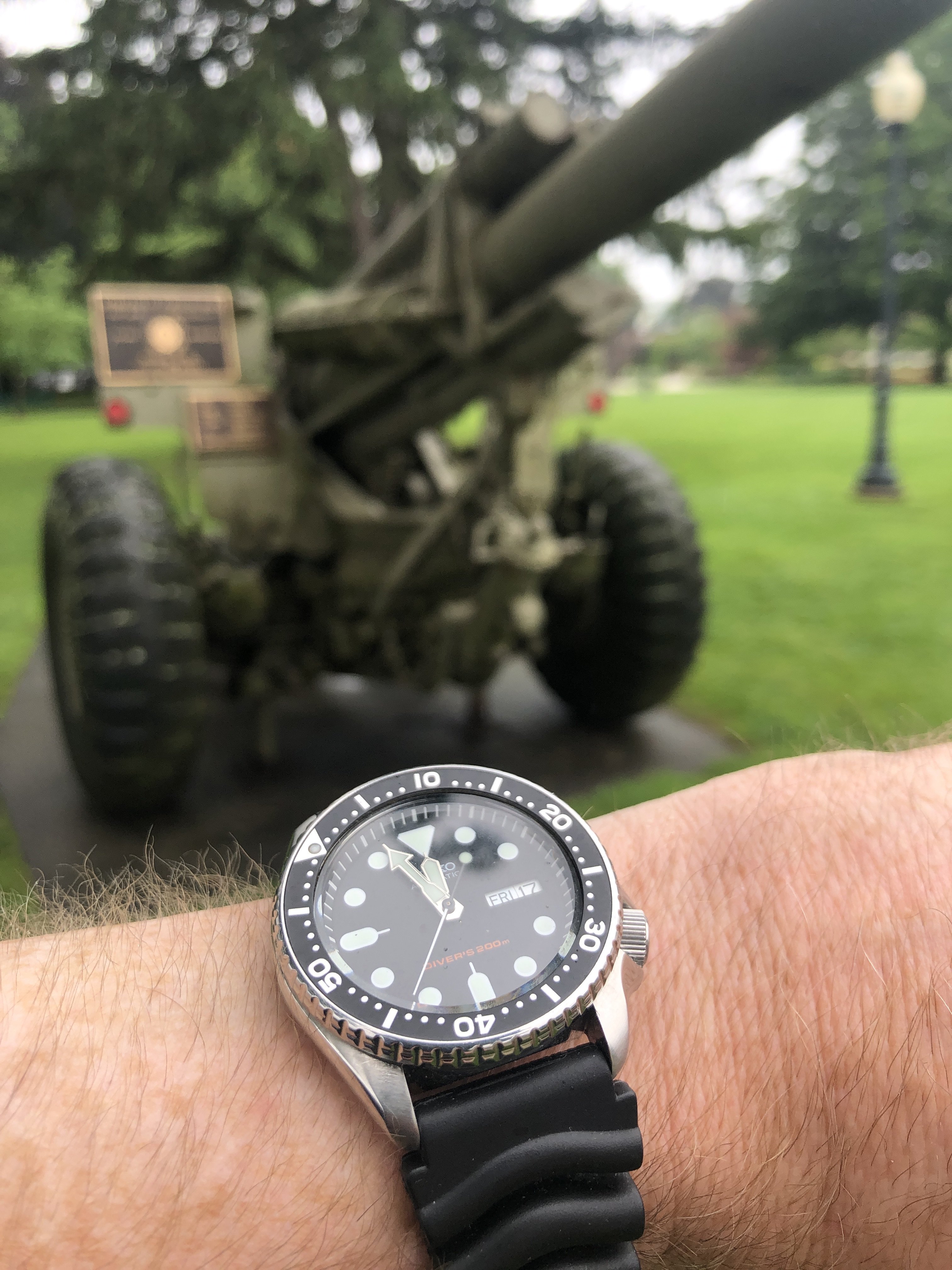 @allwoundup, Love this diver! The dial is a perfect black, the lume a beautiful color and looks to be all there. I bet it is not one of those modern, hulking dive watches of 44mm that just is way too, too much for my just under 7 inch wrist. I know a lot of people will say the day and date features "ruin" the look, but I like the placement. And the hands look very legible and I bet it was affordable besides. Great watch and I just had to say so.